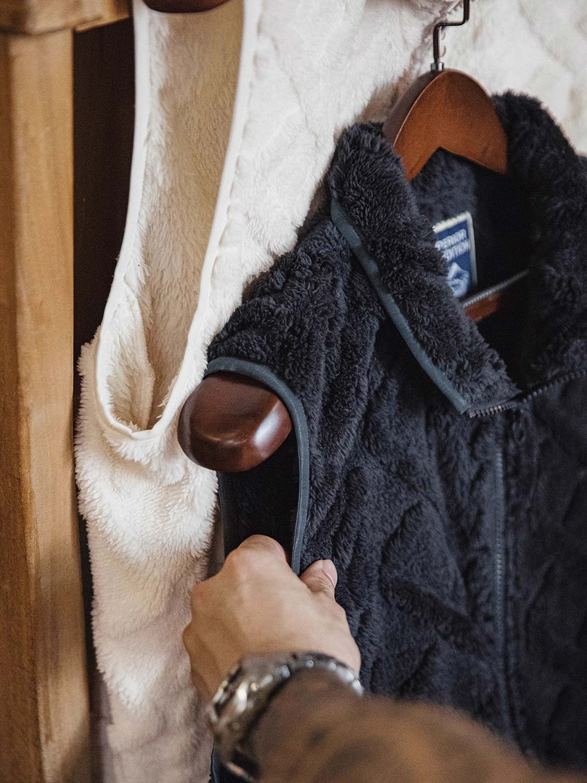立体感のあるケーブル編みデザインが特徴のフリースベスト。軽くて暖かく、秋冬のカジュアルスタイルにぴったり。