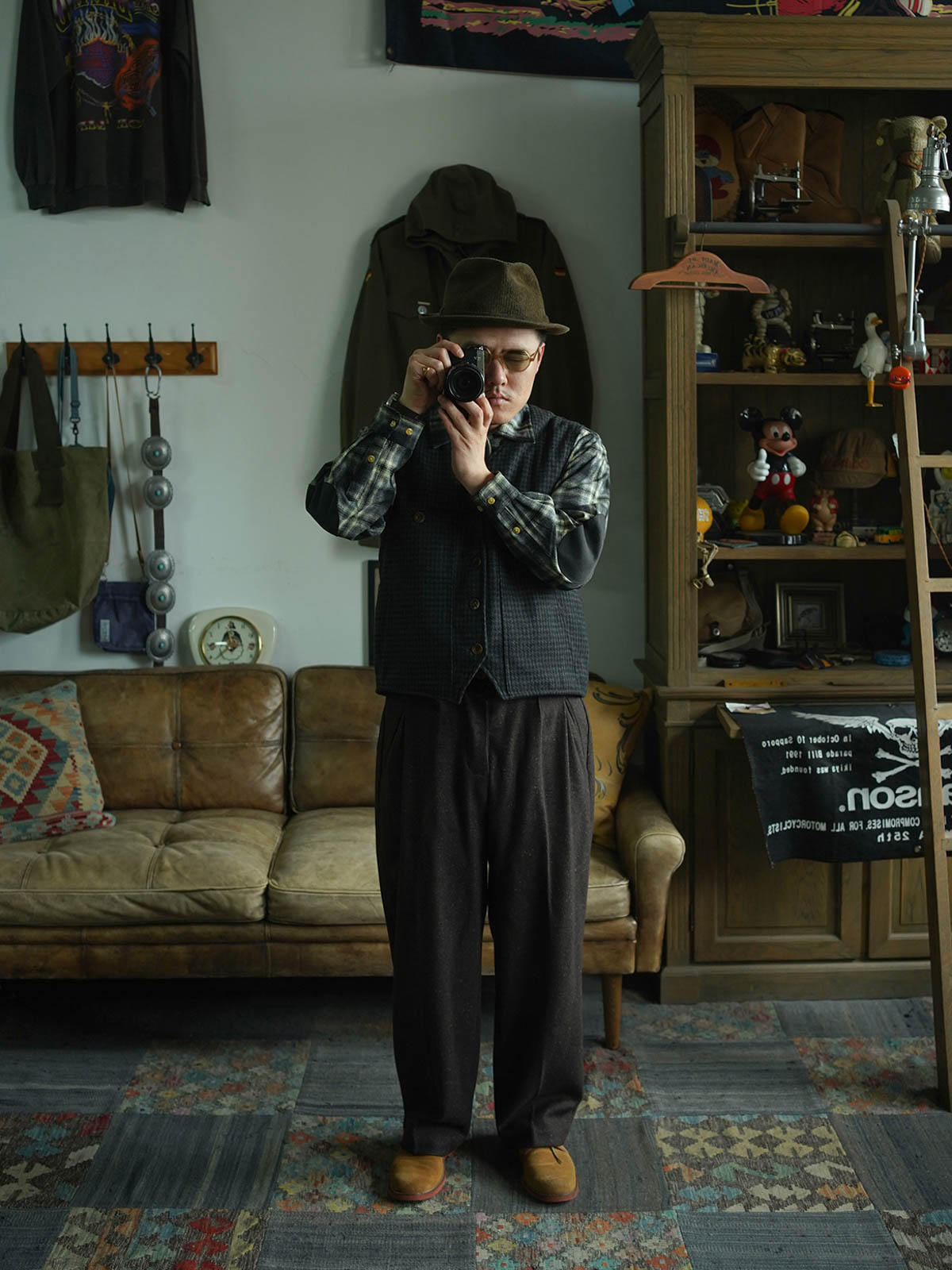 ウールとアクリルの混紡素材を使用したクラシックなワークベストで、第二次世界大戦のアウトドアスタイルをリメイクし、温かさとタフな質感を提供する。