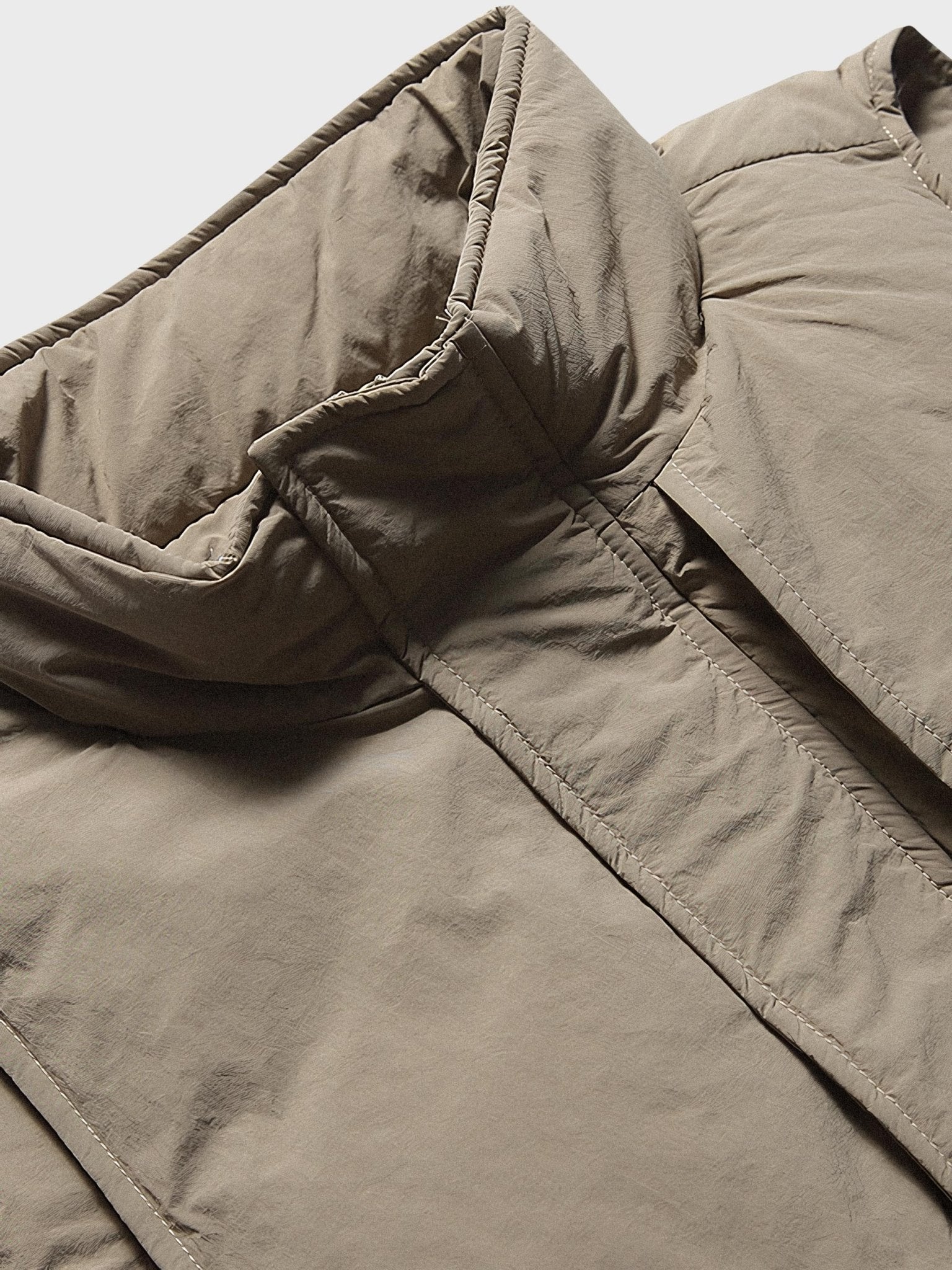 このベストはポリエステルファイバーの素材を採用しており、膨らんだような軽やかな雰囲気を演出しながらも、優れた保温性を提供しています。