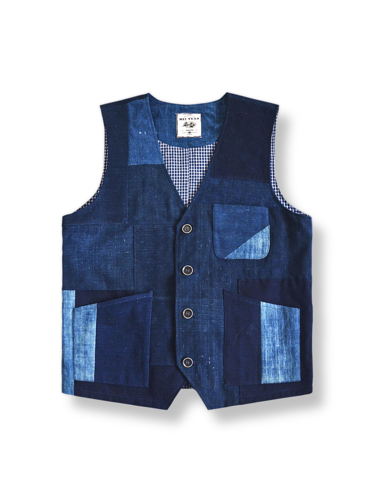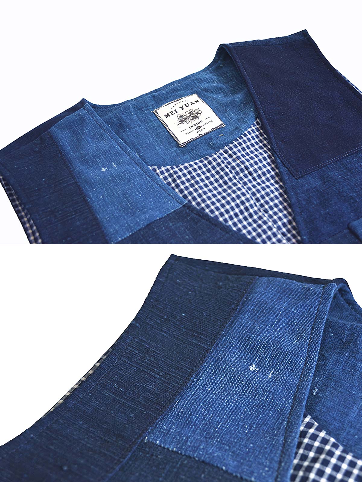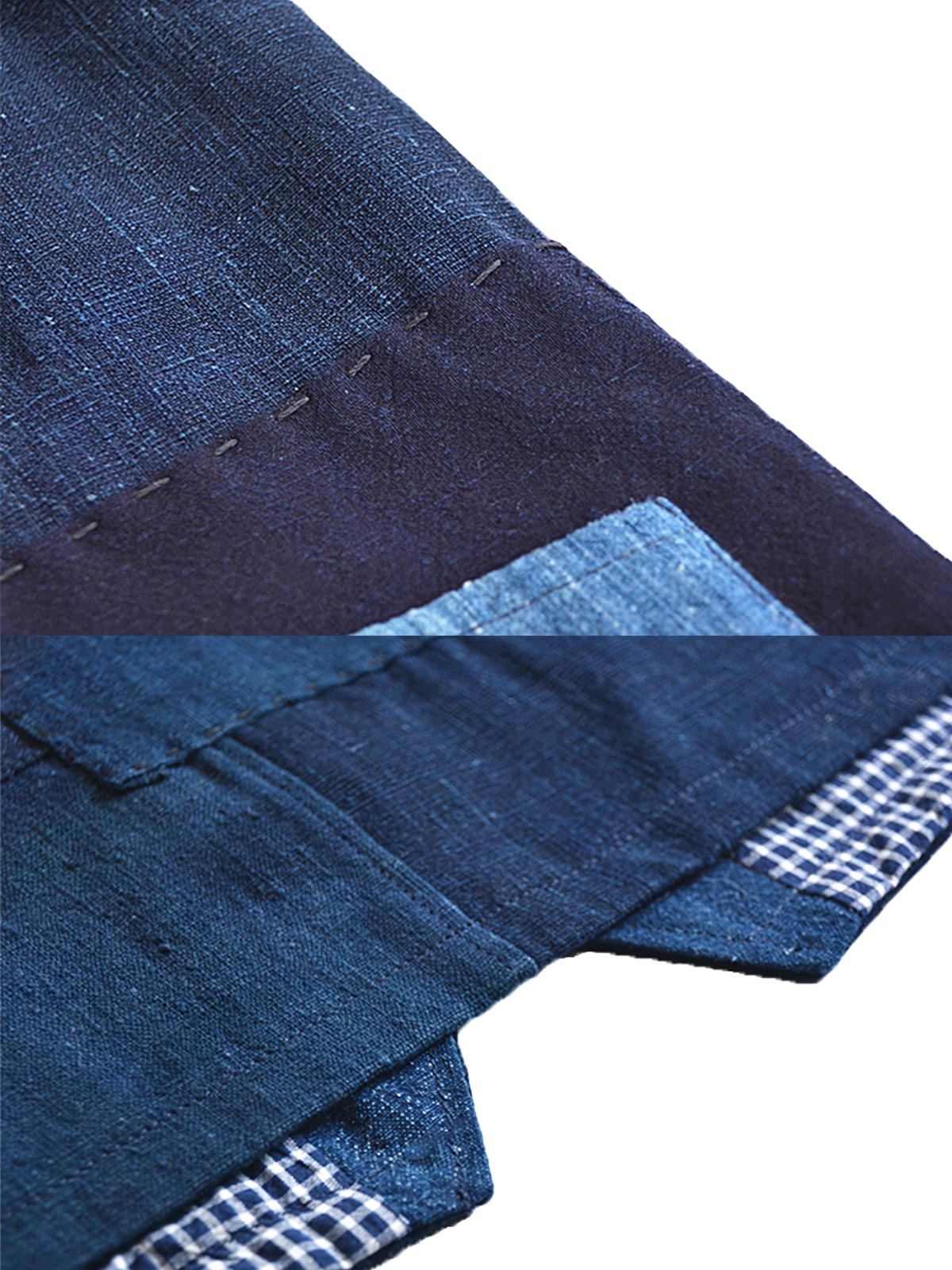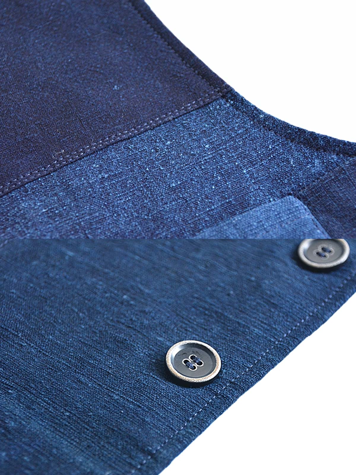 このベストは東洋の伝統工芸とレトロスタイルを融合しています。藍染は古代中国に起源を持ち、布を天然のインディゴ染料に浸し、繰り返し作業を行うことで豊かで深い色を出す技法です。パッチワークデザインは異なる時代の古布を使用し、各布は時の痕跡を持ちます。