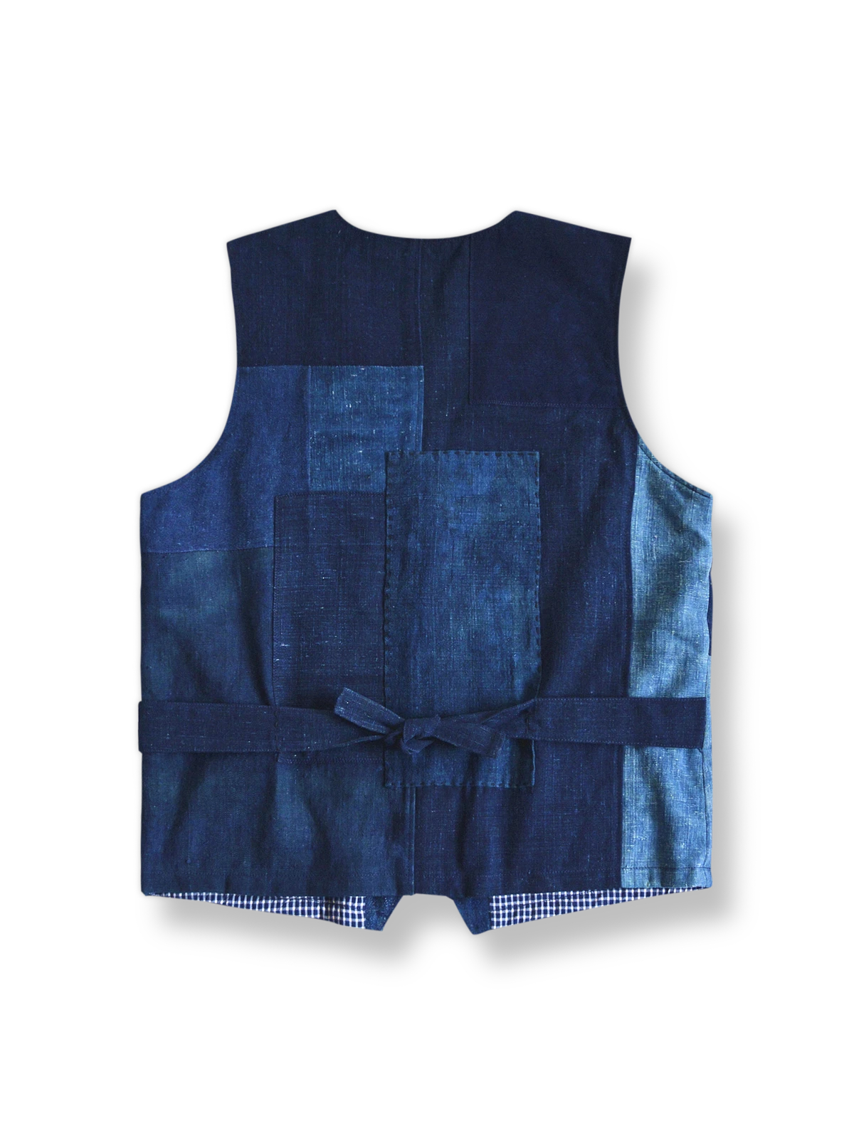 ベストの素材は藍染めされたコットンの古布で、柔らかく通気性が良く、四季を通じて着用できます。パッチワーク部分の不規則な刺し子刺繍は視覚的な層を加え、職人の細部へのこだわりと伝統工芸への敬意を示しています。