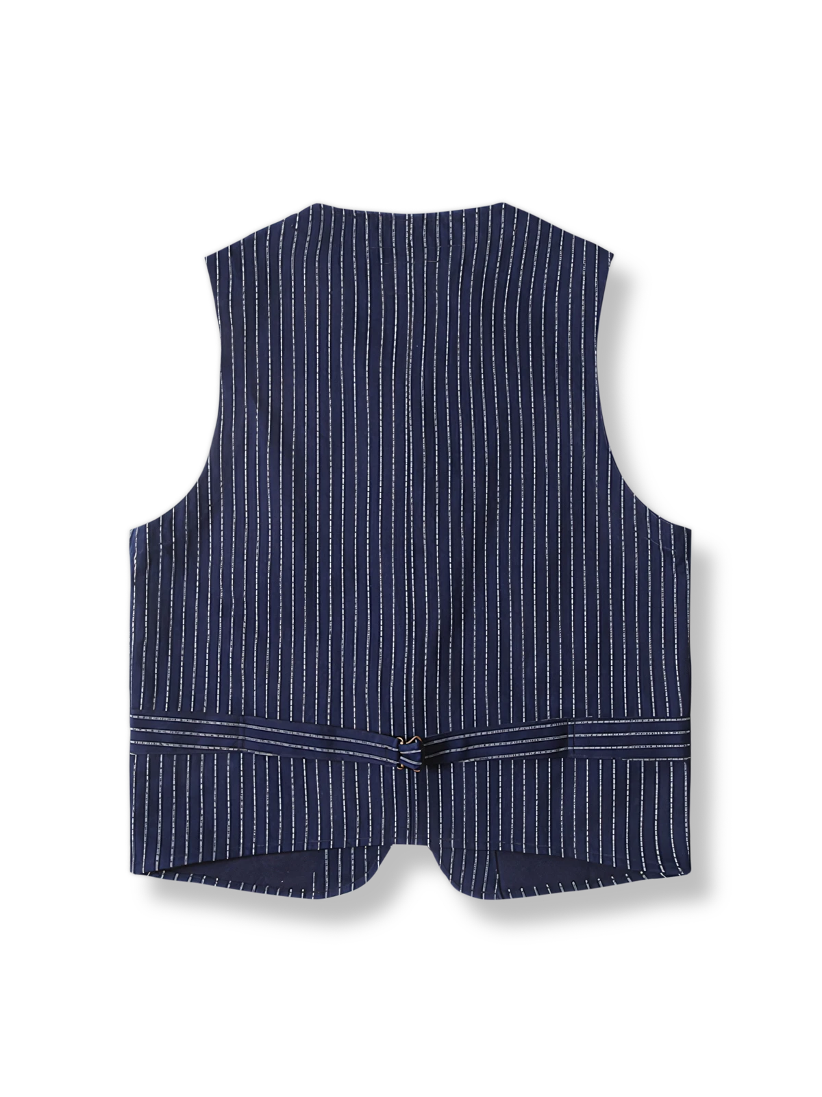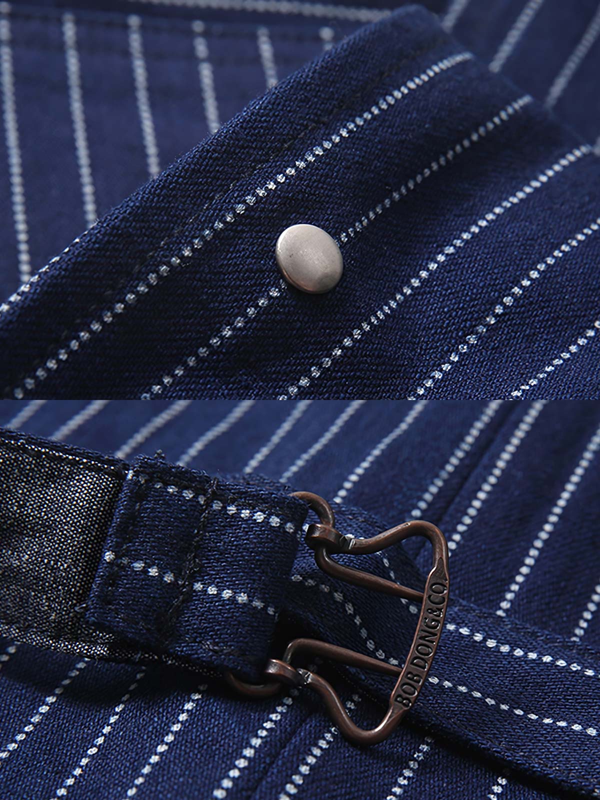 ベストの素材には、赤耳ストライプのあるインディゴブルーのコットン布を選択しており、点状の拔染はベストにユニークなテクスチャを与えています。ボタンはレトロな工業的な雰囲気を加えています。