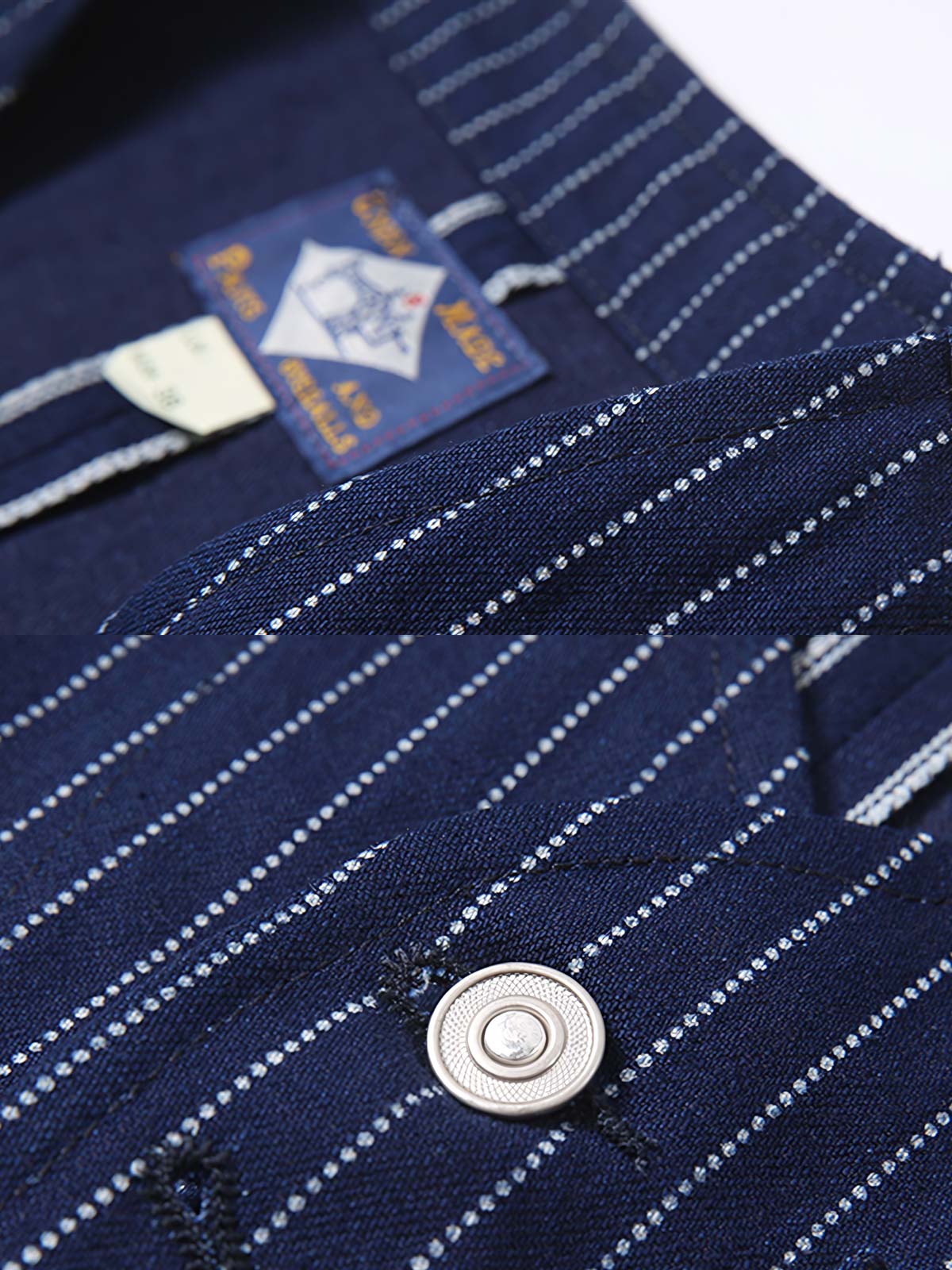 このベストは、WABASH点状の拔染(バッティック)技術を採用しており、19世紀末から20世紀初頭のアメリカに起源を持ちます。インディゴブルーと赤耳(セルビッジ)のストライプは、クラシックなワークウェアの要素であり、ワークウェアの歴史と文化を象徴しています。