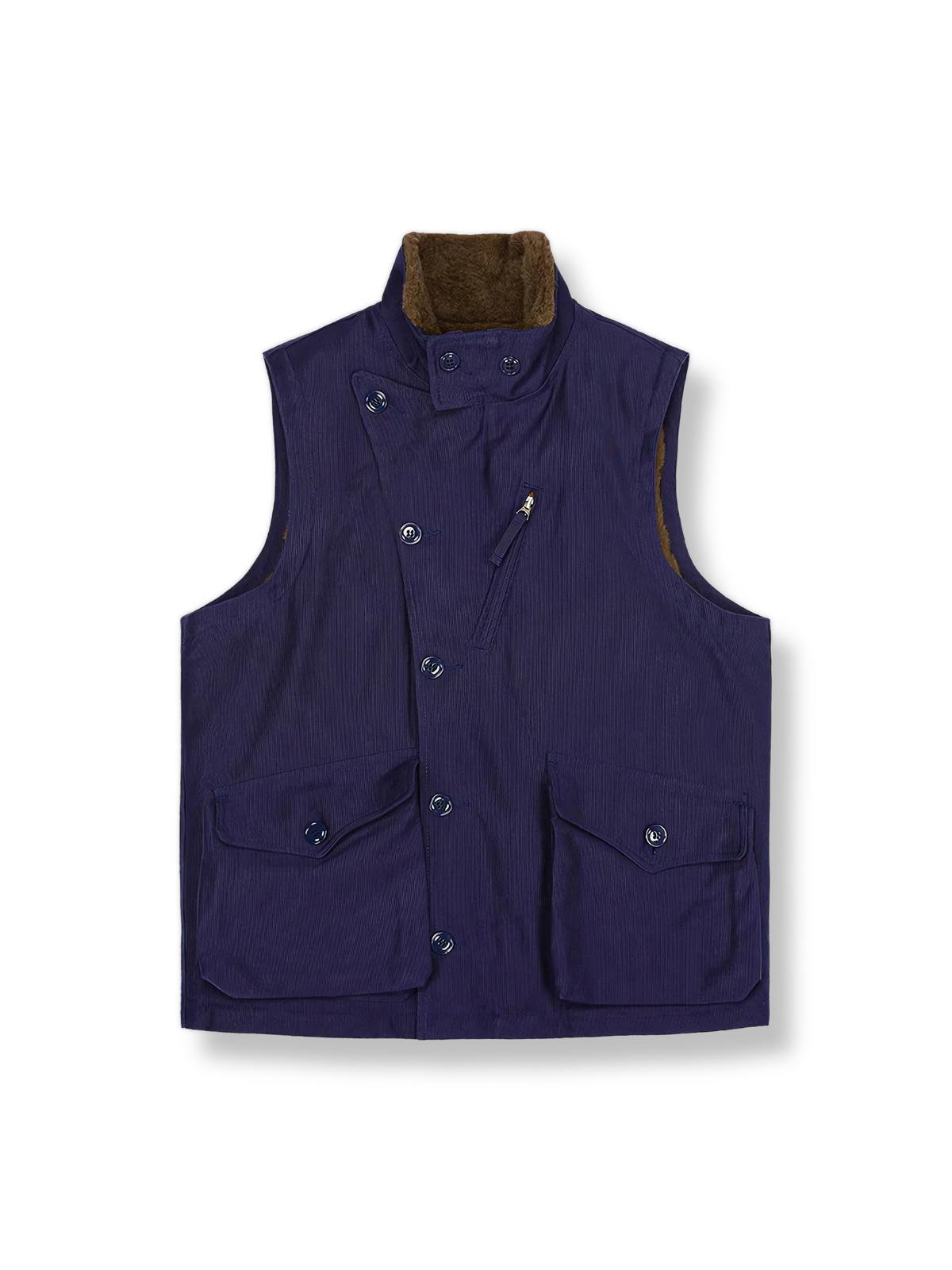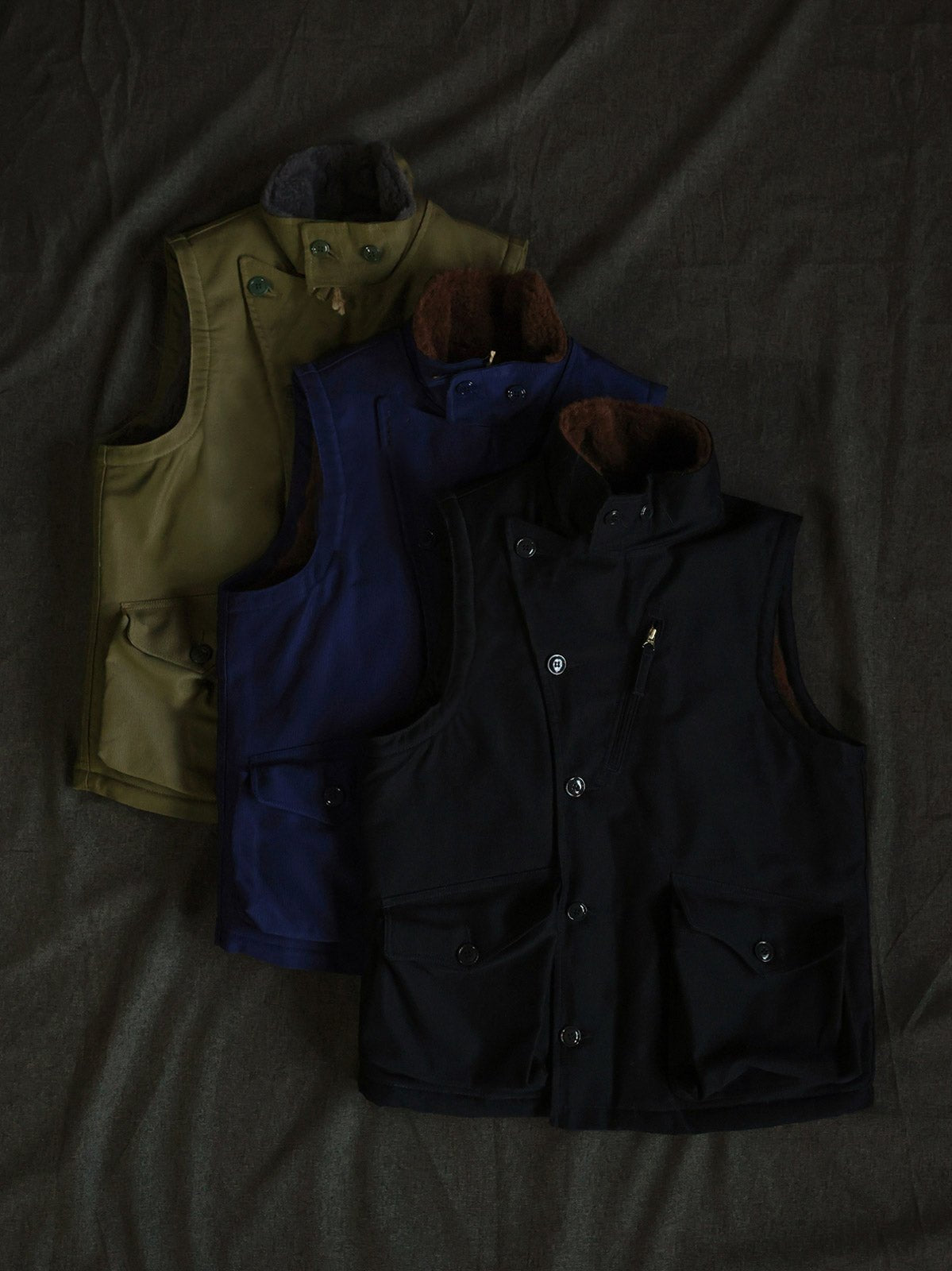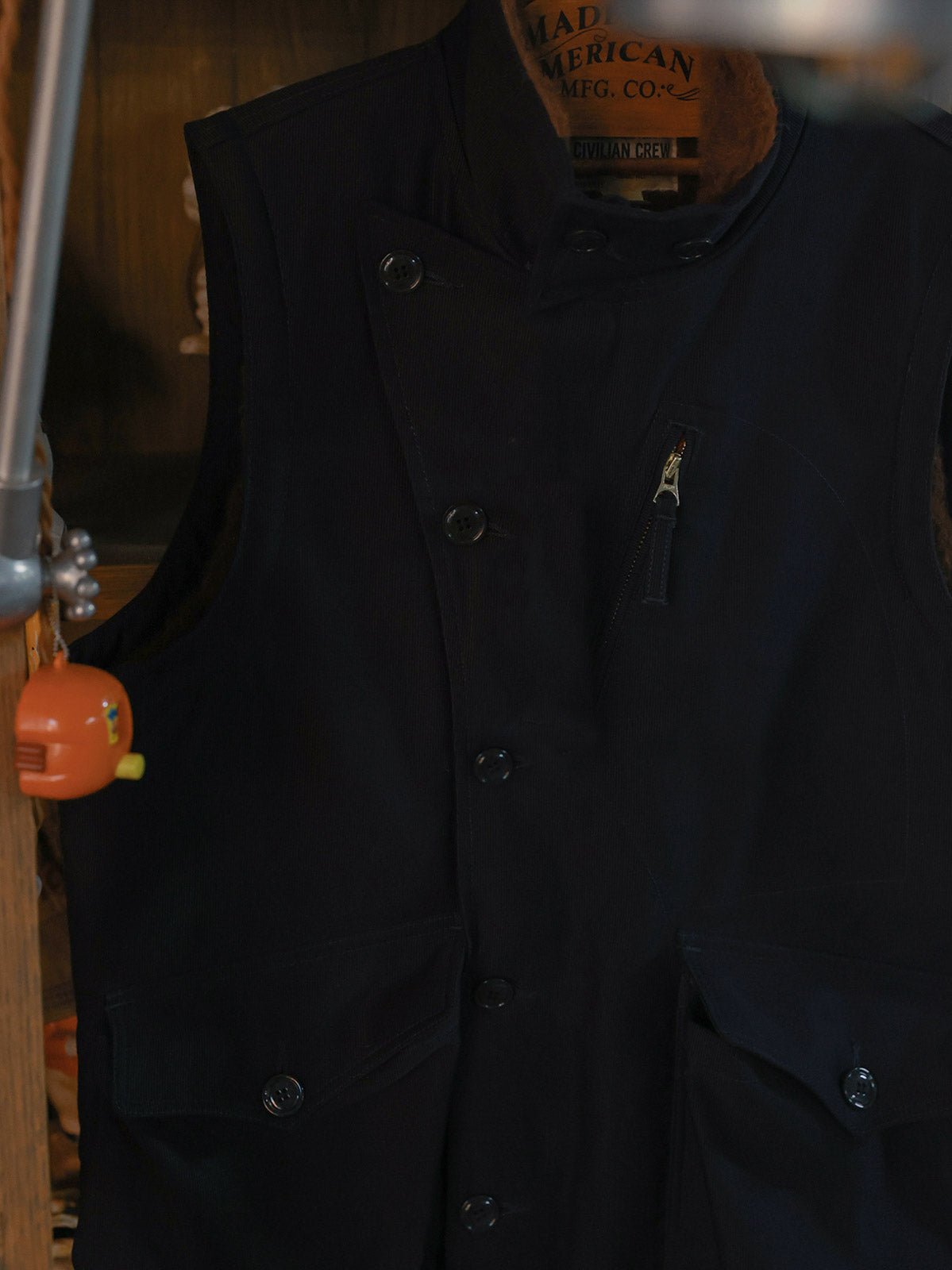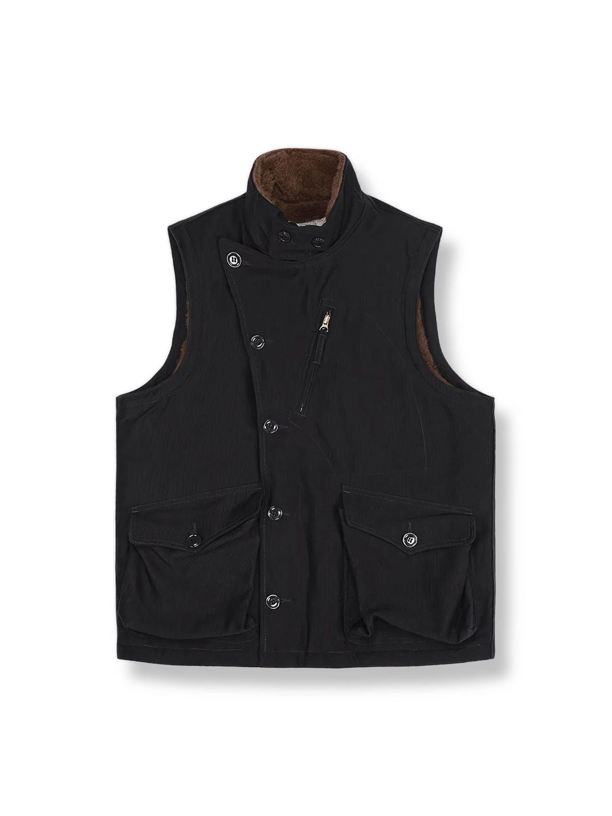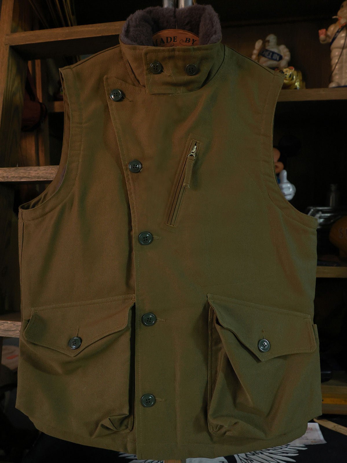 軍用飛行士の防寒装備に由来するこのベストは、フライトジャケットの実用性と耐久性を受け継いでいます。高比率の羊毛裏地を採用し、軍用装備の保温性に対する厳しい要求を反映するとともに、伝統と現代の航空ファッションの融合を体現しています。