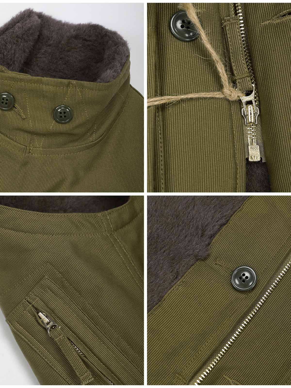 95%の羊毛混紡の裏地は、優れた保温効果を提供し、寒い天候に適しています。高品質の素材を使用し、軍用グリーンの色調と実用的なポケットデザインが、力強い外観と精巧なディテールを展開します。金属製のボタンと精工細作のジッパーが、ベストの耐久性とスタイル特性を強化しています。