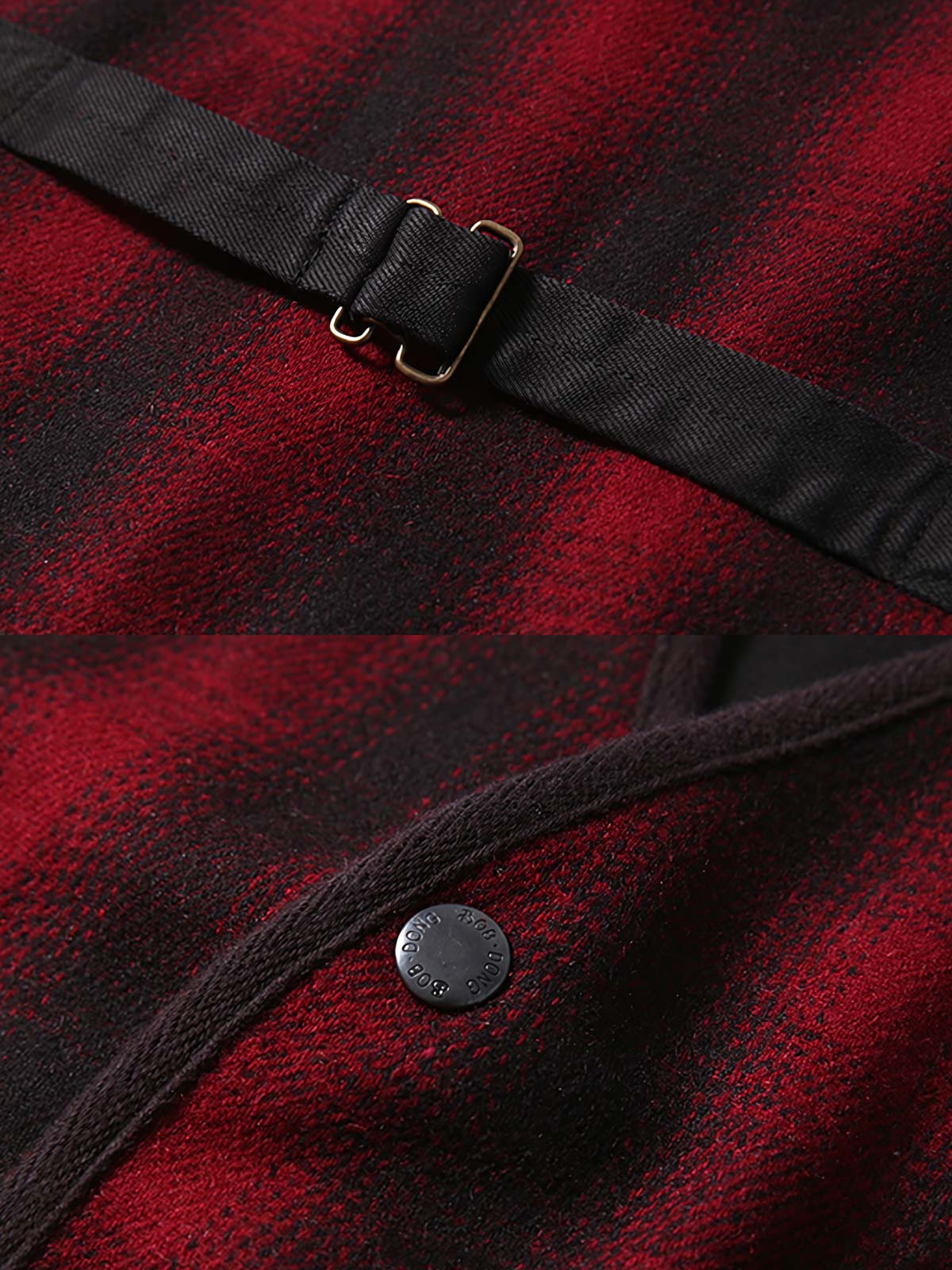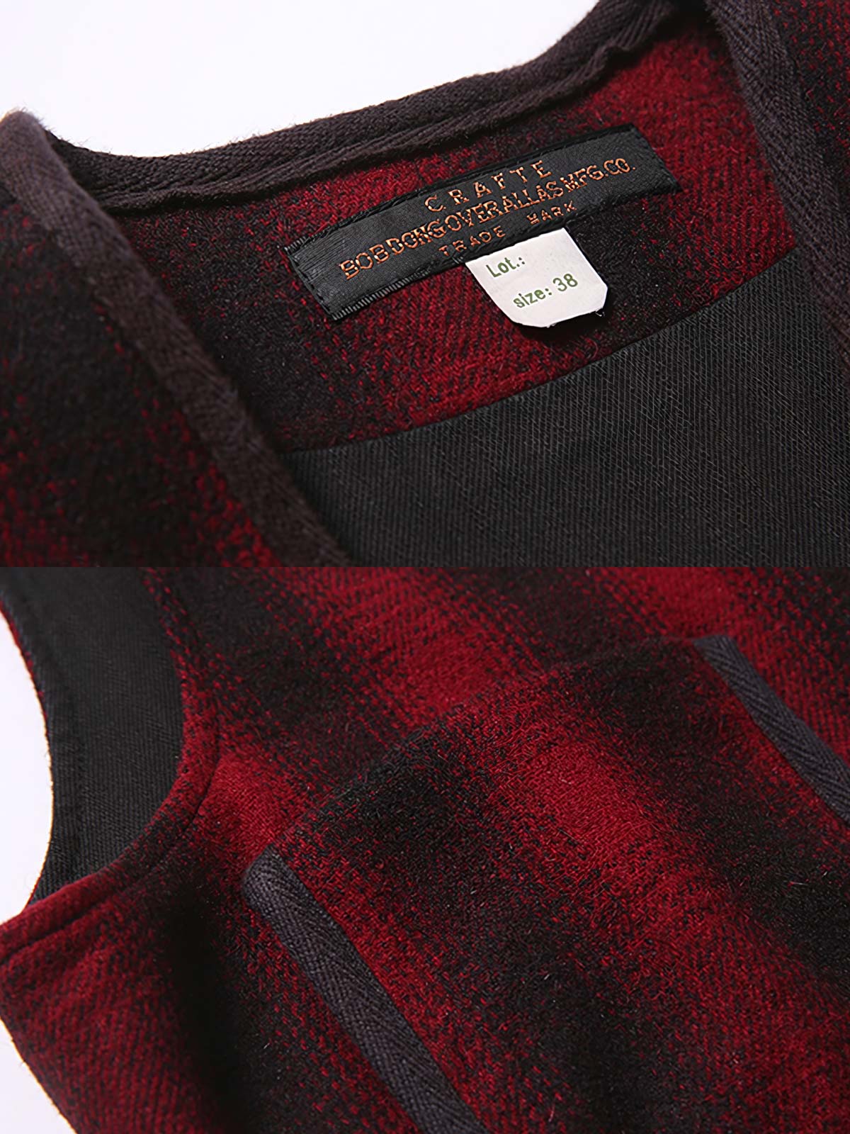 このベストは、色織り格子のデザイン要素を取り入れており、このデザインは英国の伝統的な衣服によく見られ、優雅さと歴史的深みを表現しています。4つの実用的な大きなポケットは、ワークスタイルの実用性を強調し、内側のコットン布地は快適さを保証します。