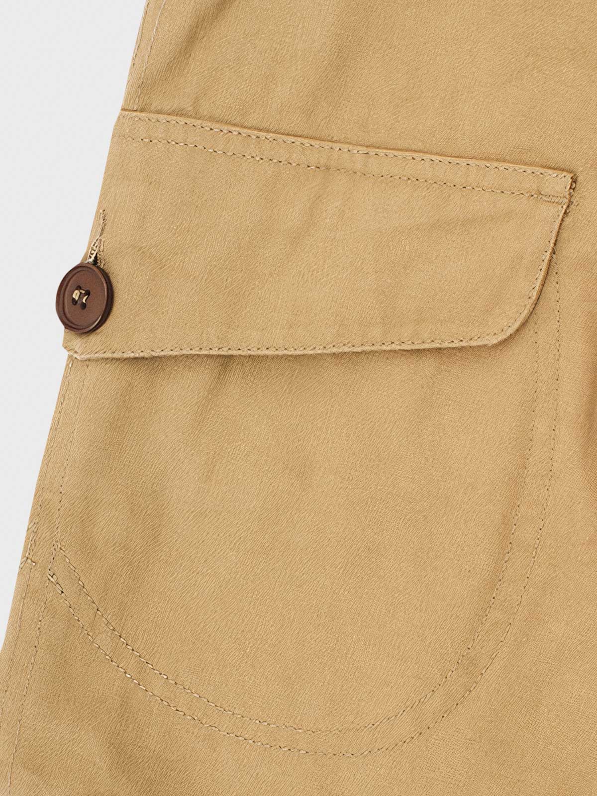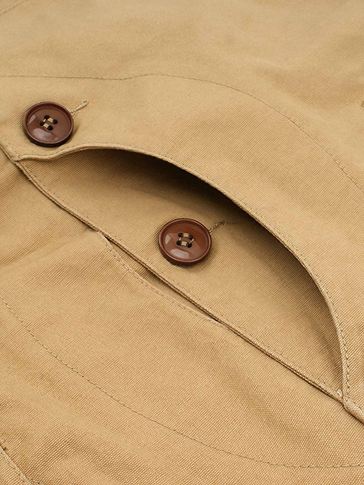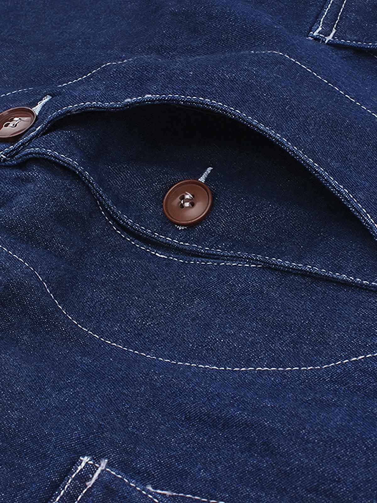 高品質のコットン素材を使用しており、快適で耐久性があります。複数のポケットは、ワークウェアの機能性を強調すると同時に、ファッショナブルな要素を加えています。木製のボタンと細かいステッチが、ヴィンテージとモダンの融合を示しています。