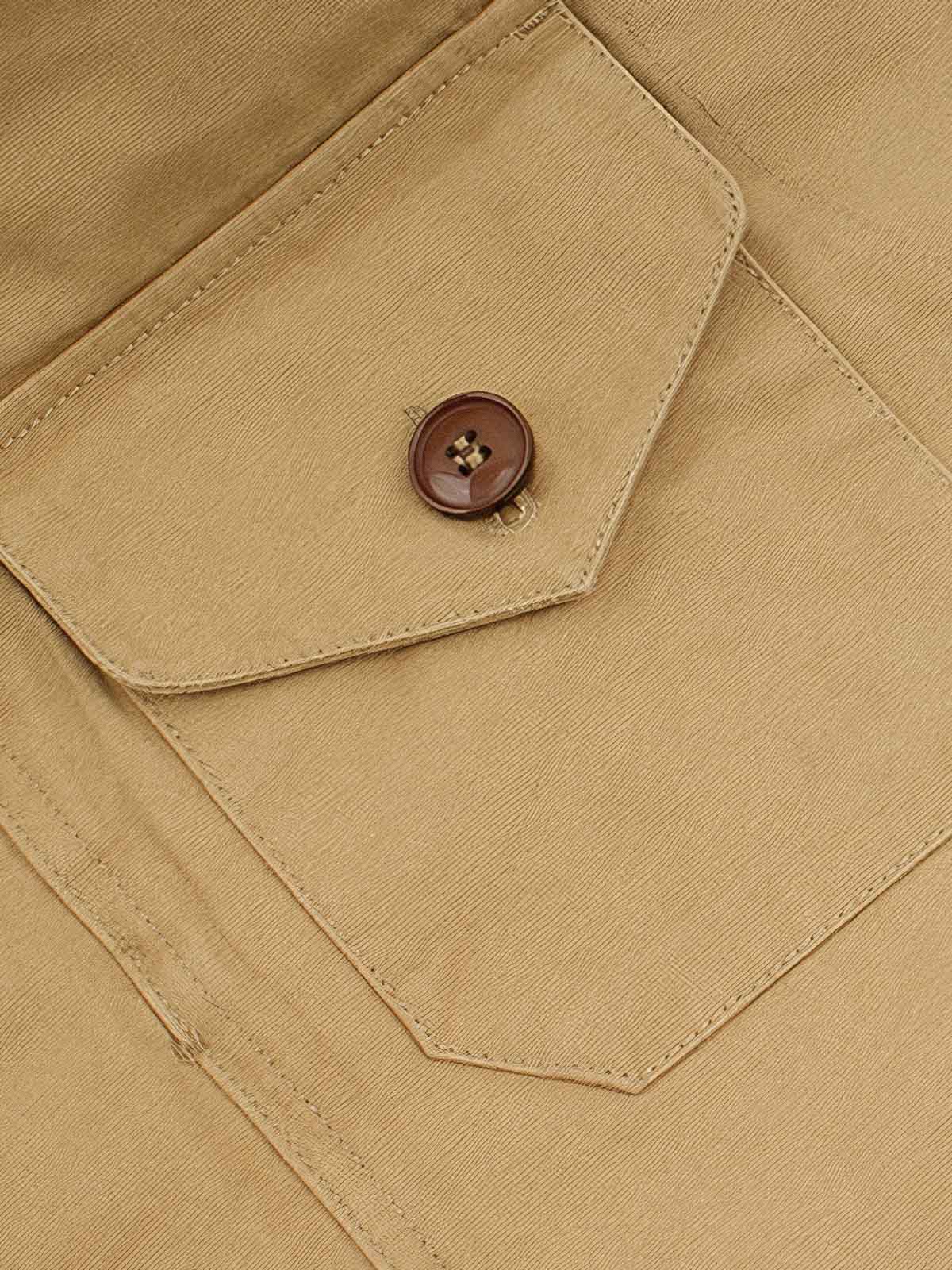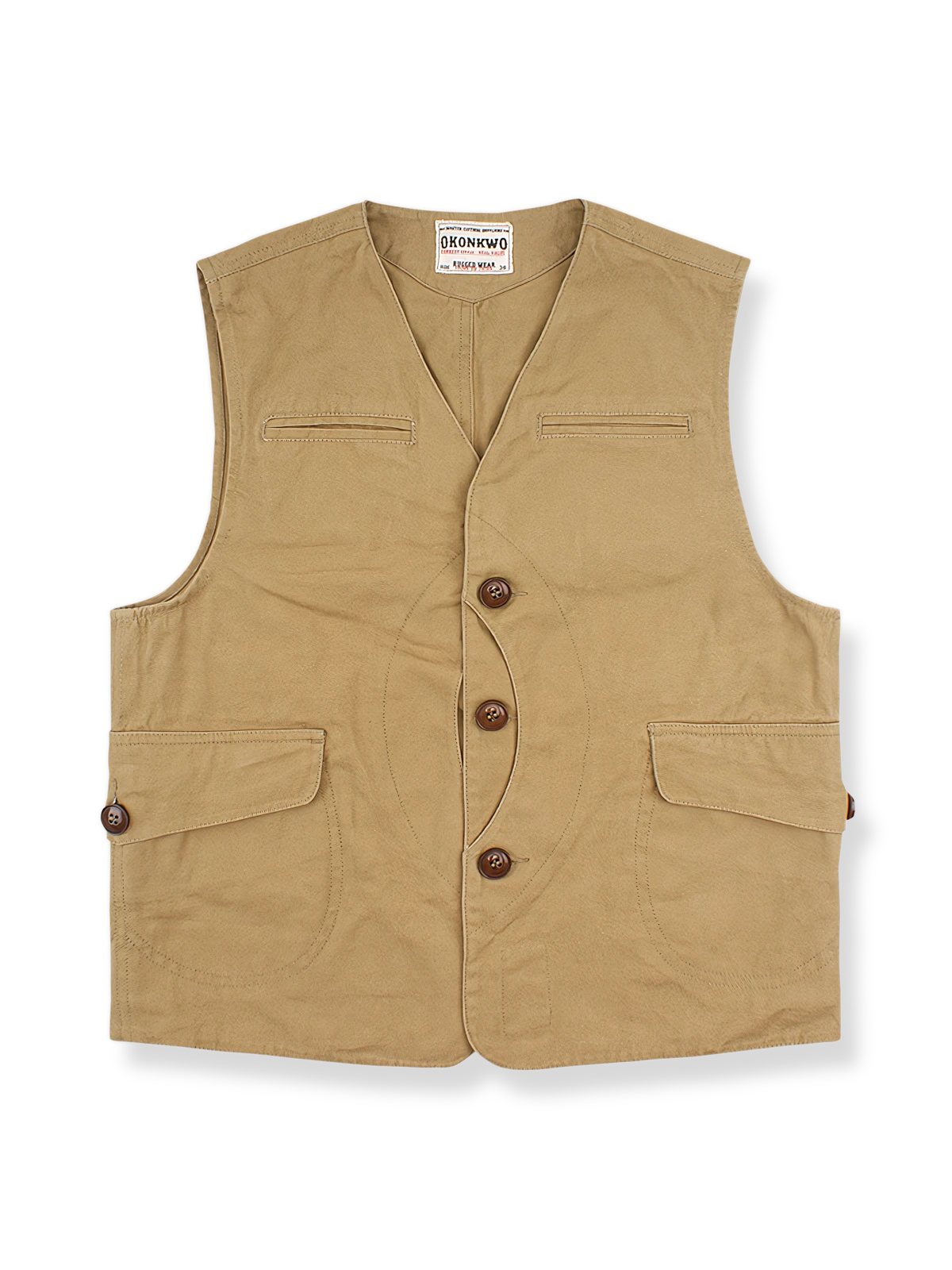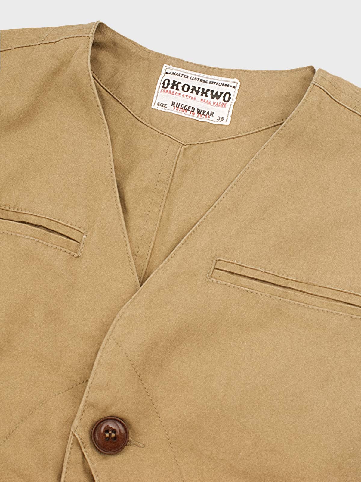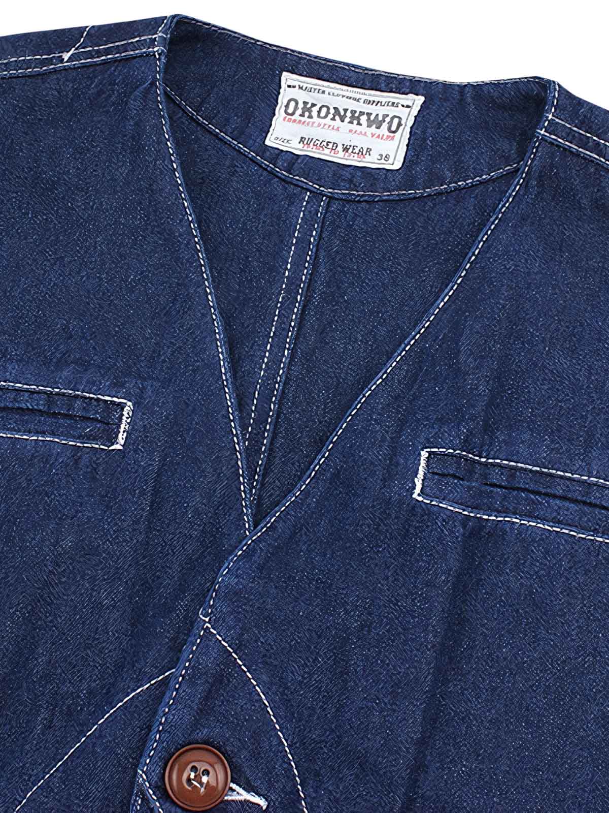 高品質のコットン素材を使用しており、快適で耐久性があります。複数のポケットは、ワークウェアの機能性を強調すると同時に、ファッショナブルな要素を加えています。木製のボタンと細かいステッチが、ヴィンテージとモダンの融合を示しています。