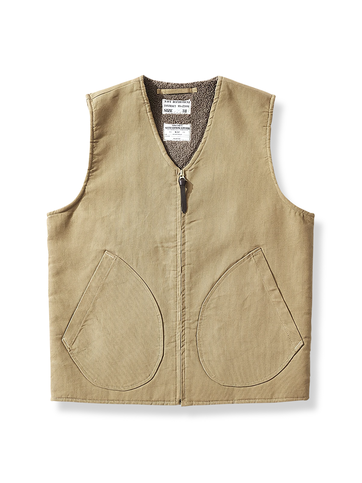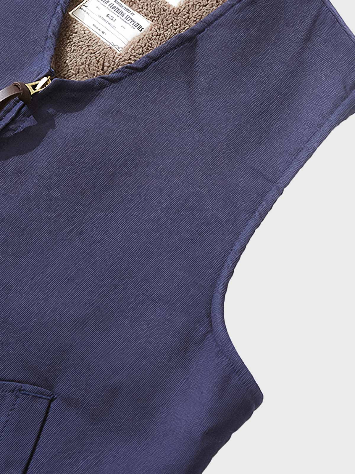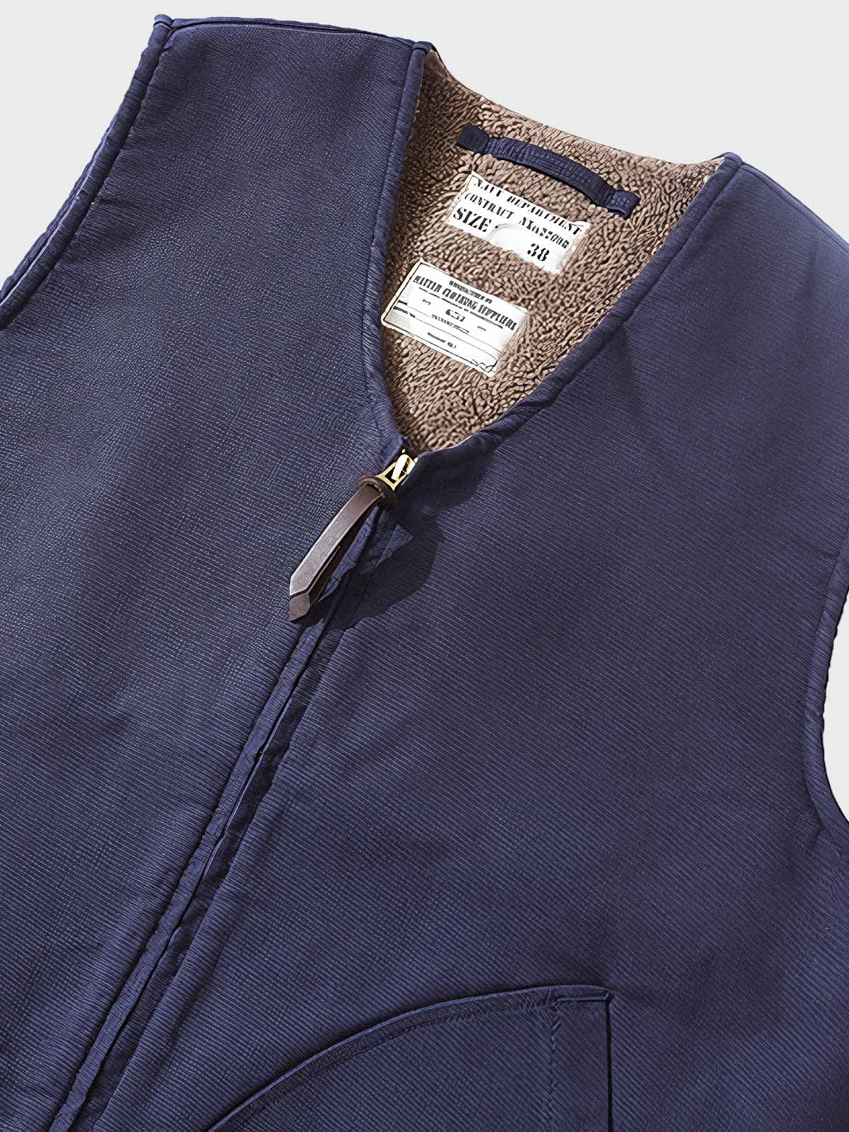 このベストは第二次世界大戦時の海軍服をモチーフにしており、軍事的要素と現代のカジュアルスタイルを融合しています。ラムフリースの襟元のディテールは、クラシックなレトロデザインを際立たせ、当時の服装の保温性への注目を反映しています。