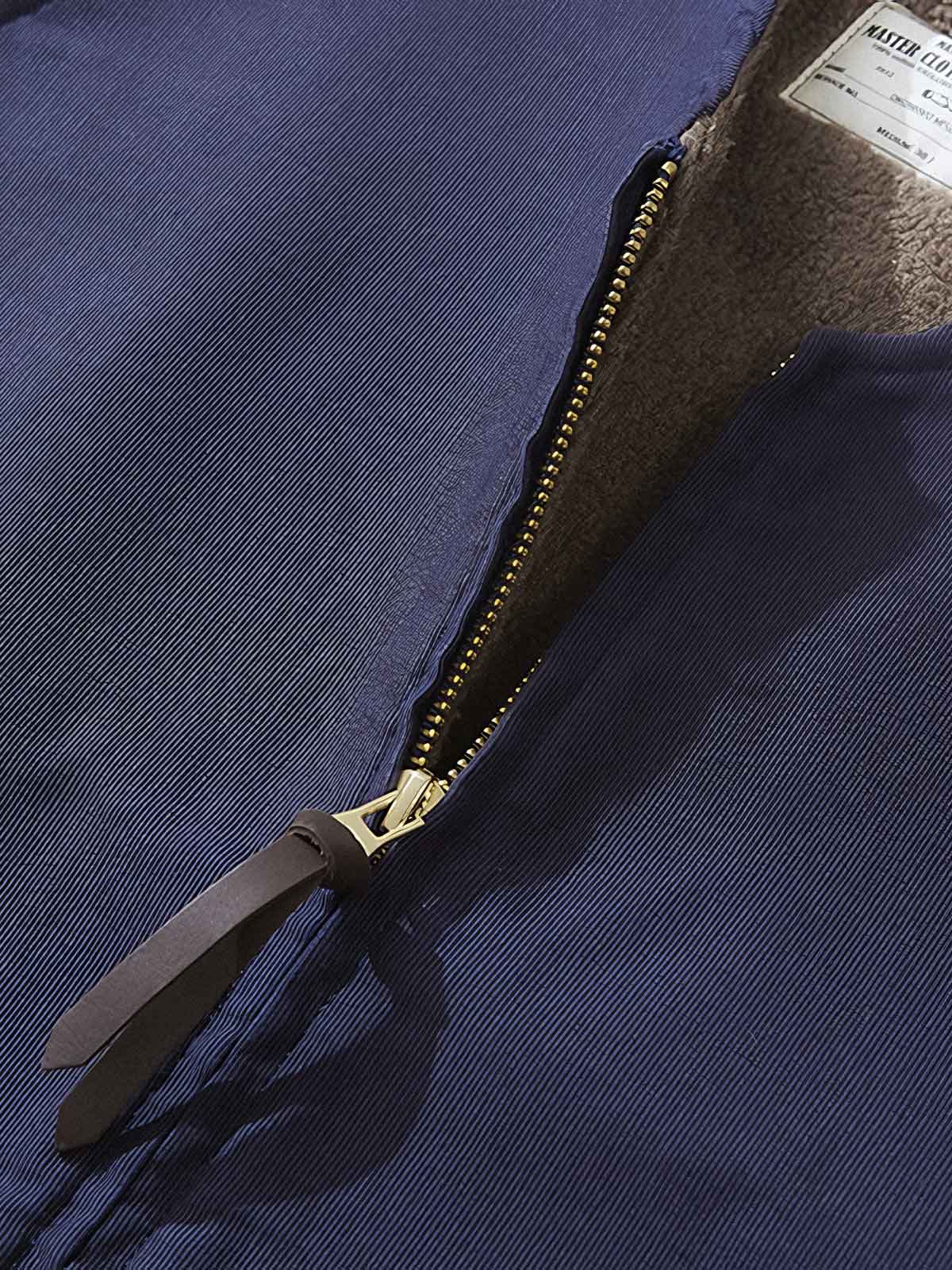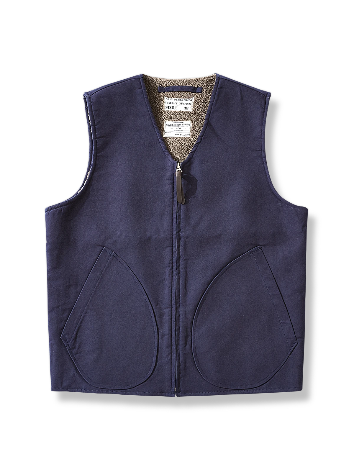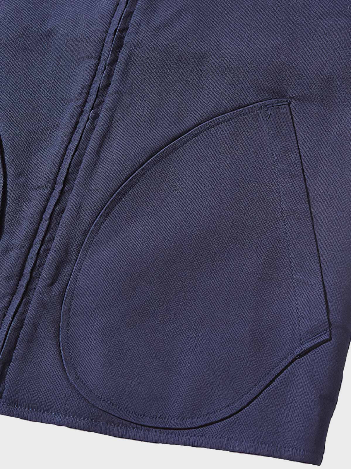 このベストは第二次世界大戦時の海軍服をモチーフにしており、軍事的要素と現代のカジュアルスタイルを融合しています。ラムフリースの襟元のディテールは、クラシックなレトロデザインを際立たせ、当時の服装の保温性への注目を反映しています。