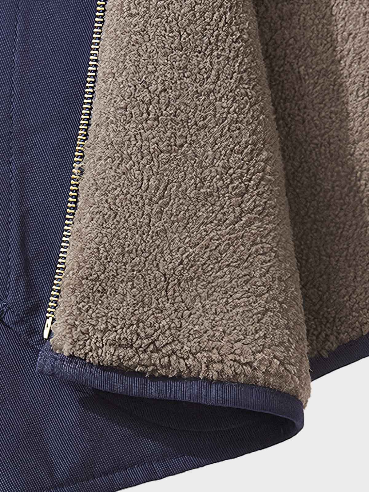 ラムフリース素材を使用しており、服の保温性と快適さを向上させています。フロントの大きなポケットは実用的でありながら、カジュアルなワークスタイルを加えています。