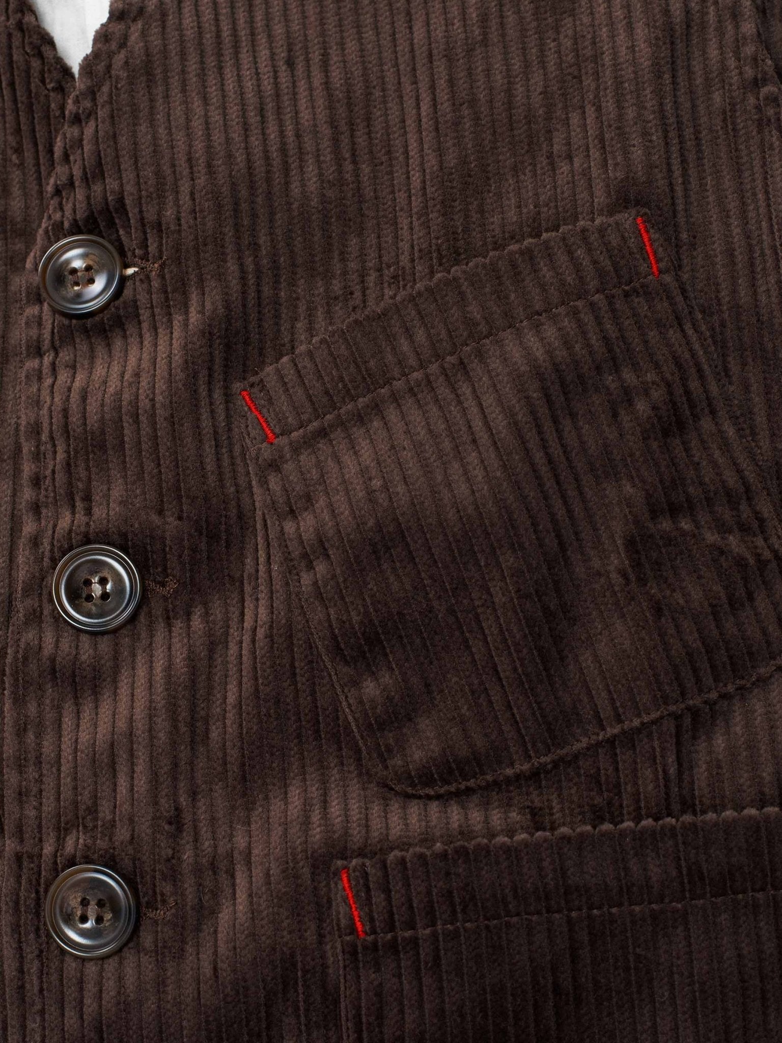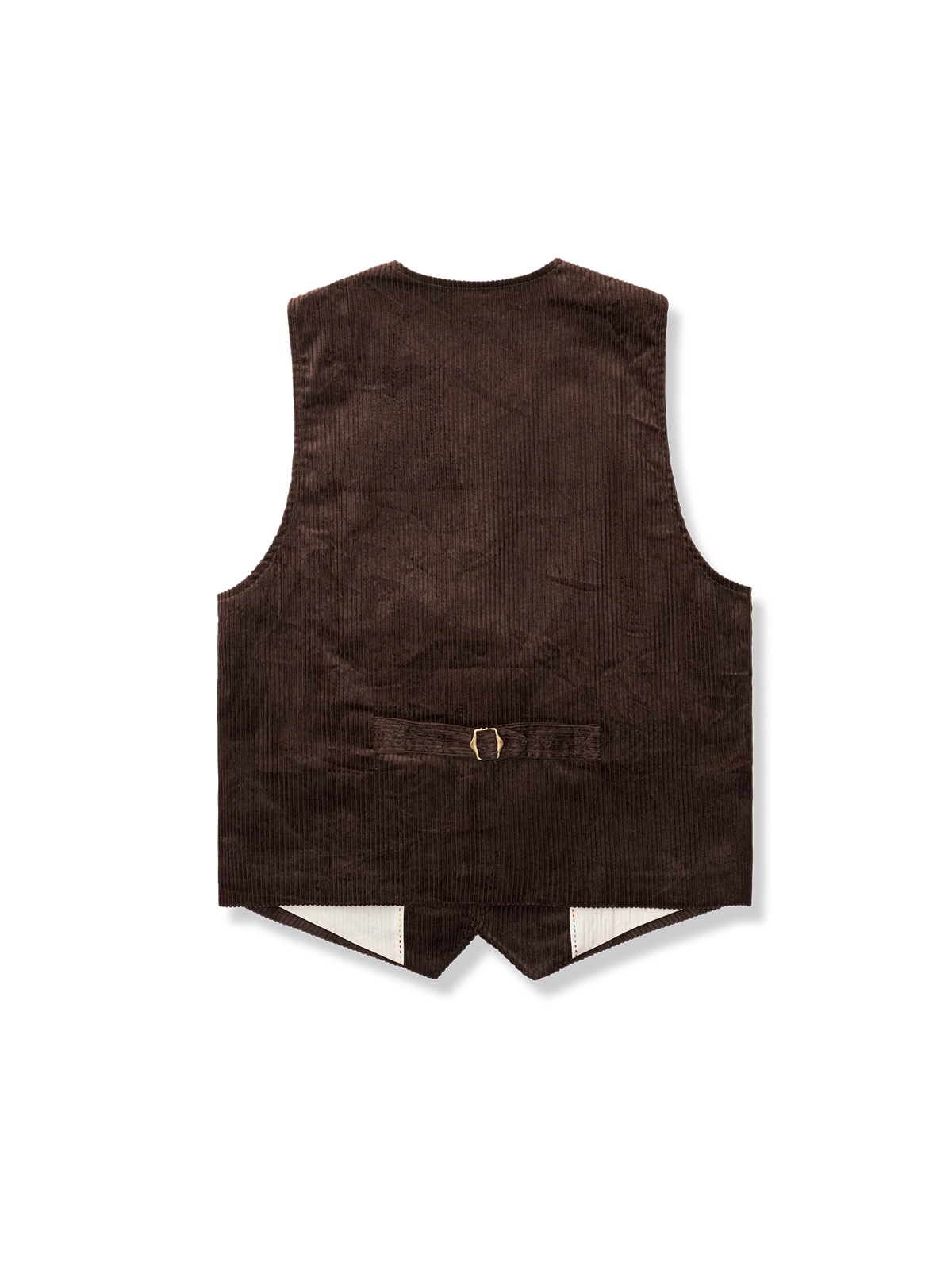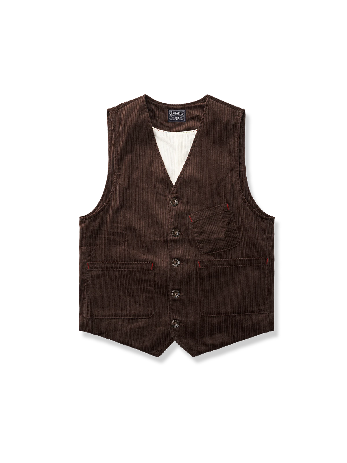 Vネックが採用されたワークベストで、独特のコーデュロイ素材が衣服に暖かみを与え、伝統的な工芸を維持しつつ現代的な要素も取り入れています。