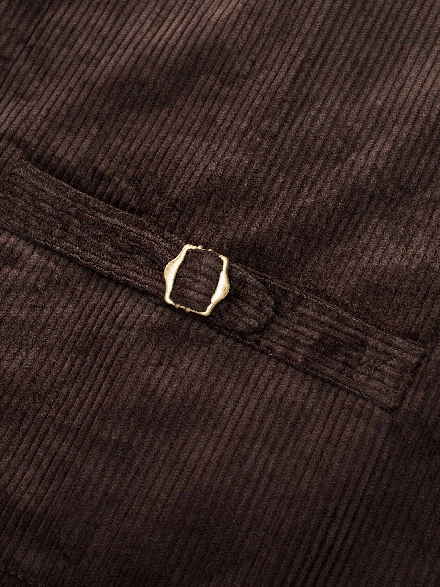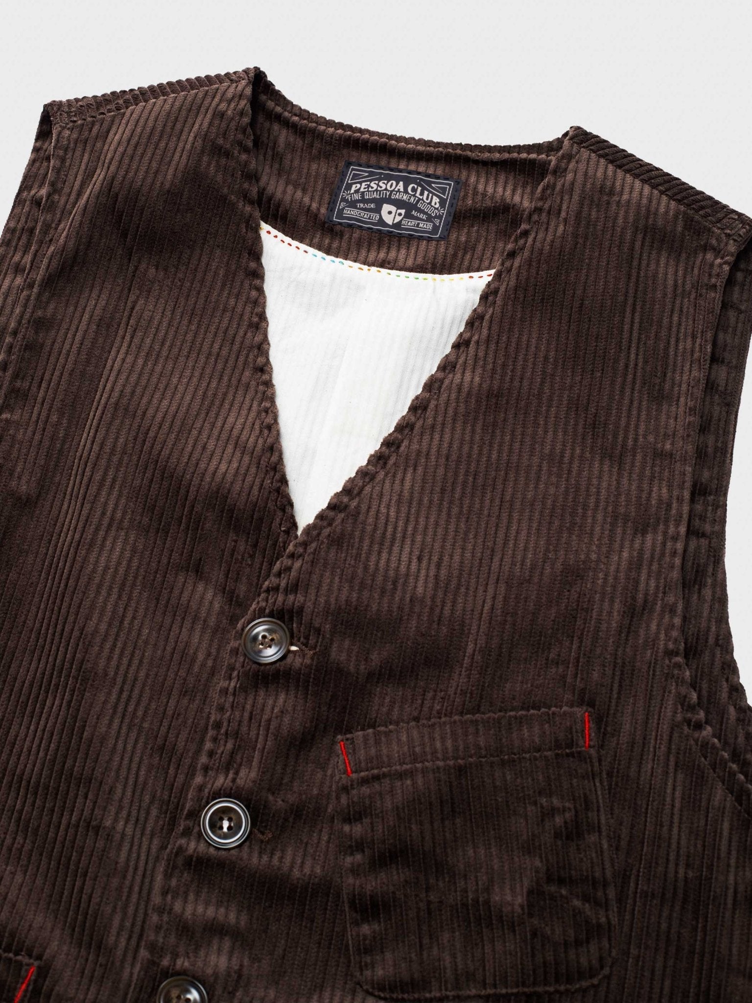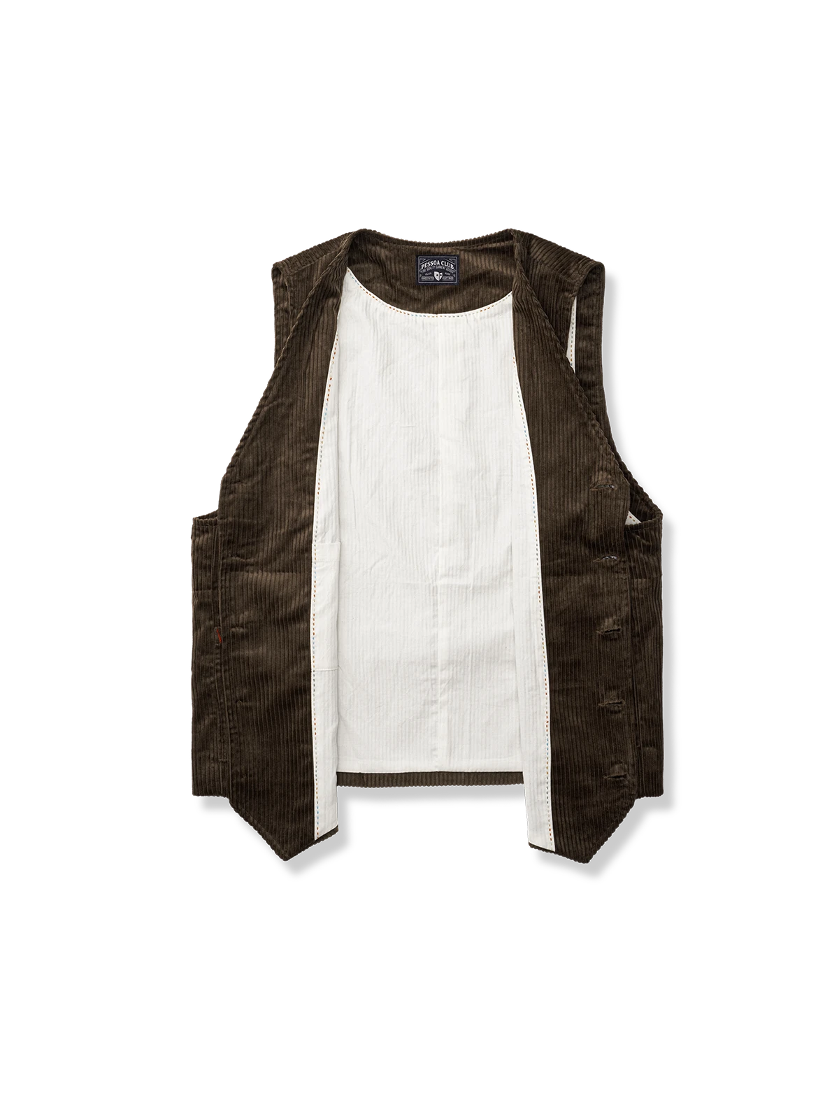 Vネックが採用されたワークベストで、独特のコーデュロイ素材が衣服に暖かみを与え、伝統的な工芸を維持しつつ現代的な要素も取り入れています。