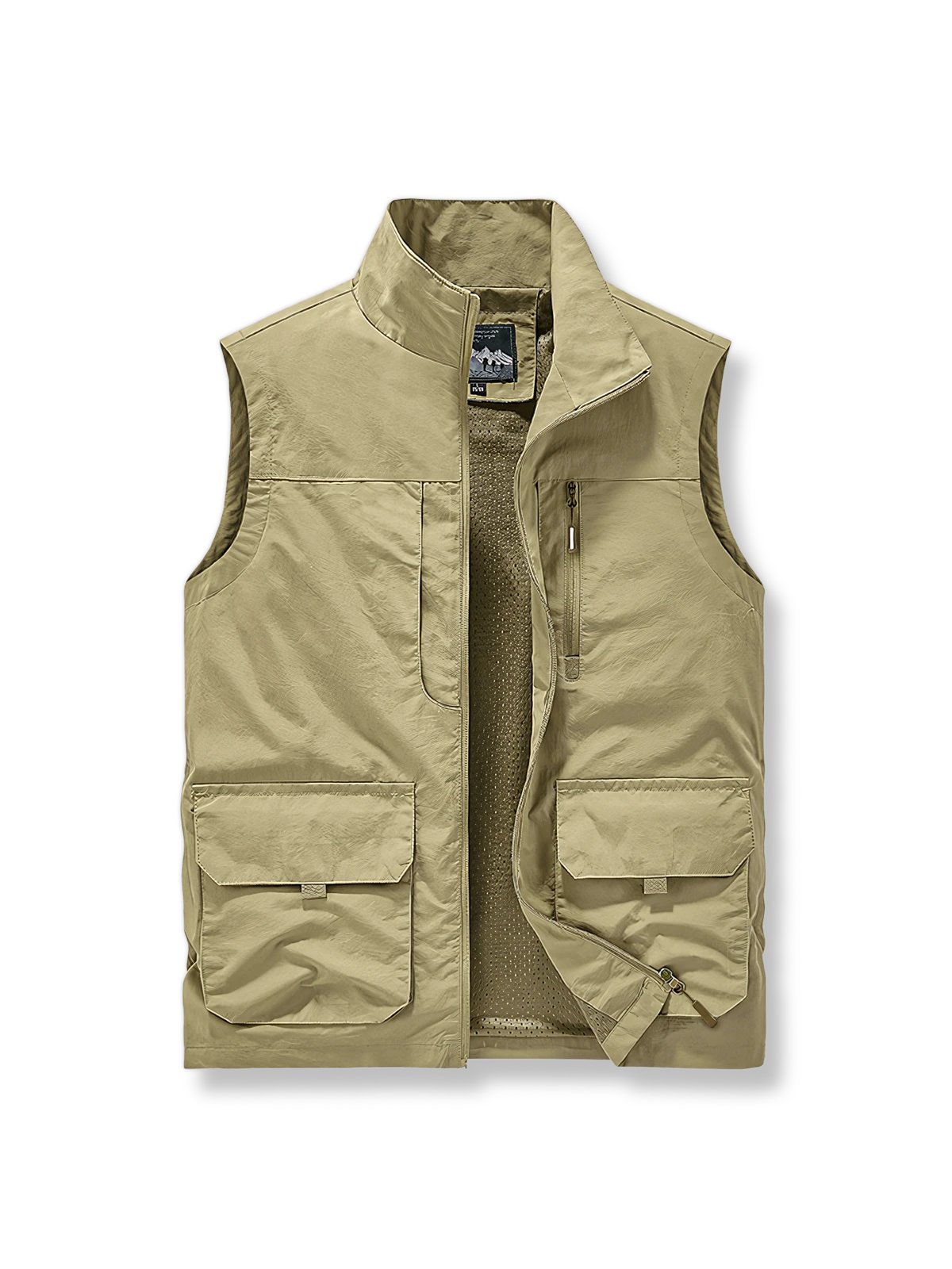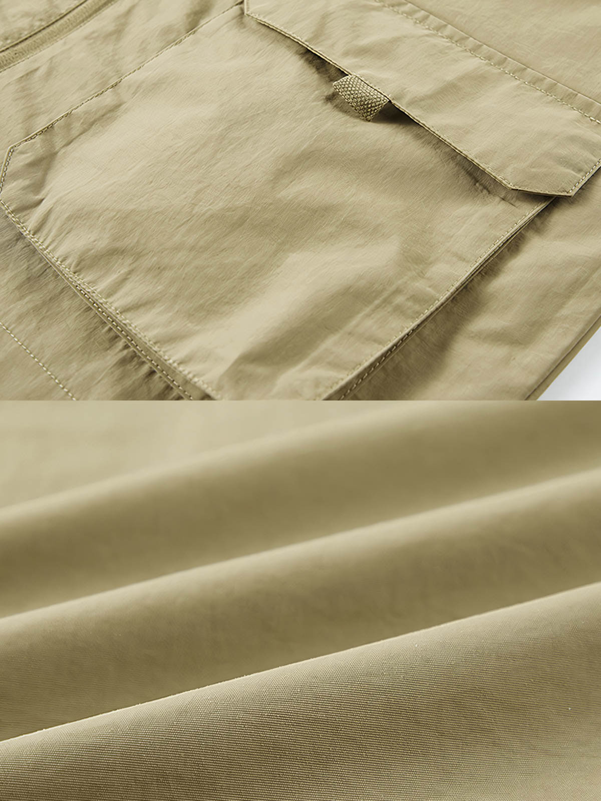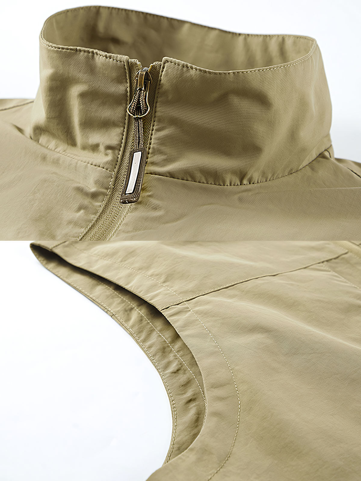 このベストは、ミリタリーエレメントと現代カジュアルスタイルを融合しており、立ち襟の設計は追加の保護を目的とし、多機能ポケットはアウトドア活動のニーズに応え、美観と実用性を兼ね備えています。