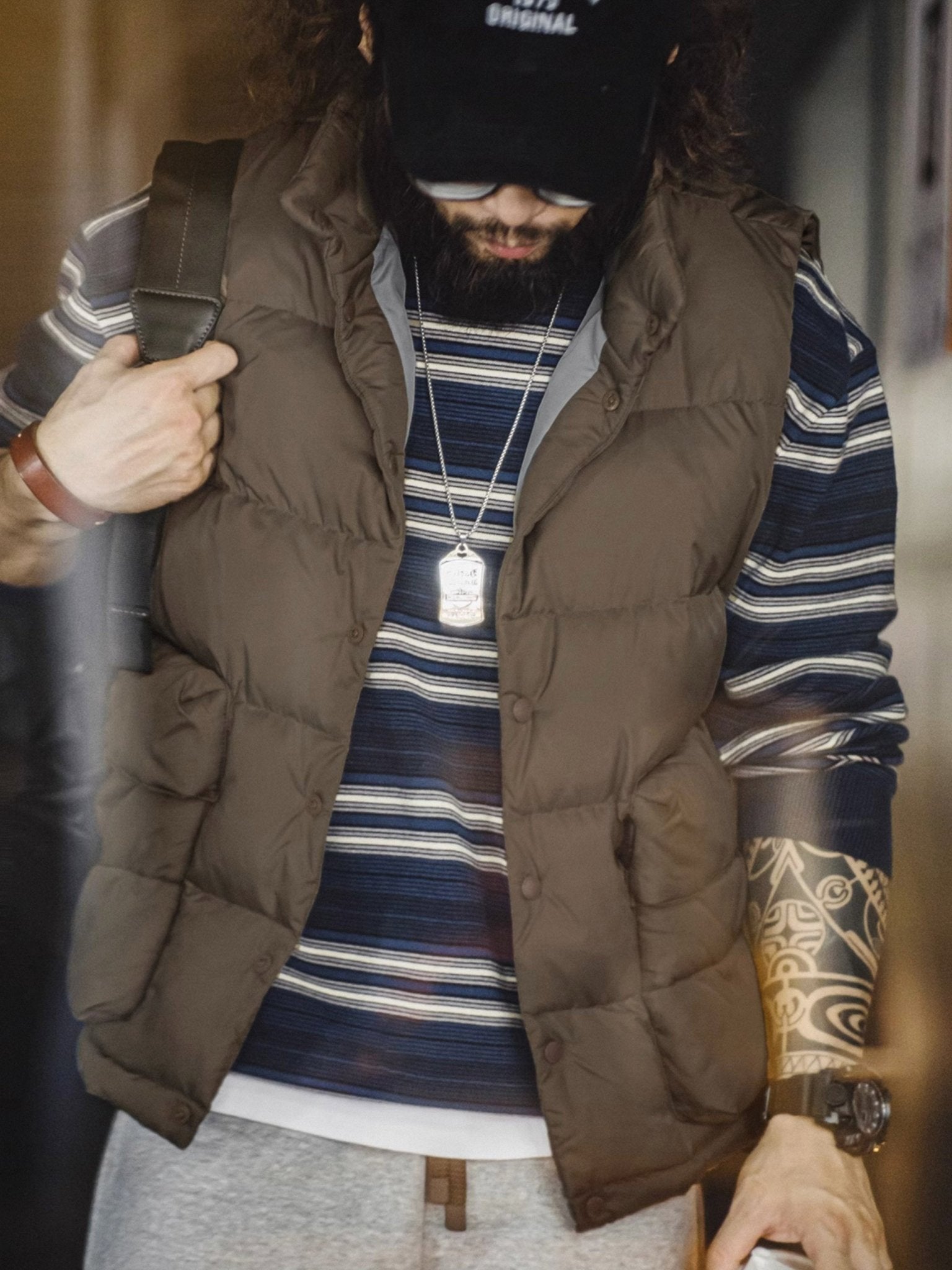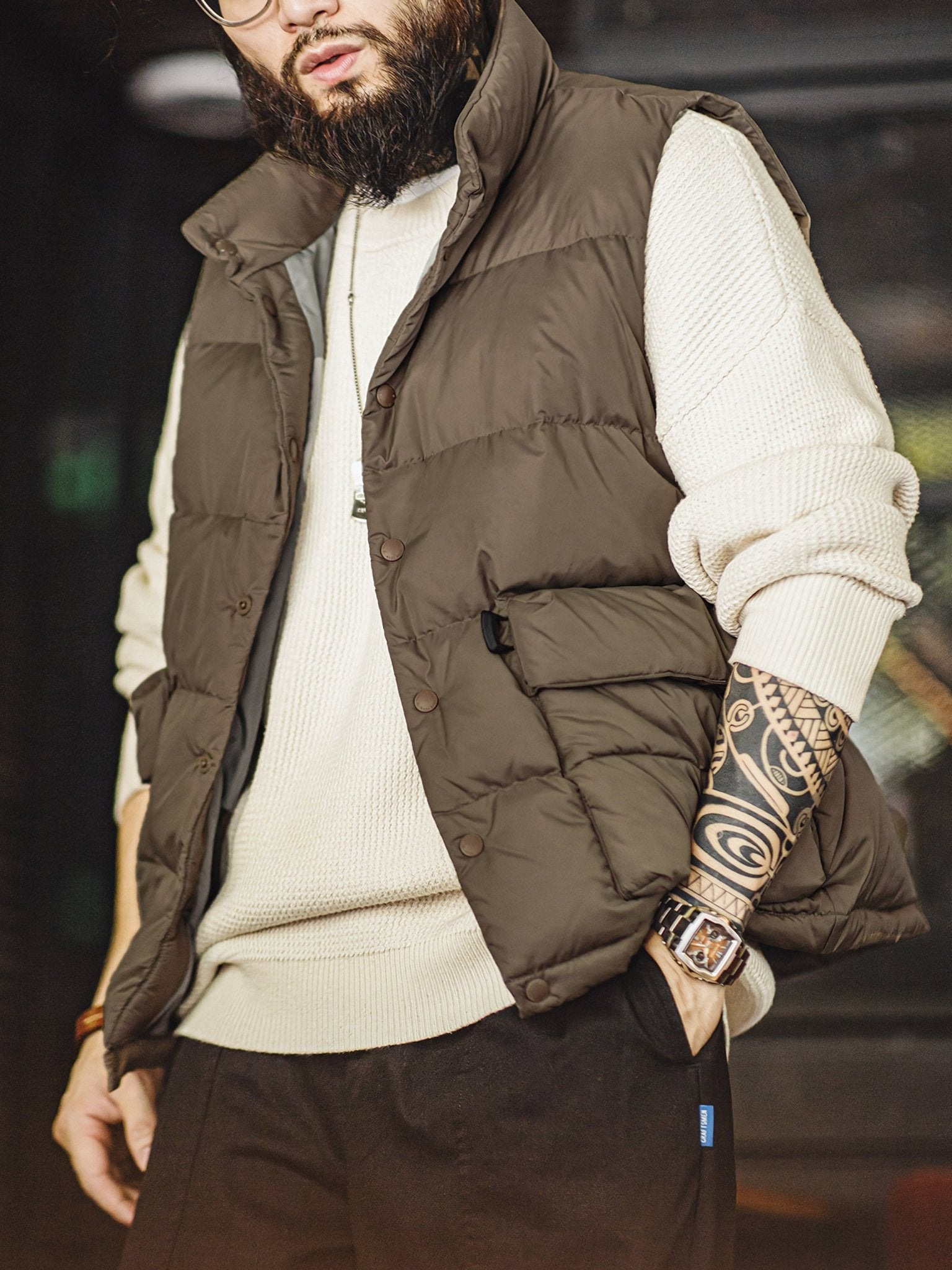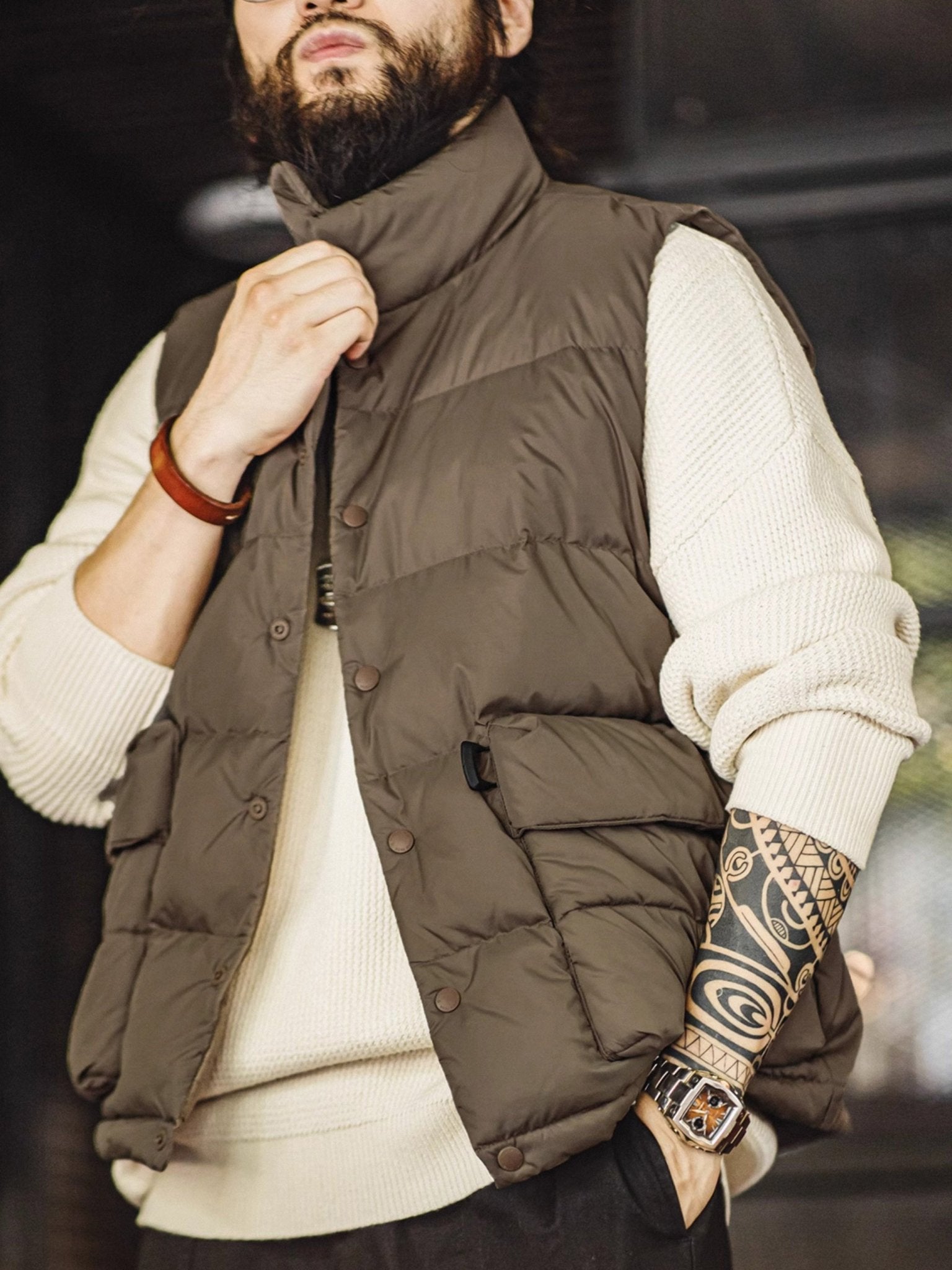 このベストはスタンドカラーデザインを採用しており、保温効果を発揮すると同時に全体のスタイルをより洗練されたものにします。両サイドの大きなポケットは小物の持ち運びに便利であり、多機能のフックはベストの実用性を向上させます。