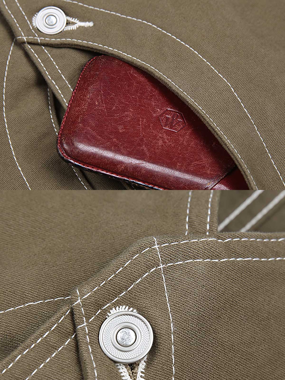 ベストの素材は耐摩耗性と快適性を重視して選ばれており、さまざまなアウトドア活動に適応します。実用的な複数のポケットは収納スペースを増やすだけでなく、ベストのワークウェアとしての特性も強調します。各ポケットの詳細な処理、例えばステッチやボタンは、ブランドの工芸への厳密な姿勢とレトロなディテールへの追求を反映しています。