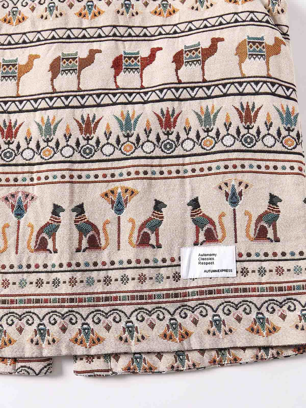エジプト壁画風のプリントデザインが施されたマルチポケットワークベストで、エキゾチックなヴィンテージ感を演出。