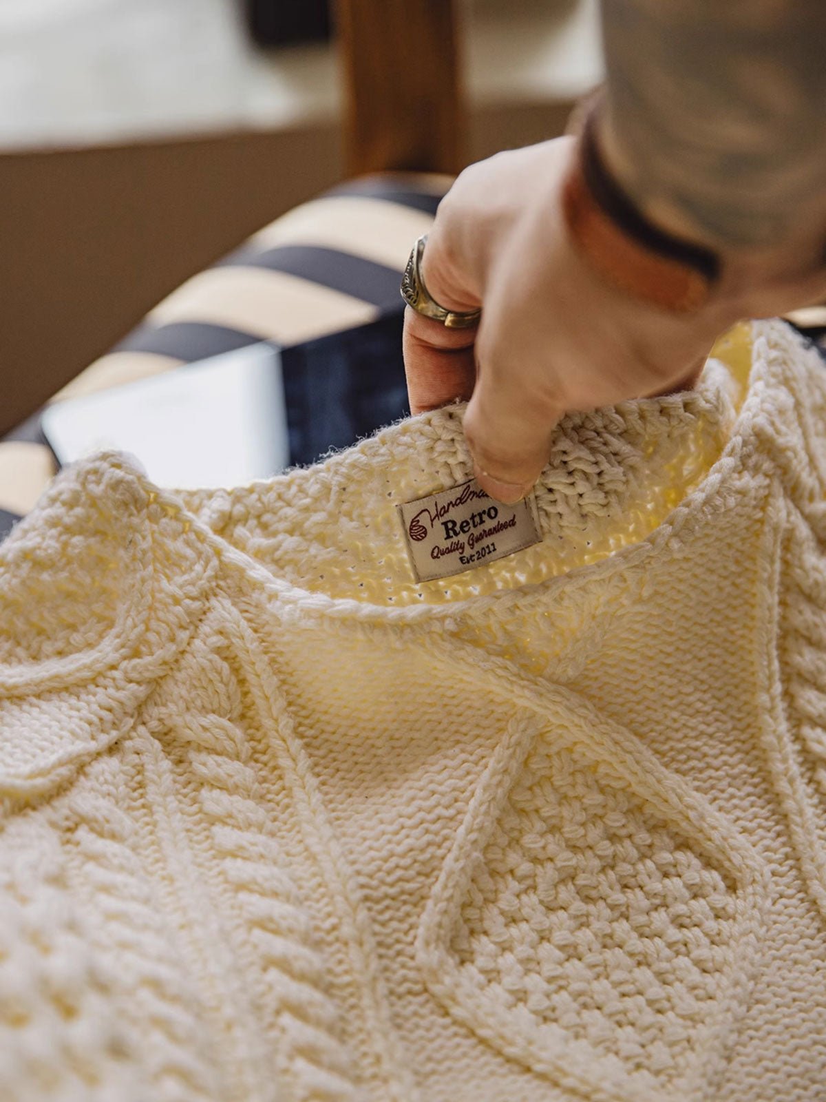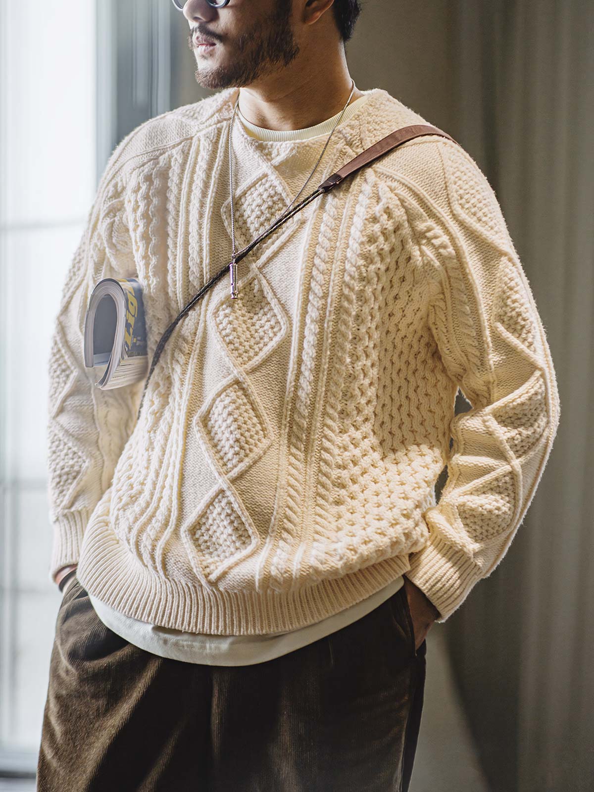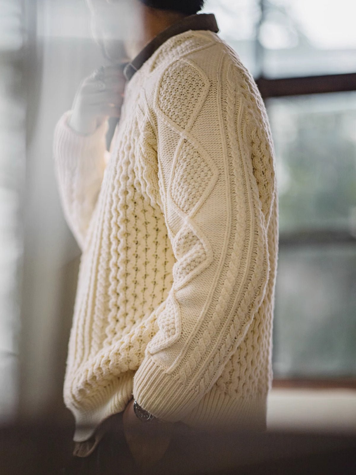 ディテールでは、セーターの繊細で階層的な編み模様が、手作業の精巧さと質感を強調しています。羊毛や混紡素材の使用は、セーターの保温性と快適さを保証し、また、メンテナンスも容易です。