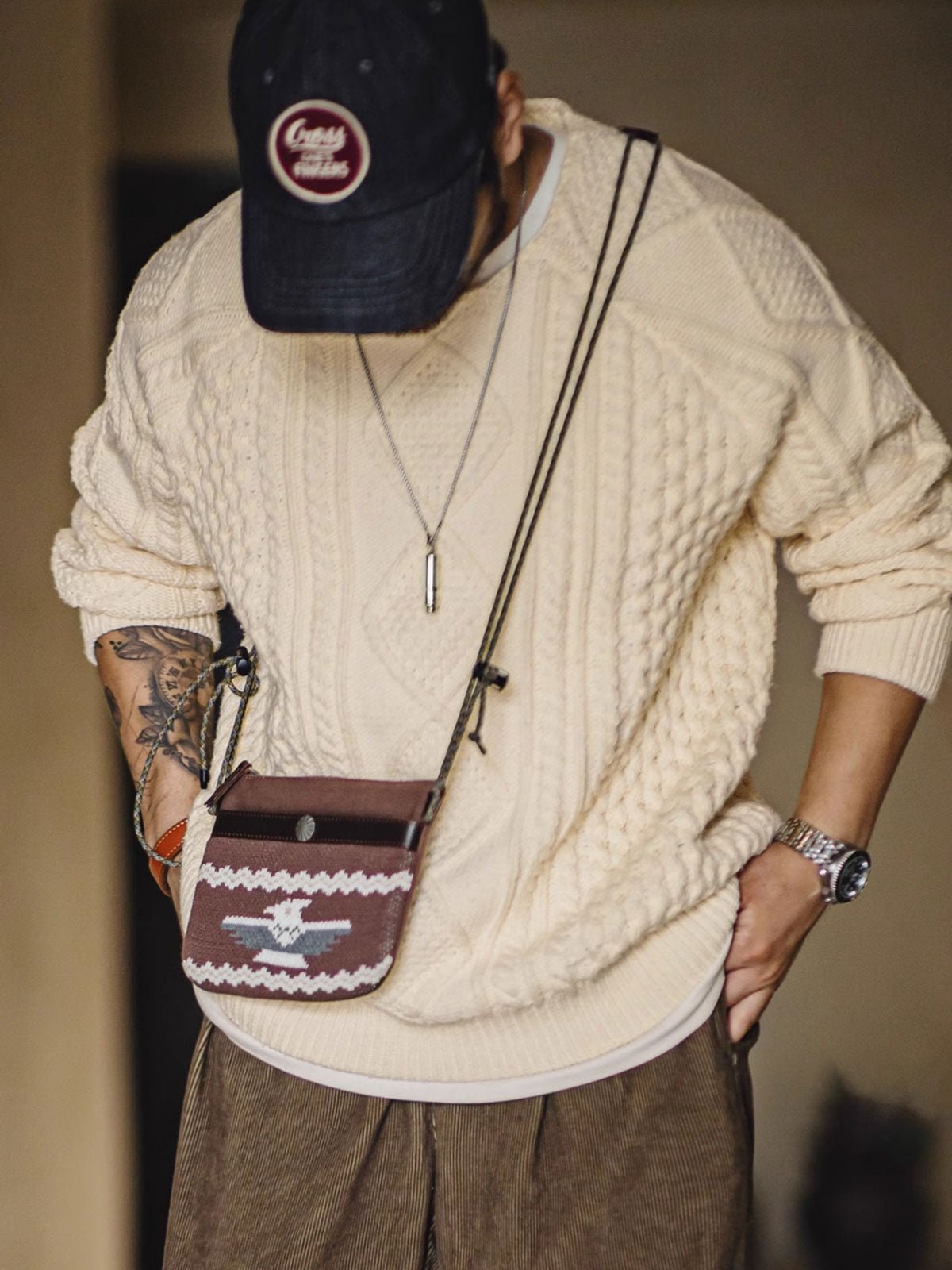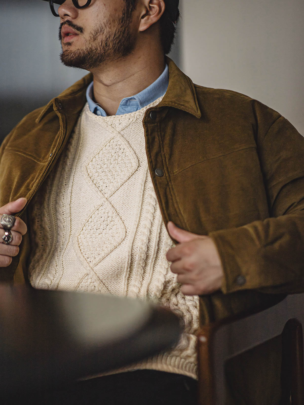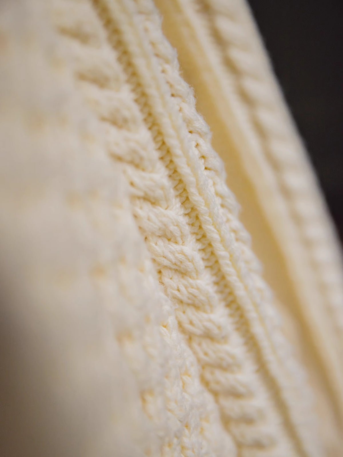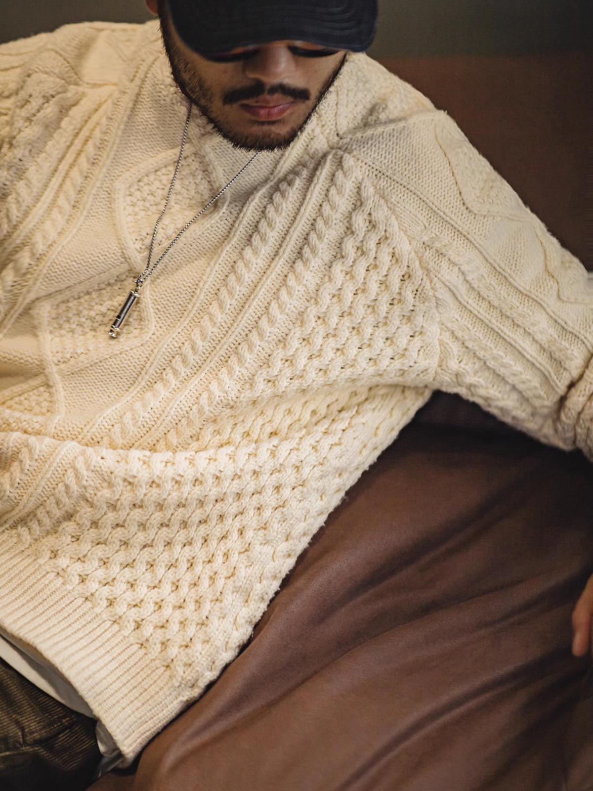 ディテールでは、セーターの繊細で階層的な編み模様が、手作業の精巧さと質感を強調しています。羊毛や混紡素材の使用は、セーターの保温性と快適さを保証し、また、メンテナンスも容易です。