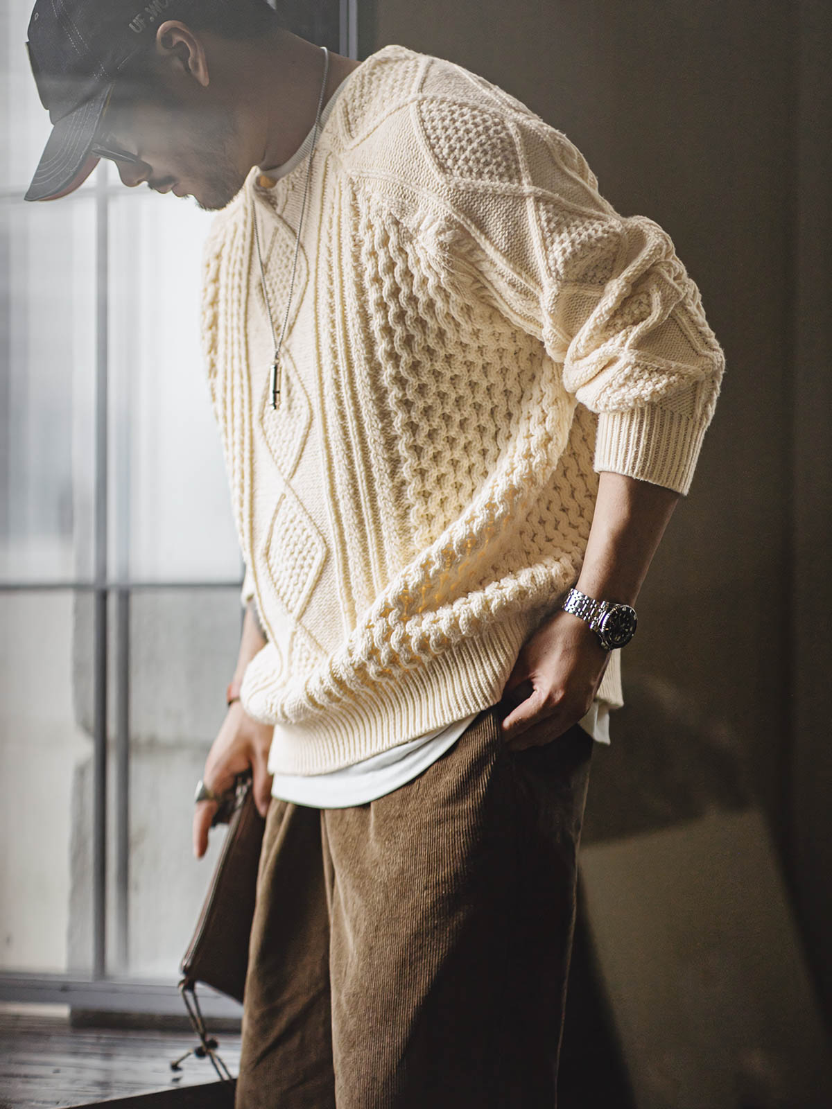セーターのナチュラルな色合いとレトロなスタイルは、ジーンズ、カジュアルパンツ、さらにはフォーマルパンツとの組み合わせにも容易です。単独で着用することもでき、寒い天気ではコートやジャケットと組み合わせて、レイヤードスタイルを演出することができます。