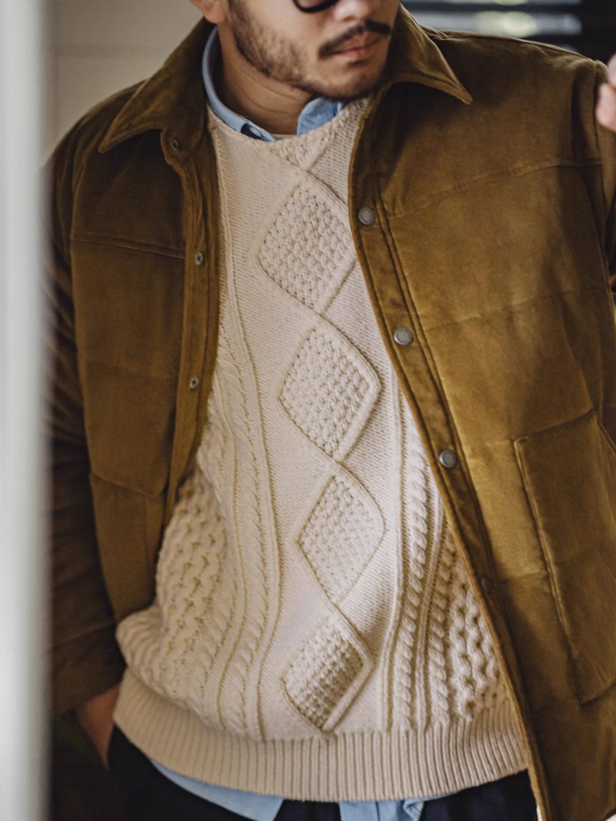 立体的なケーブルニットデザインと複雑な編み技術は、原始的な北欧の雰囲気を呈し、各模様には象徴的な意味があります。例えば、ケーブルは豊穣を、ダイヤモンドは島の地形を、ジグザグは島の小道を象徴しています。