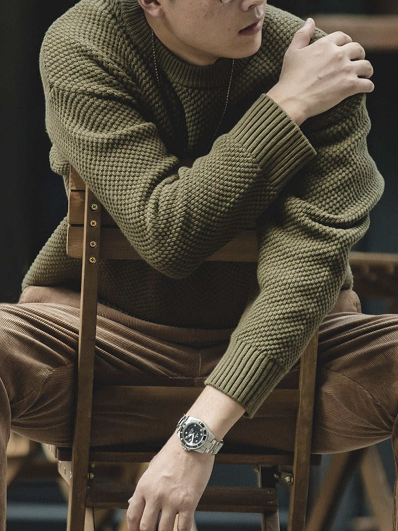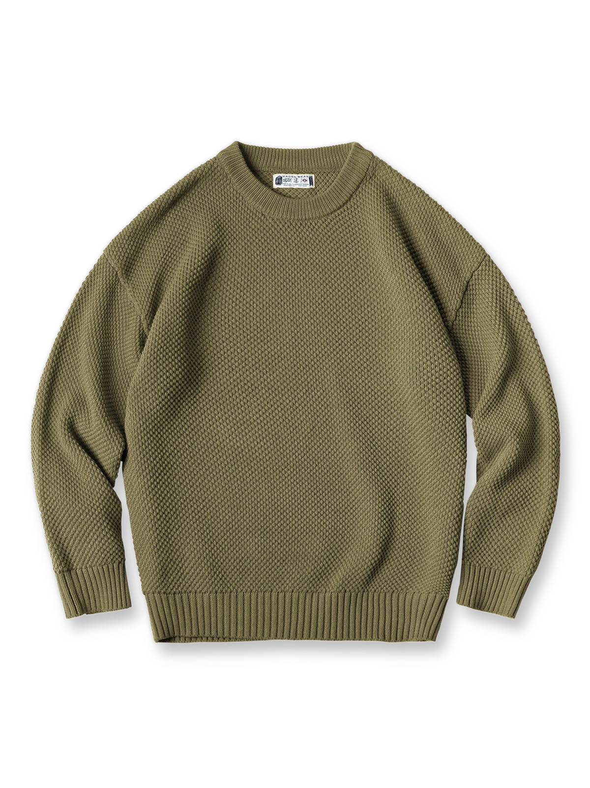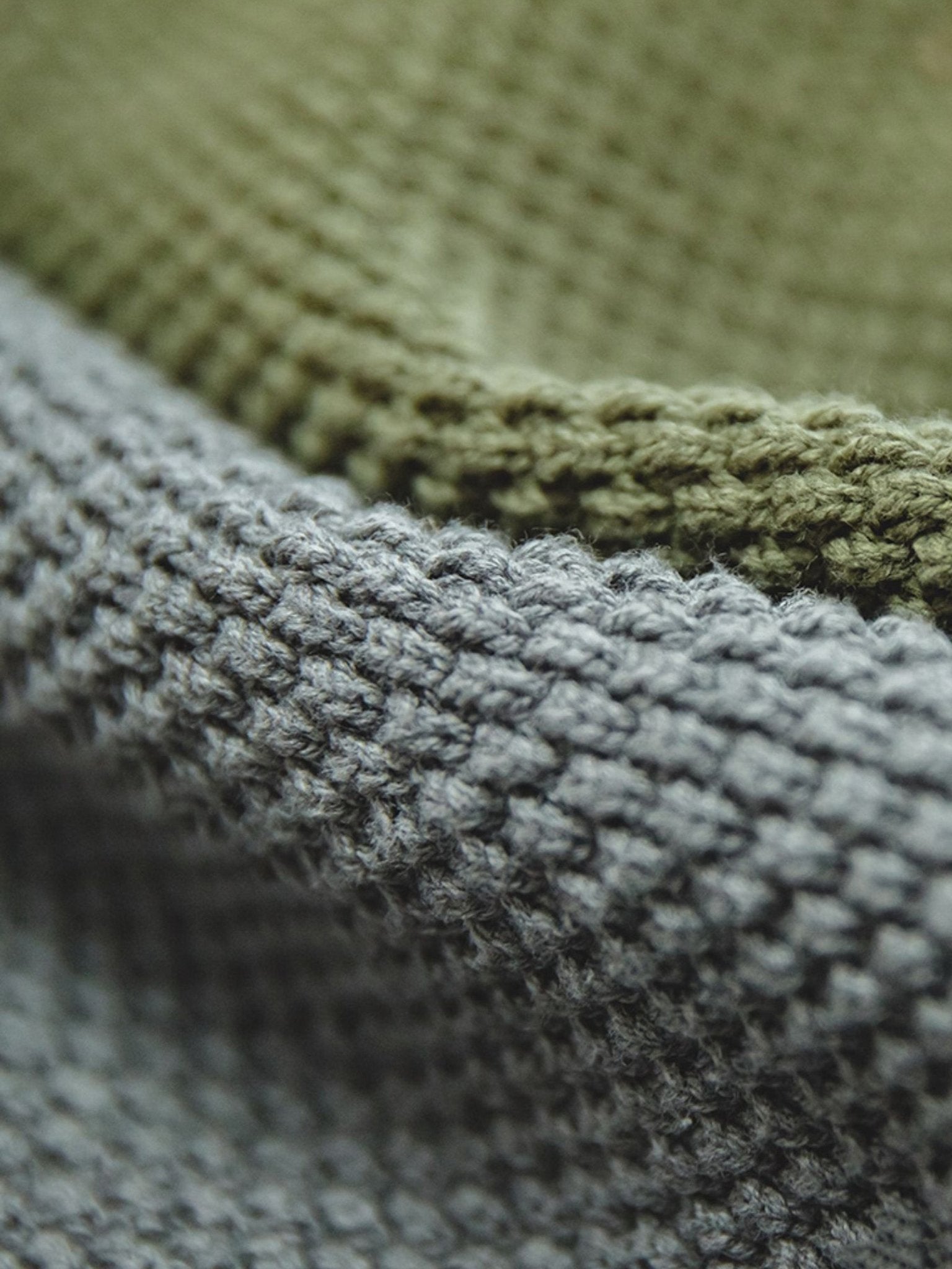 パイナップルステッチは衣類に凹凸をもたらし、全体的に奥行きを感じさせます。リブ編みの襟、袖口、そして裾の仕上げは、職人技の粋を表現しています。