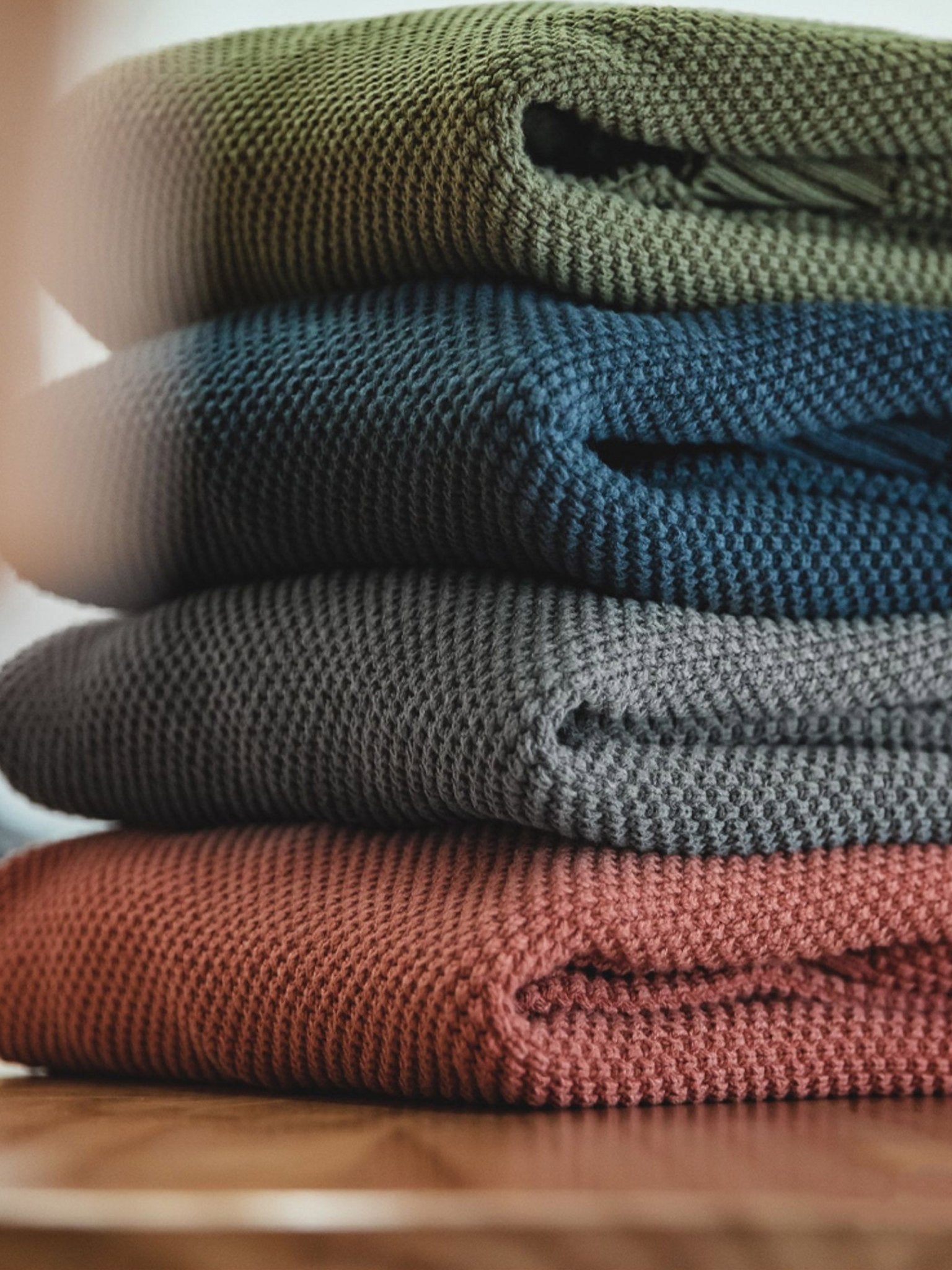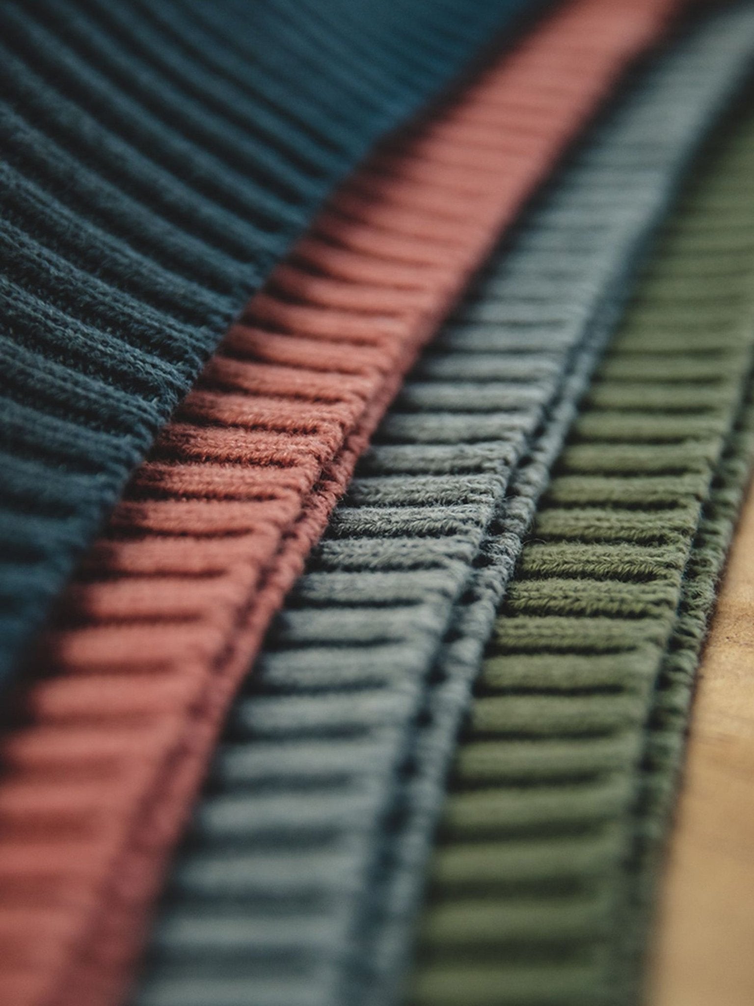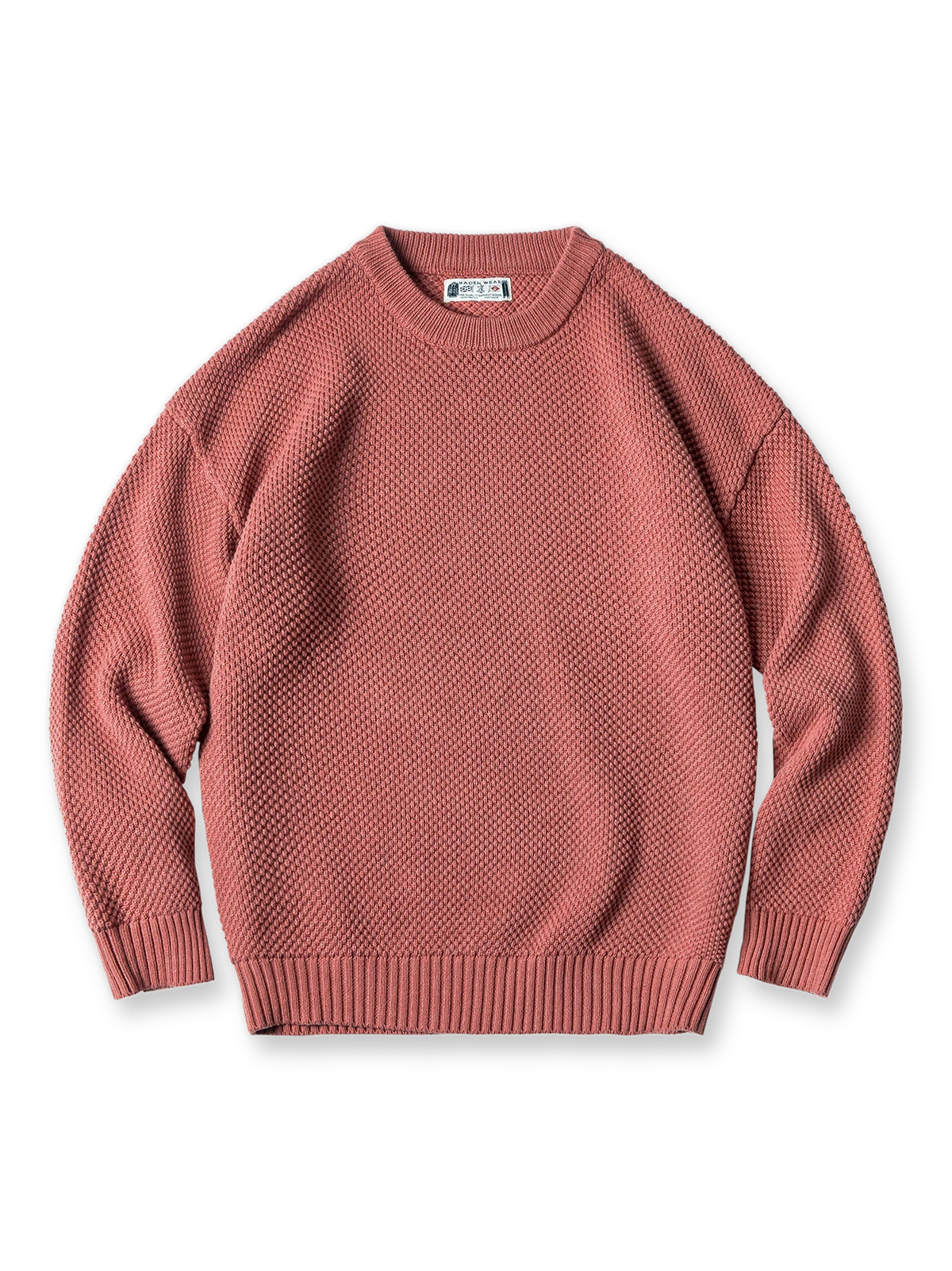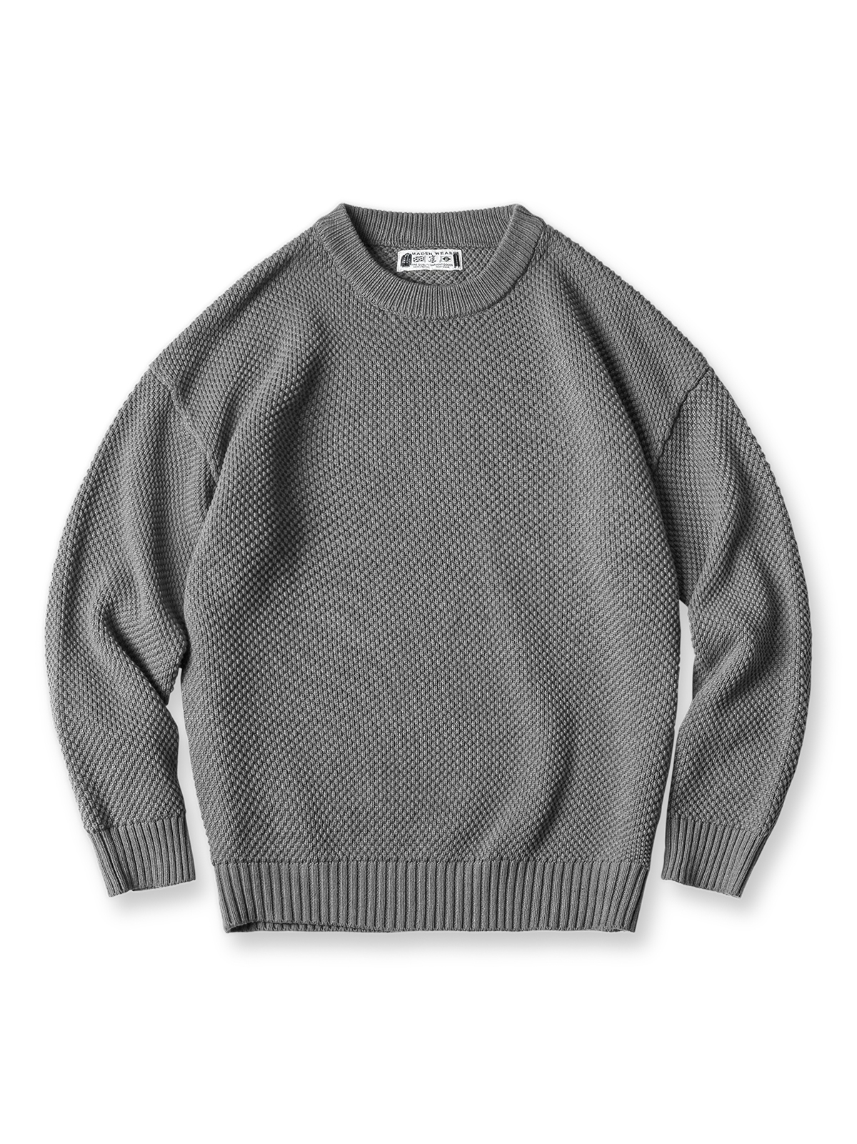 パイナップルステッチは衣類に凹凸をもたらし、全体的に奥行きを感じさせます。リブ編みの襟、袖口、そして裾の仕上げは、職人技の粋を表現しています。