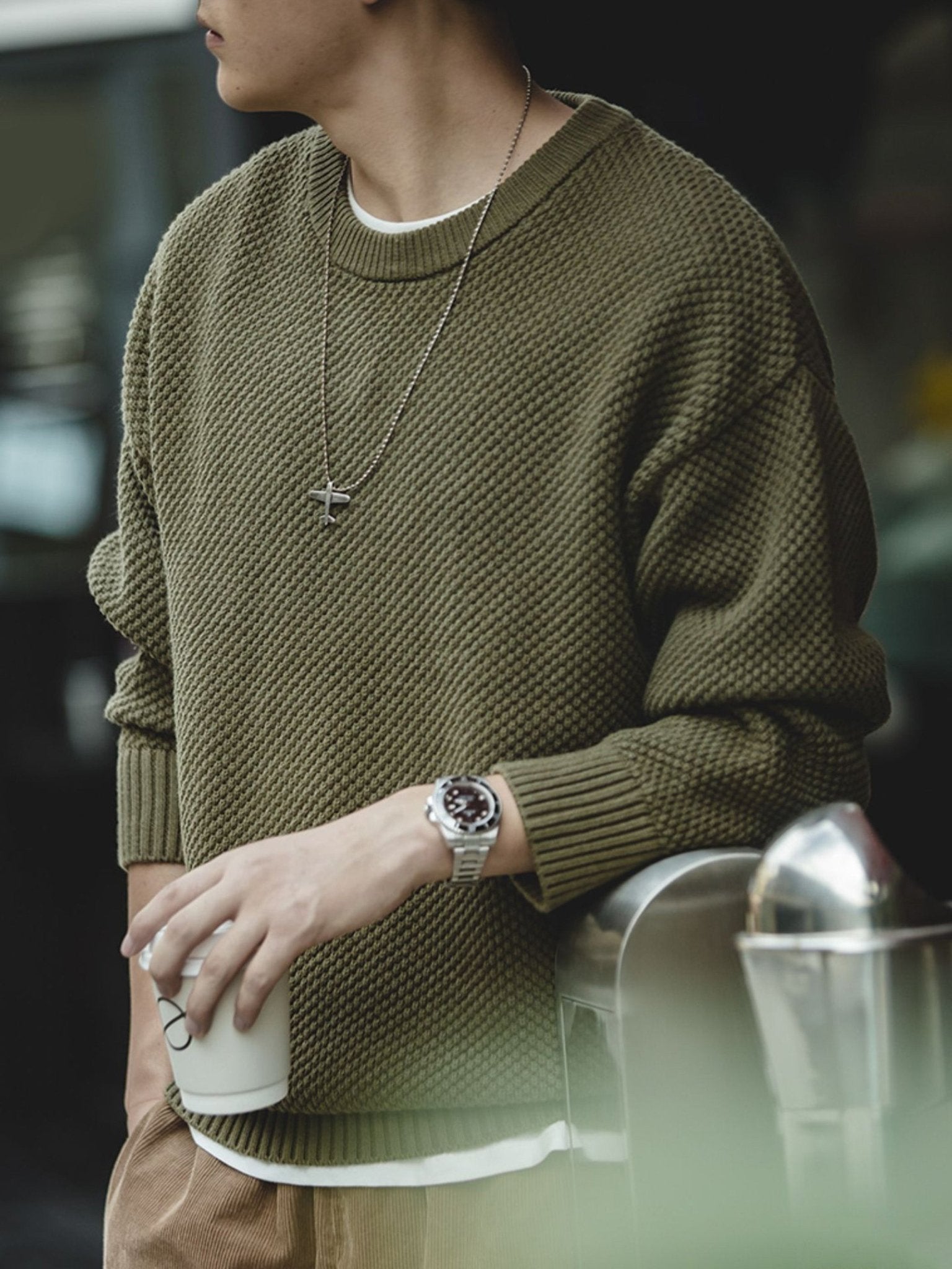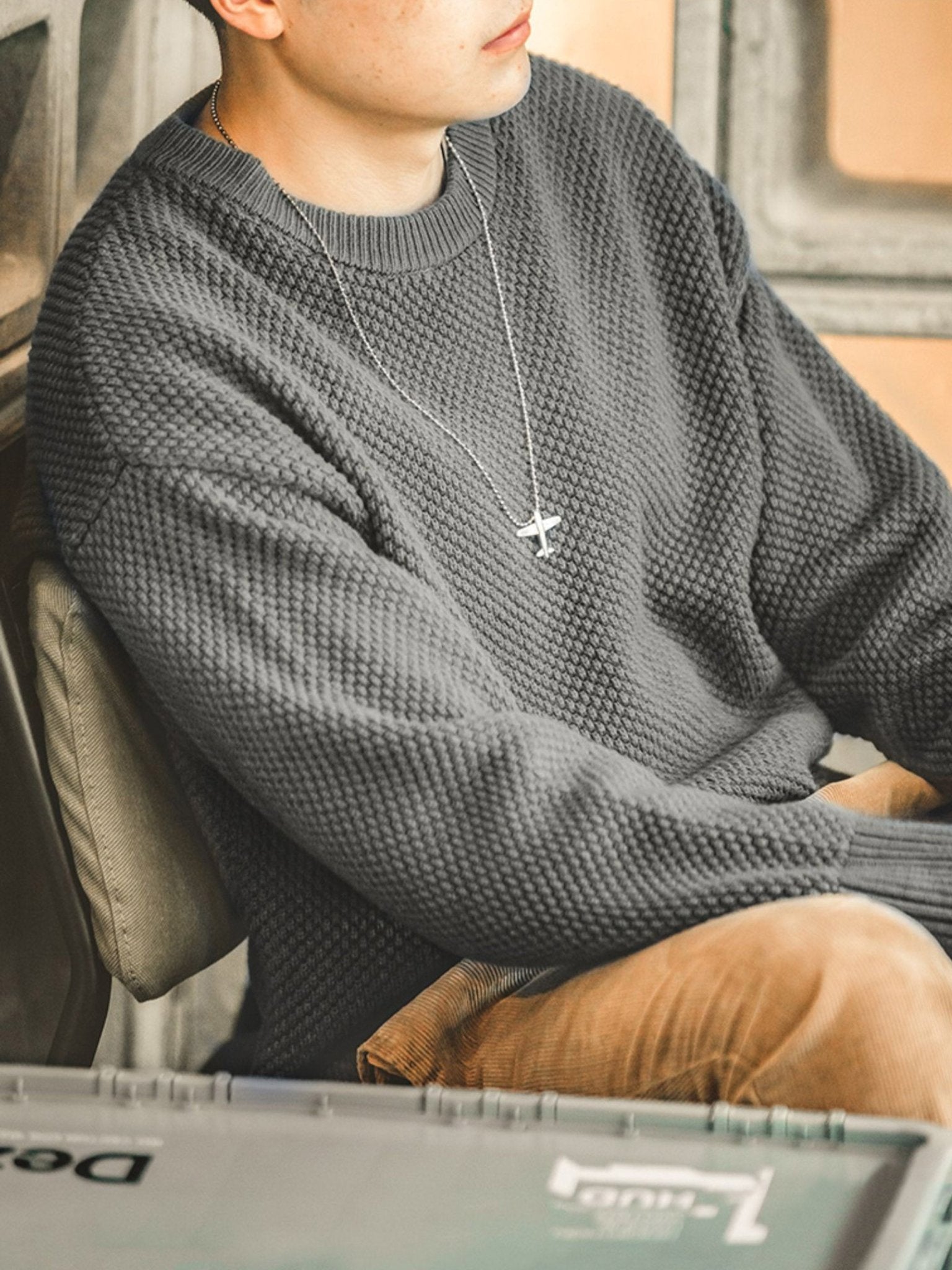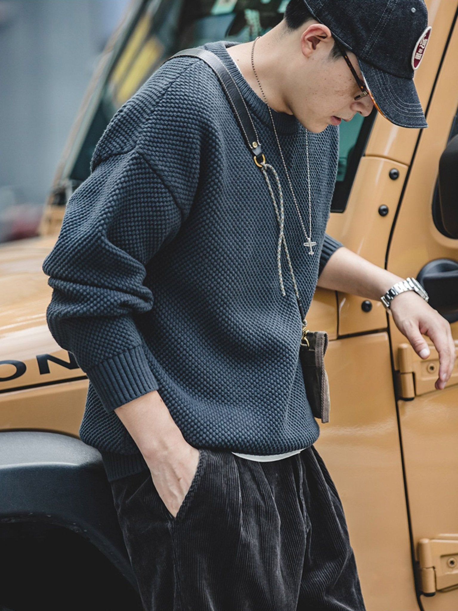 このセーターはパイナップルステッチと呼ばれる立体的な編み方を使用し、凹凸のある模様を生み出しています。リブ編みの襟、袖口、そして裾の仕上げは、職人技の粋を表現しています。クラシックなドロップショルダーデザインは、上半身を引き締め、洗練されたスタイルを演出します。