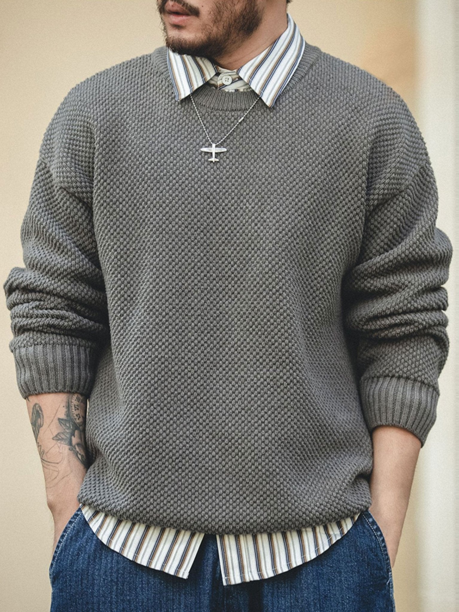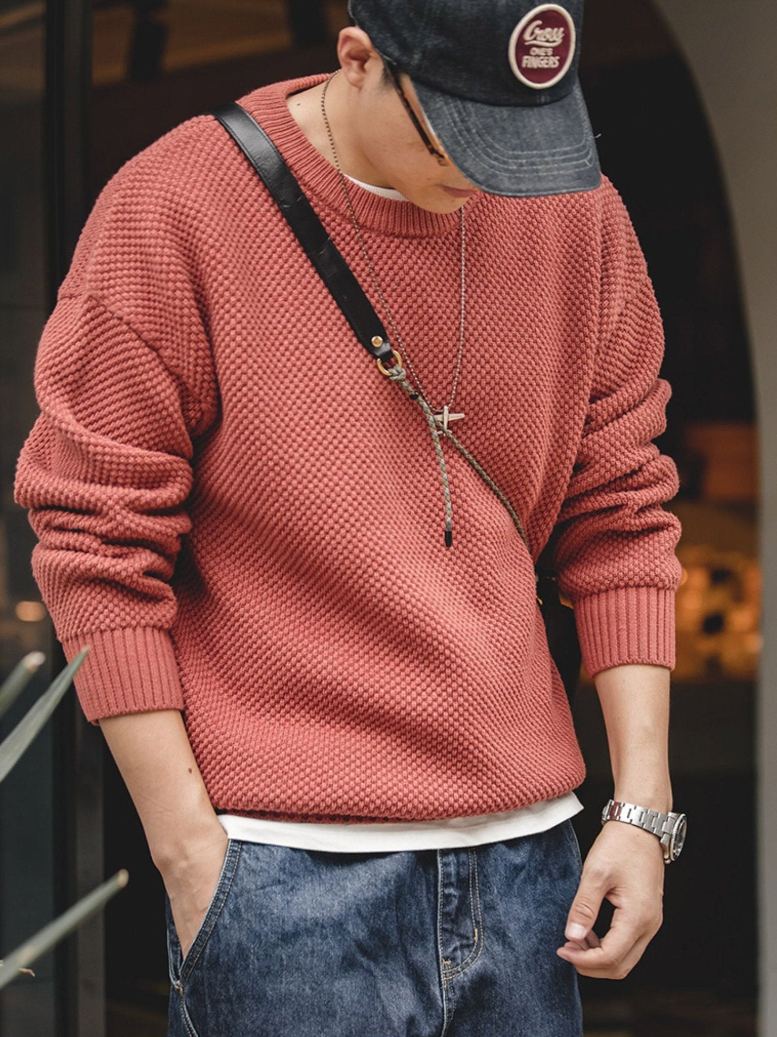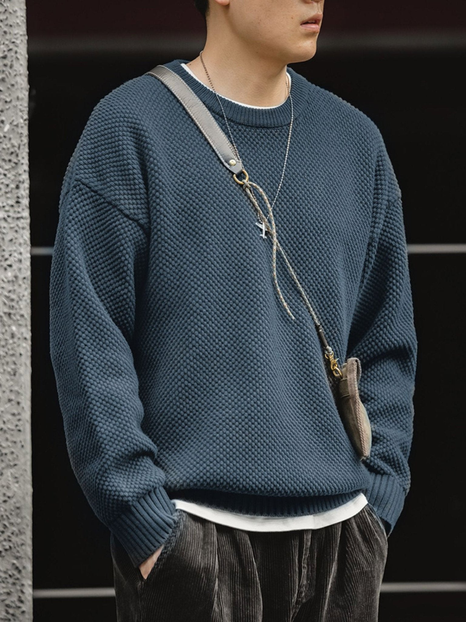 このセーターはパイナップルステッチと呼ばれる立体的な編み方を使用し、凹凸のある模様を生み出しています。リブ編みの襟、袖口、そして裾の仕上げは、職人技の粋を表現しています。クラシックなドロップショルダーデザインは、上半身を引き締め、洗練されたスタイルを演出します。