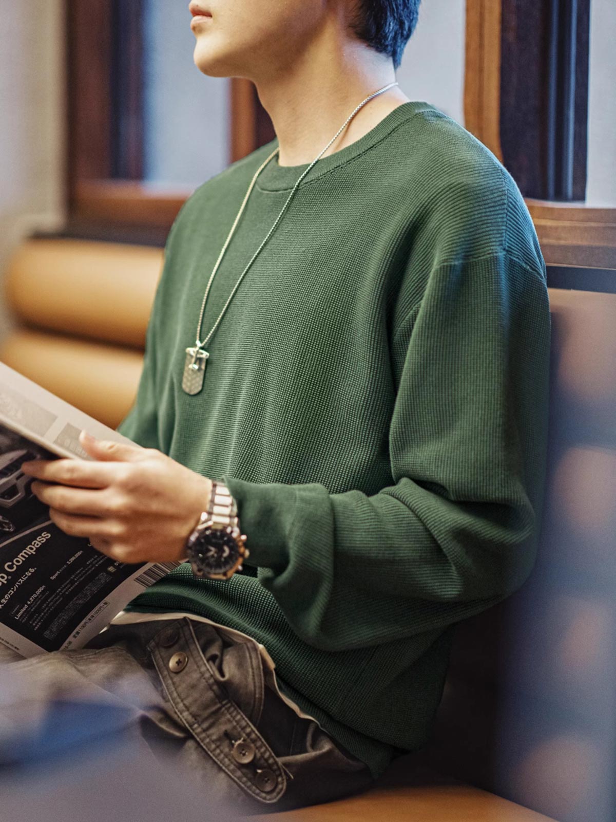 スウェットの素材は、高品質の混合繊維を使用し、耐久性を強調すると同時に、テクスチャニットによって繊細な質感を見せています。さらに、ディテールの小さなロゴは、ブランド認知の精緻さを加えています。