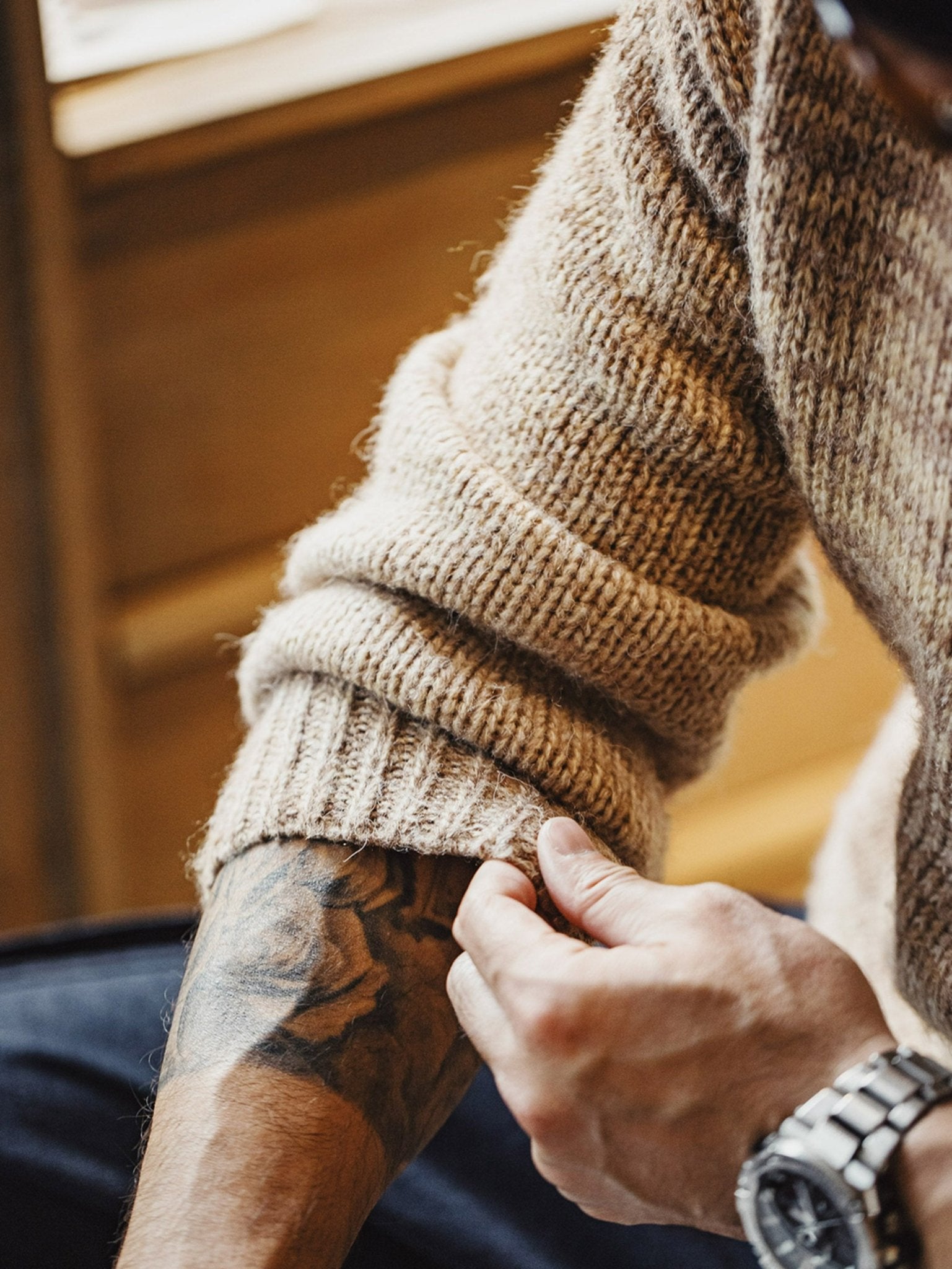 特殊な染色グラデーション糸を使用し、熟練された針編み技術によって、不規則な「グラデーションスノーフィールド」が形成されます。