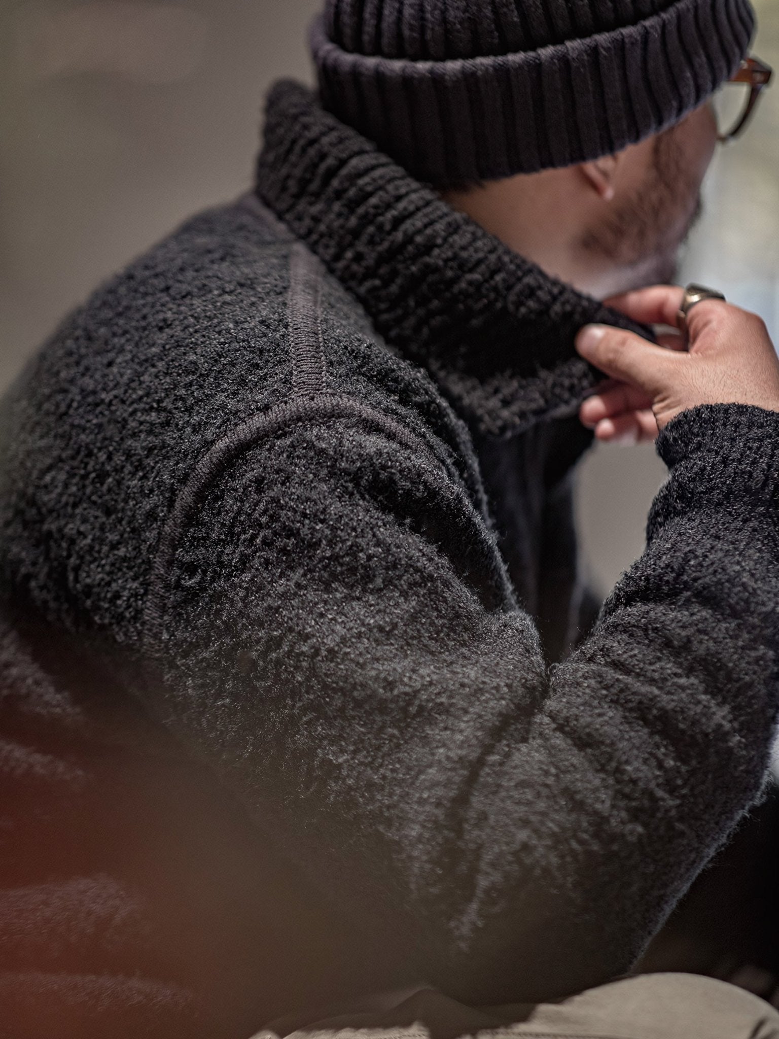 高品質なジャガード織りを使用しており、さらりとした着心地と共に自然な立体感を提供します。快適さとスタイルを両立した、今季注目のニットアイテムです。