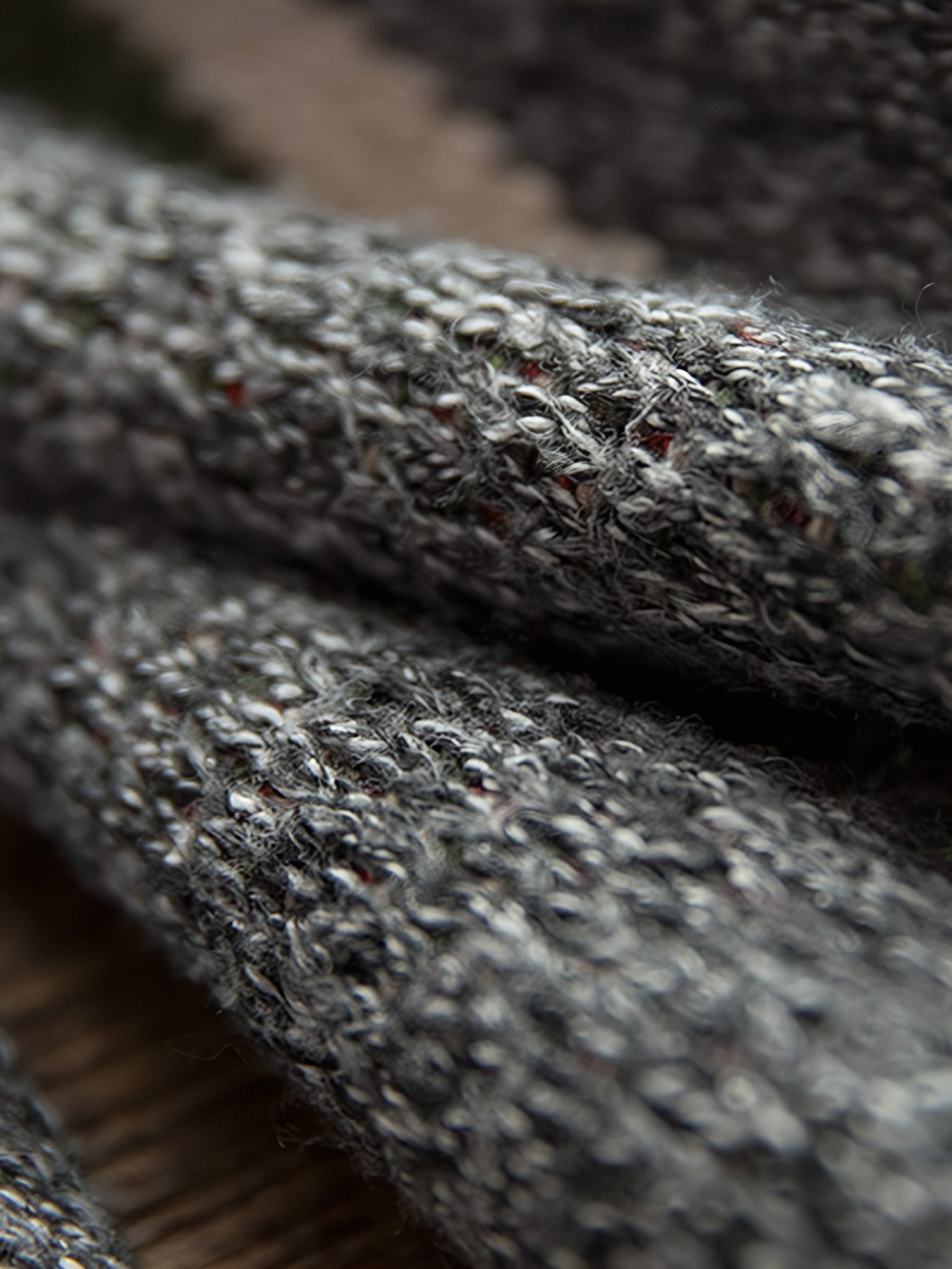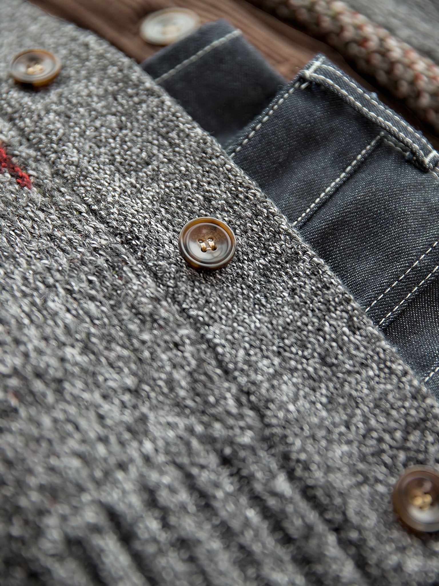 このセーターはゴマ状の技法を使用し、密な縫い目で四色対称の幾何学模様を表現し、独特のシングルボタンデザインとストレートな裾デザインを採用して、伝統的な手工芸の深い歴史を示しています。