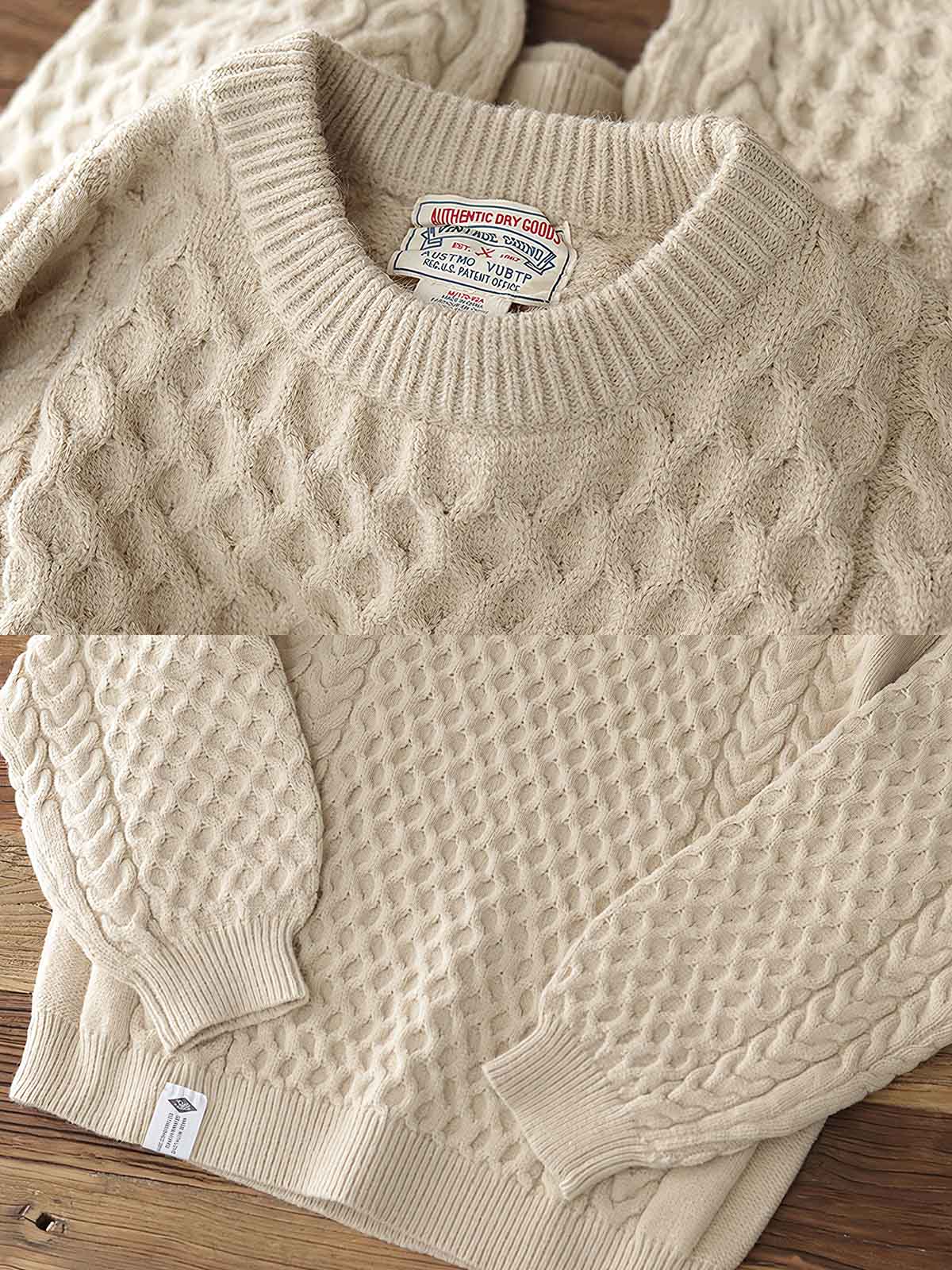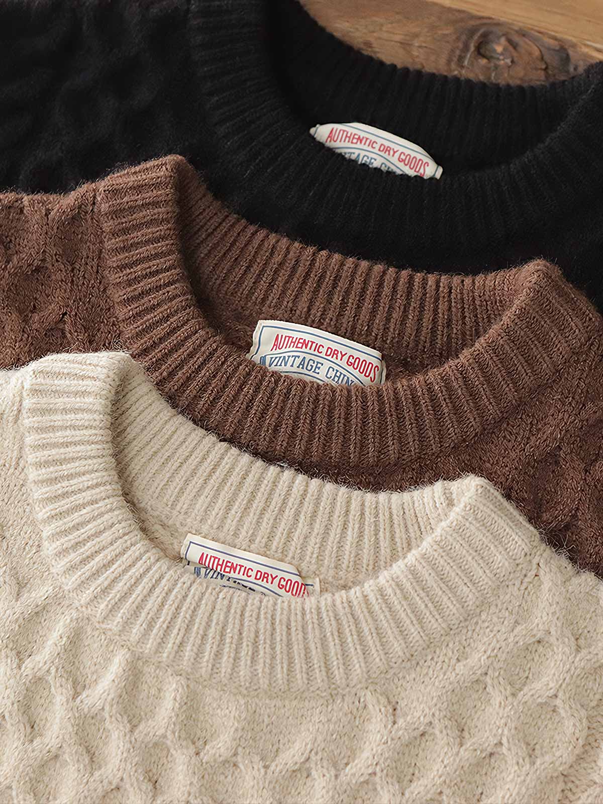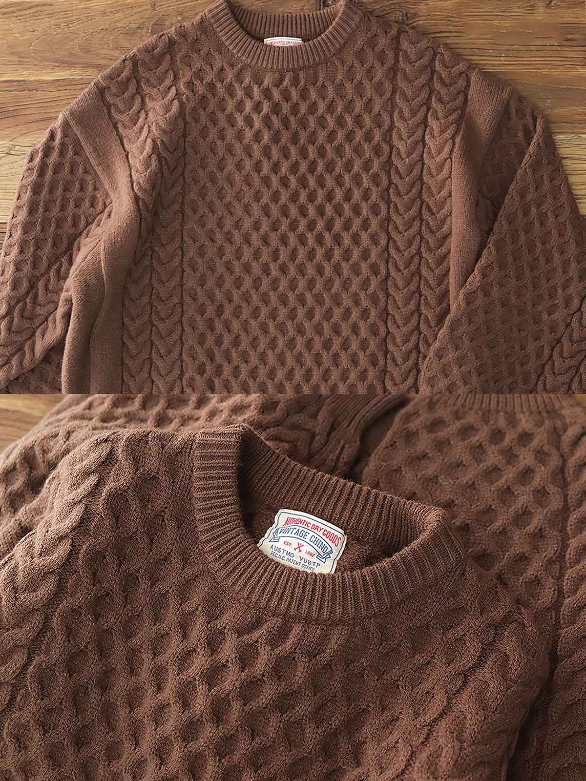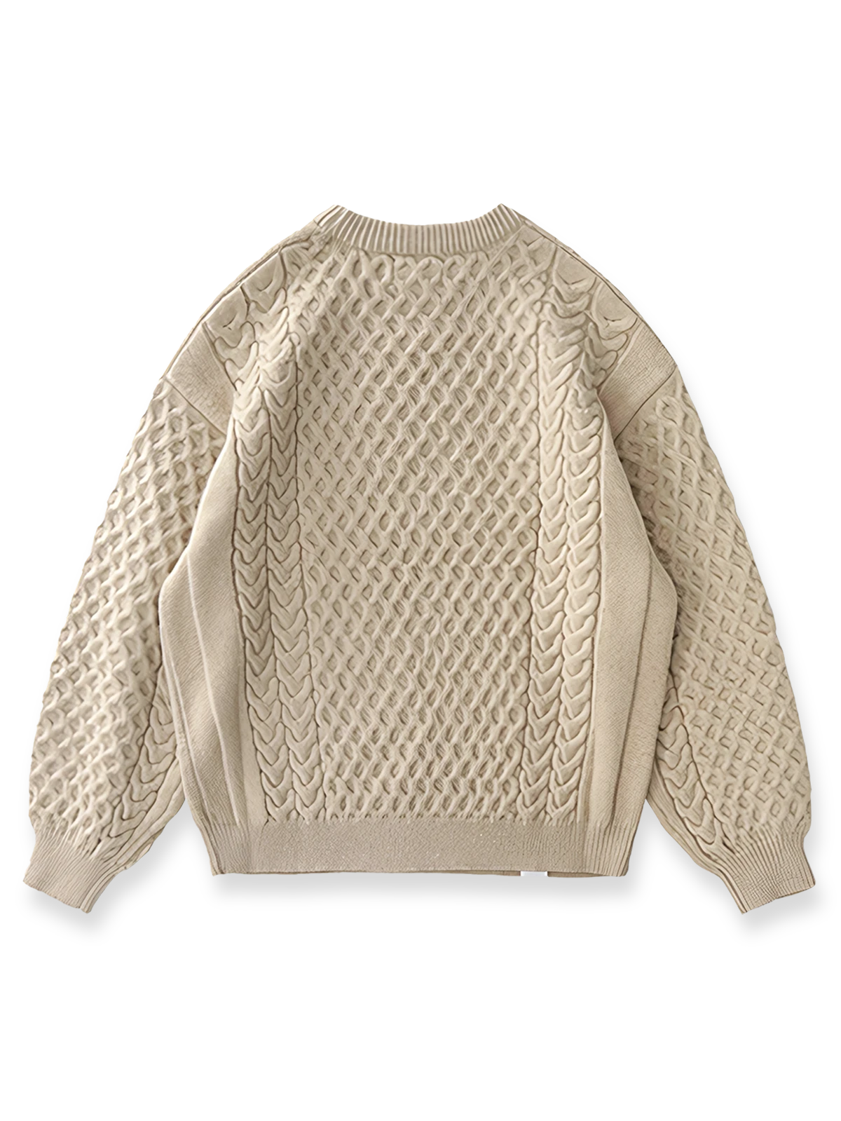 ヴィンテージ感のある粗めのツイスト編みデザインと、ゆったりとしたバルーンスリーブが温かくリラックスした着心地を提供。