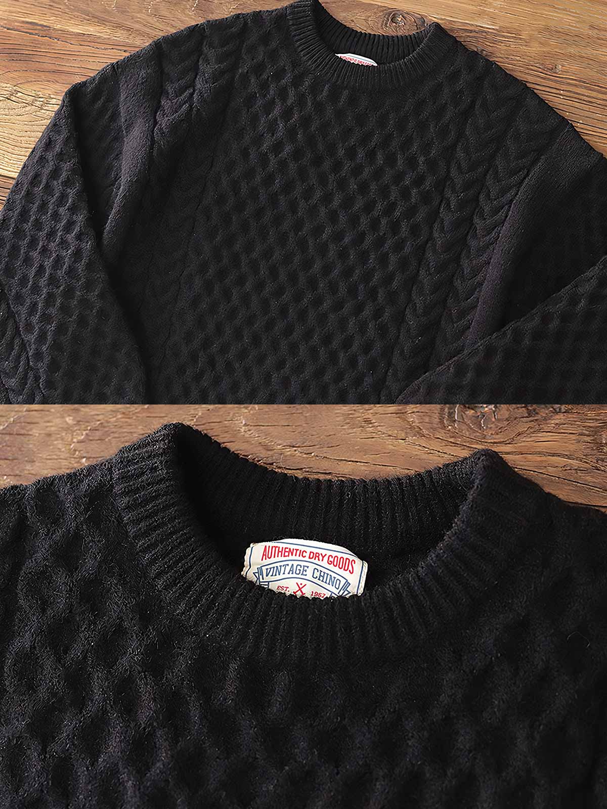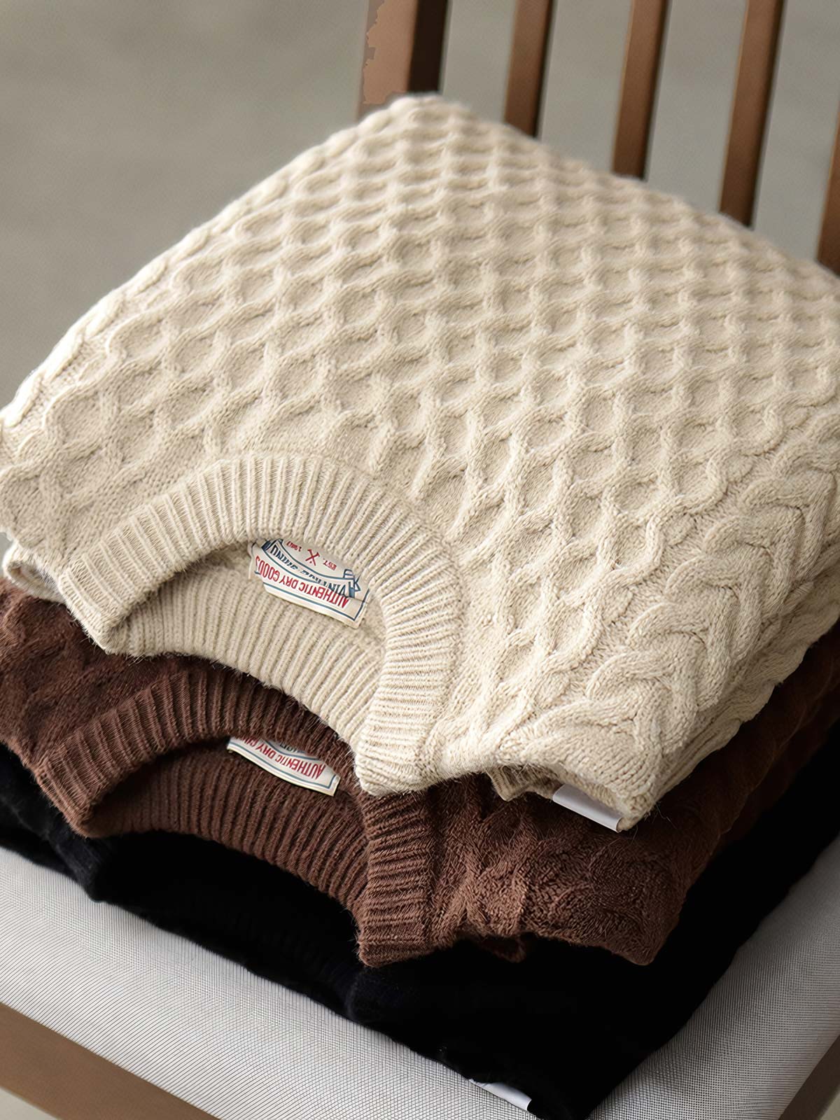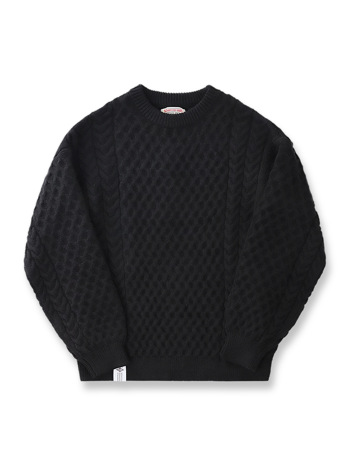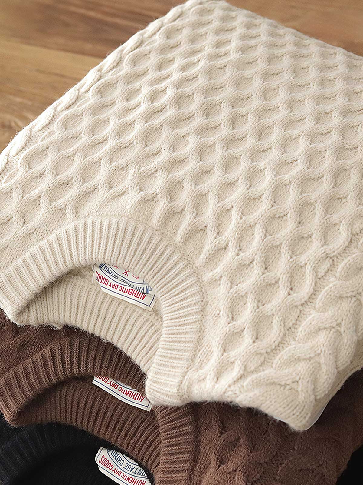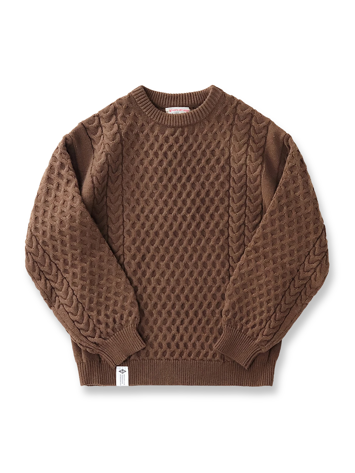 ヴィンテージ感のある粗めのツイスト編みデザインと、ゆったりとしたバルーンスリーブが温かくリラックスした着心地を提供。