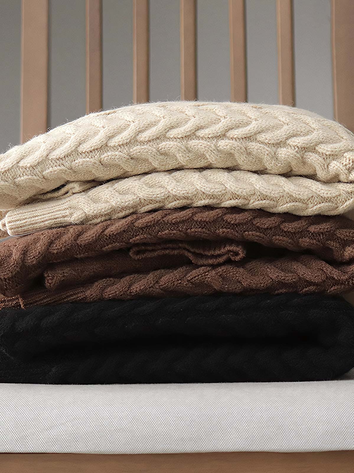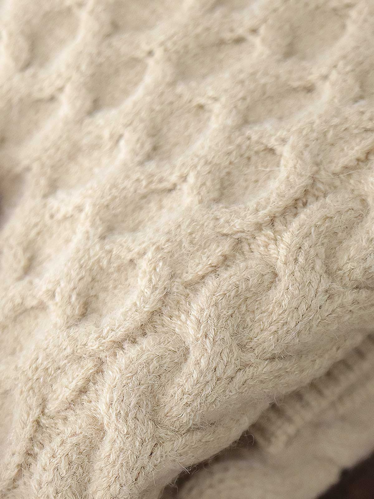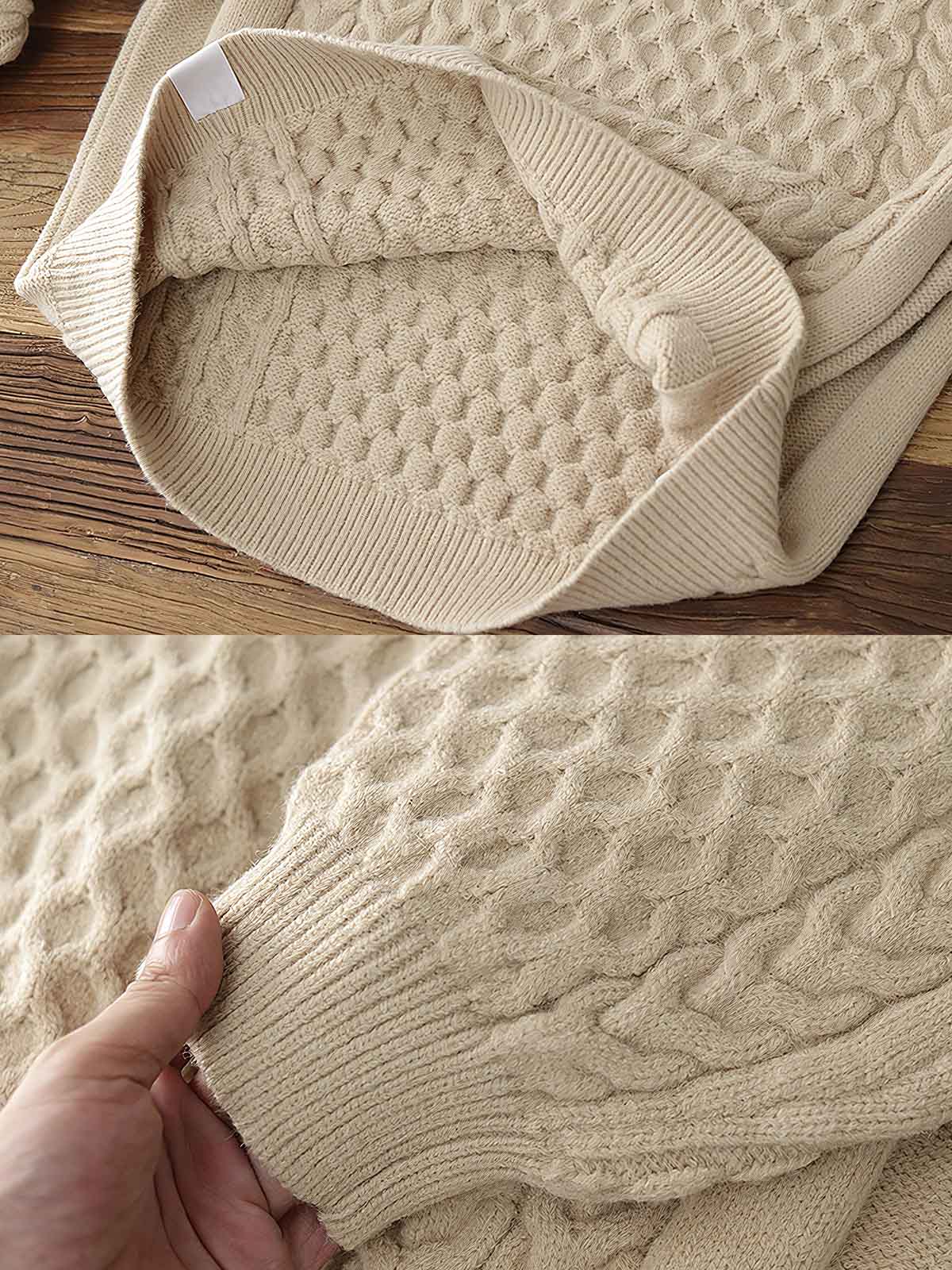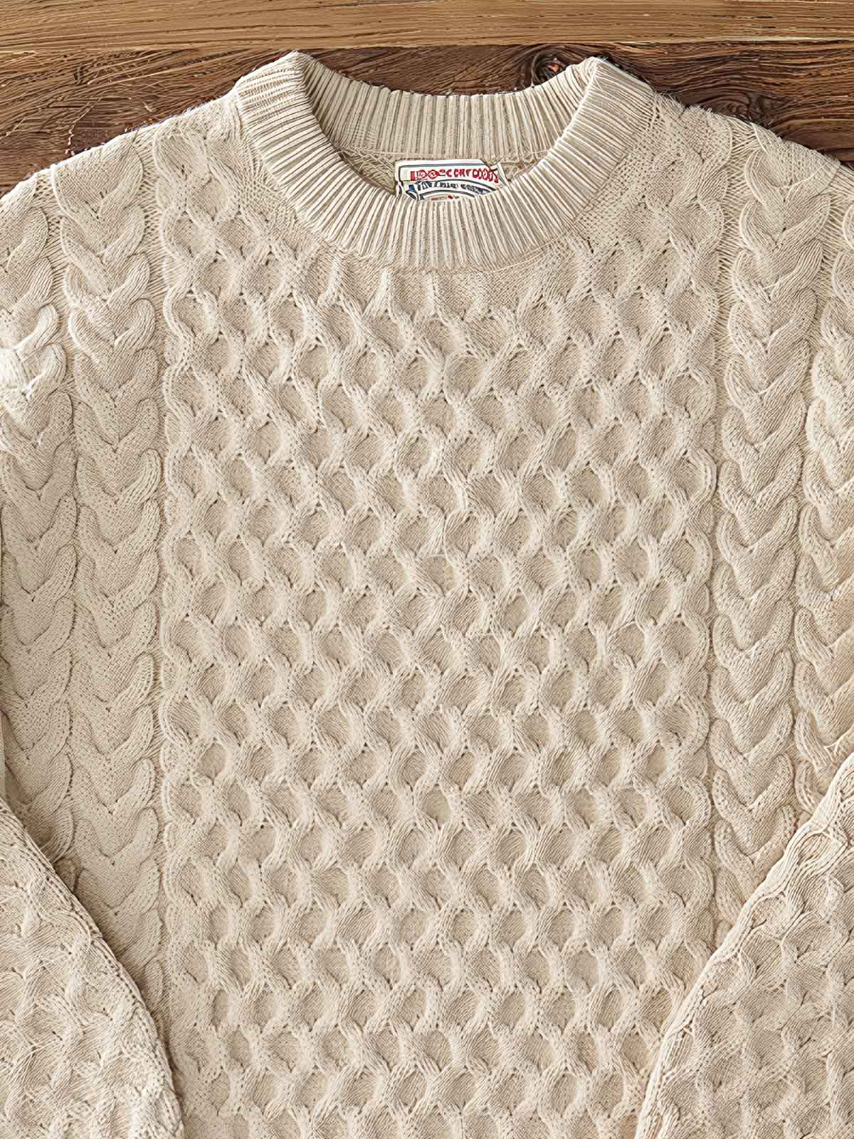 ヴィンテージ感のある粗めのツイスト編みデザインと、ゆったりとしたバルーンスリーブが温かくリラックスした着心地を提供。