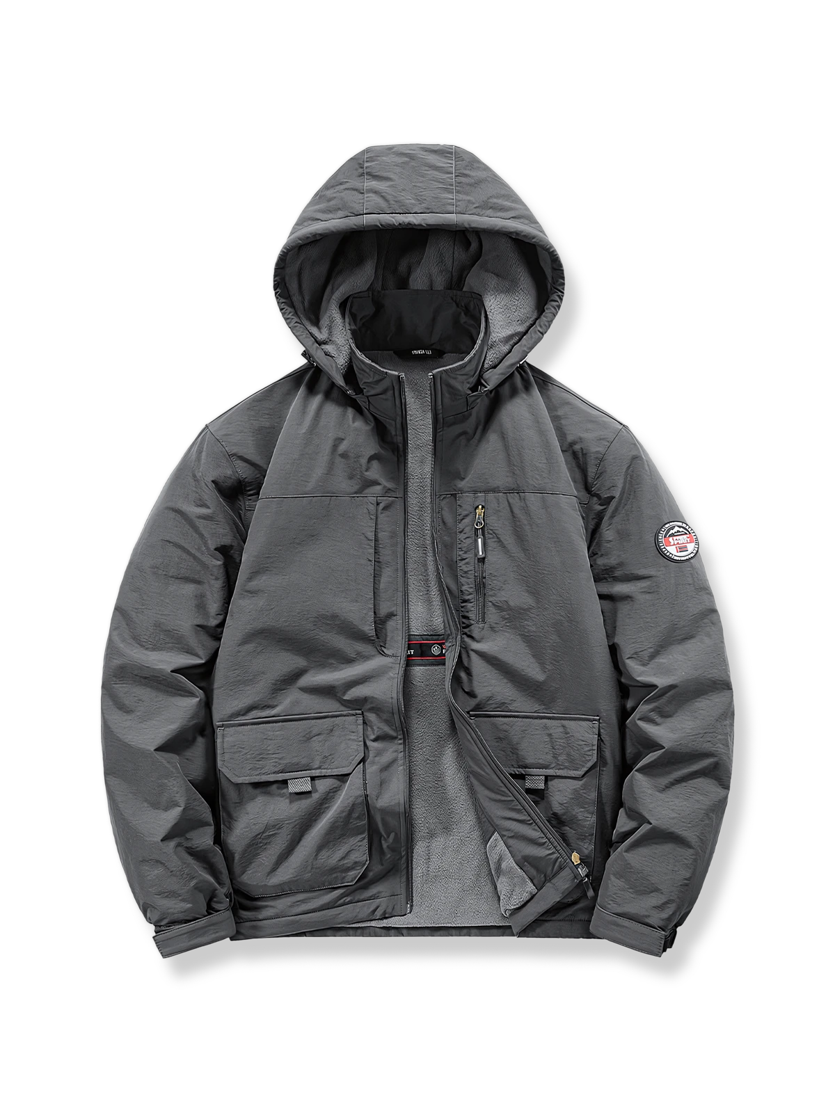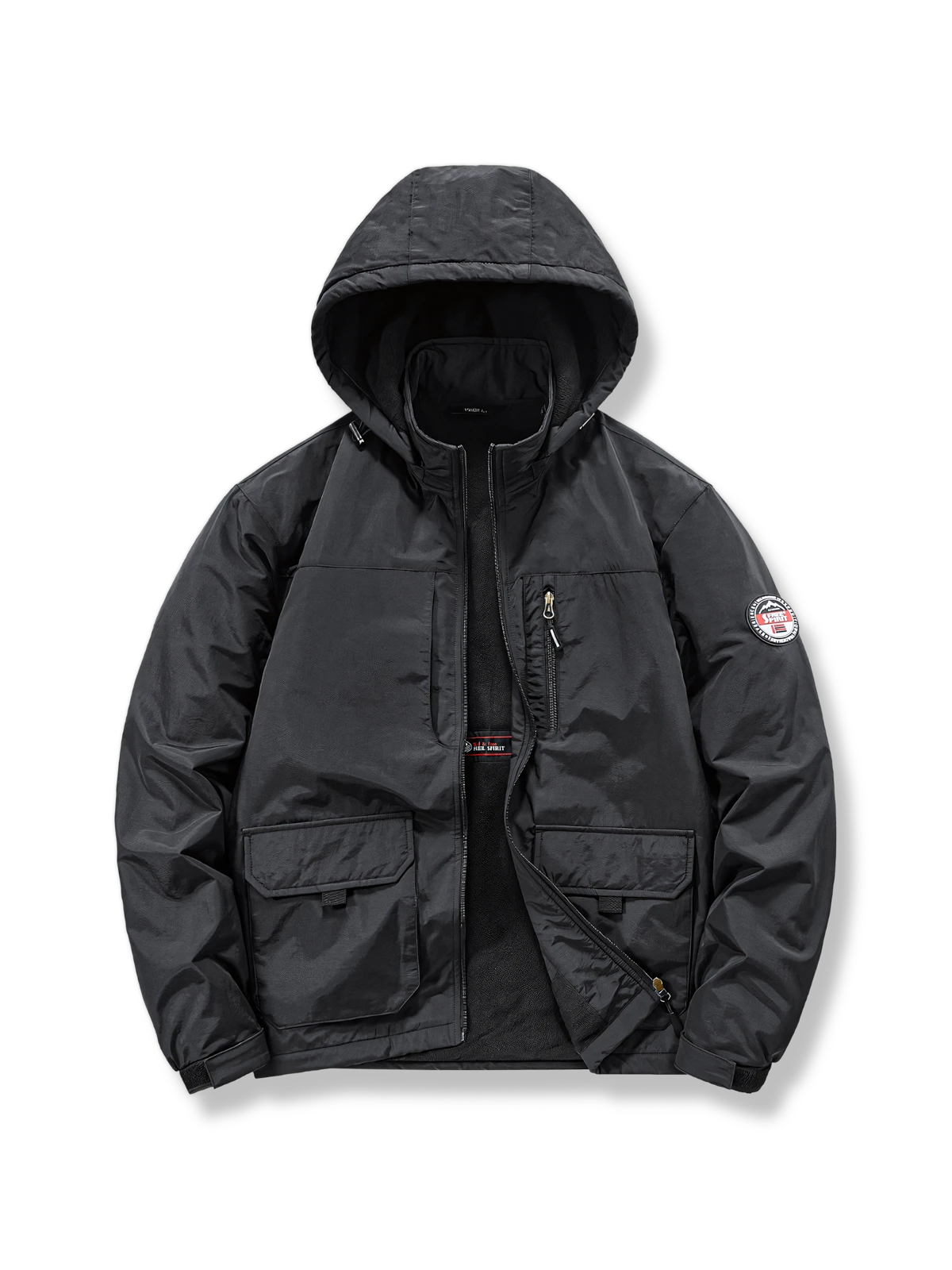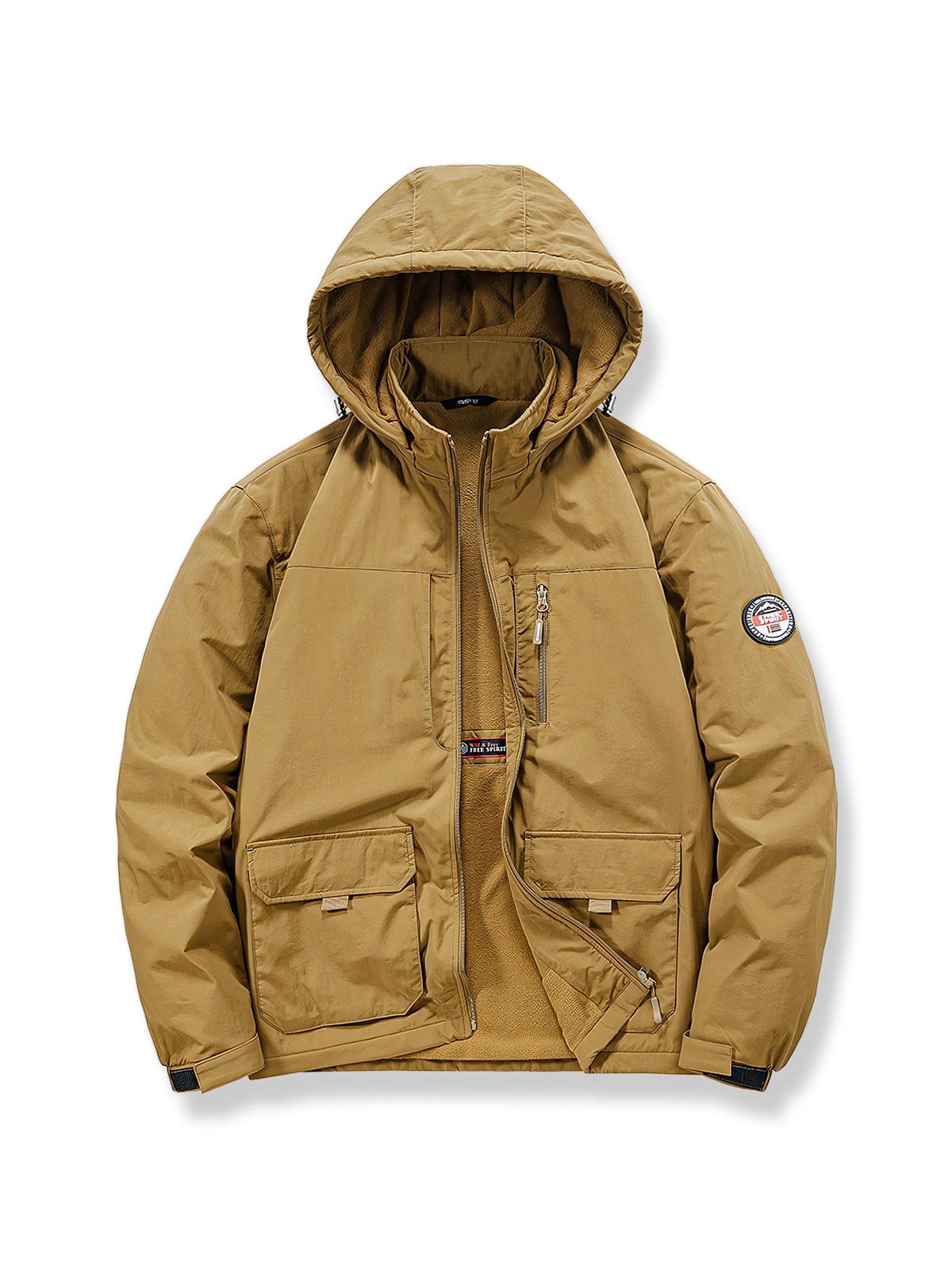ジャケットには、風を防ぐ外層素材を使用し、内部には保温層を追加しています。これにより防風効果が高まりつつ、軽さも保持されています。多くのポケットは、様々な小物を持ち運ぶのに便利で、実用性を提供します。