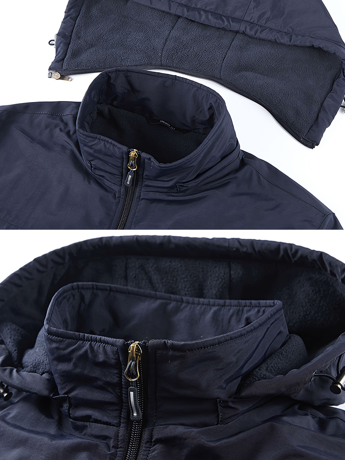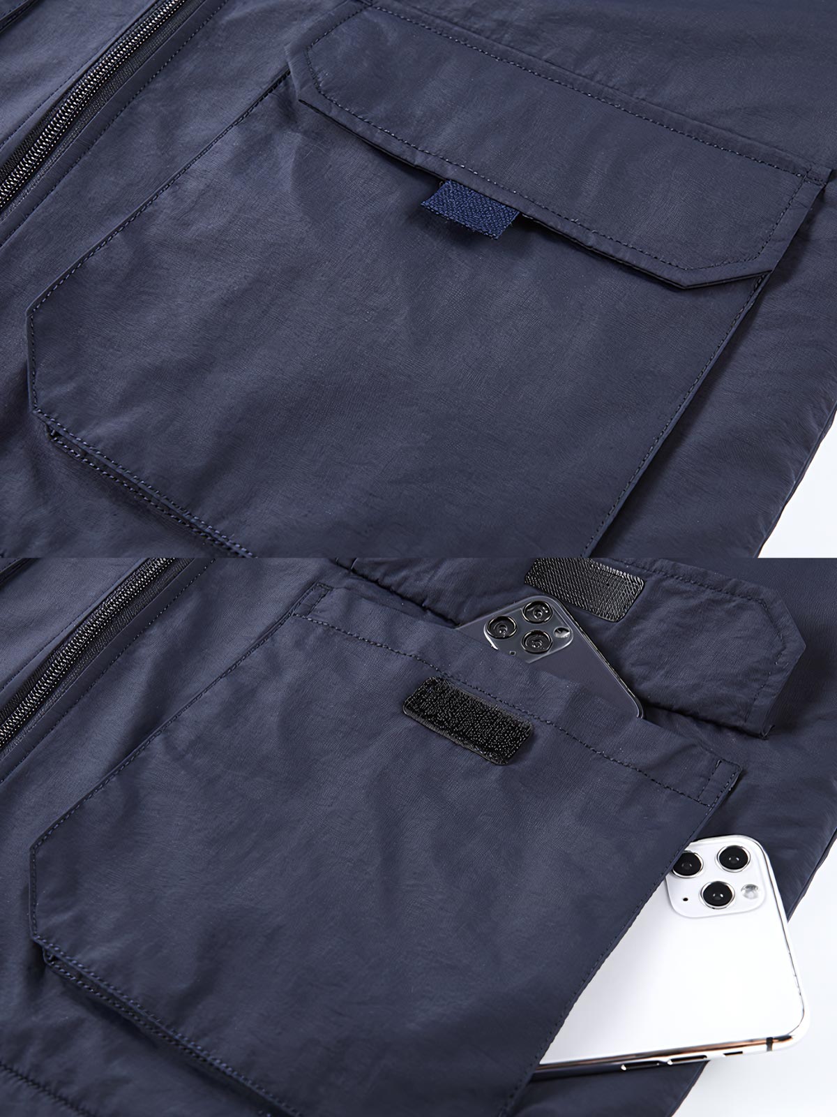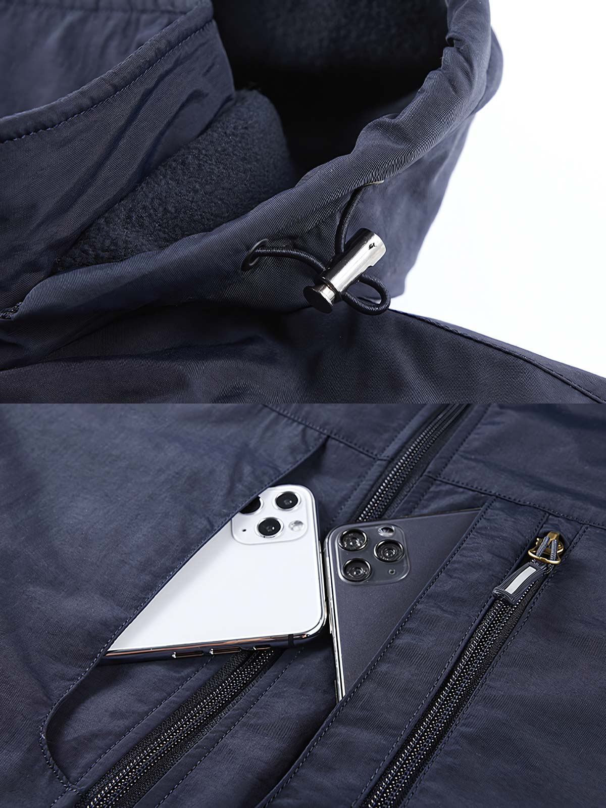 ジャケットには、風を防ぐ外層素材を使用し、内部には保温層を追加しています。これにより防風効果が高まりつつ、軽さも保持されています。多くのポケットは、様々な小物を持ち運ぶのに便利で、実用性を提供します。