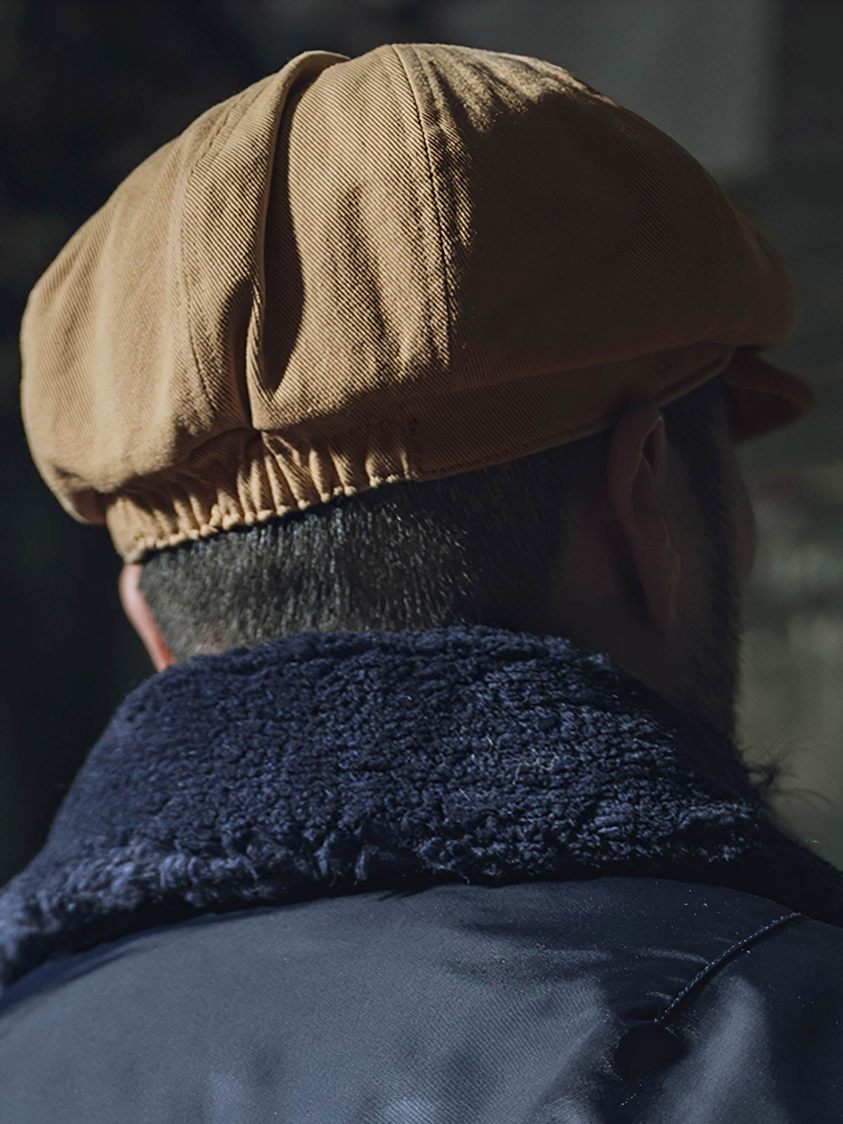 このキャップは、10ozのカーキツイル生地を使用し、ブリムにはライトブラウンのコーデュロイを採用しています。硬めのブリムを内蔵し、全体の構造を強化しています。キャップは後ろに引っ張ってバッジを見せることも、前に下ろしてバッジを隠すこともでき、バイカーキャップとしても、アーティストキャップとしても着用可能です。後部にはエラスティックバンドが付いており、風によって飛ばされるのを防ぎます。バッジは低彩度のオレンジ色で、ミリタリーやバイカースタイルにマッチし、さまざまなスタイルに合わせやすいです。コントラストの効いた配色は調和が取れており、クラシックでレトロなデザインがファッション性と実用性を兼ね備えています。