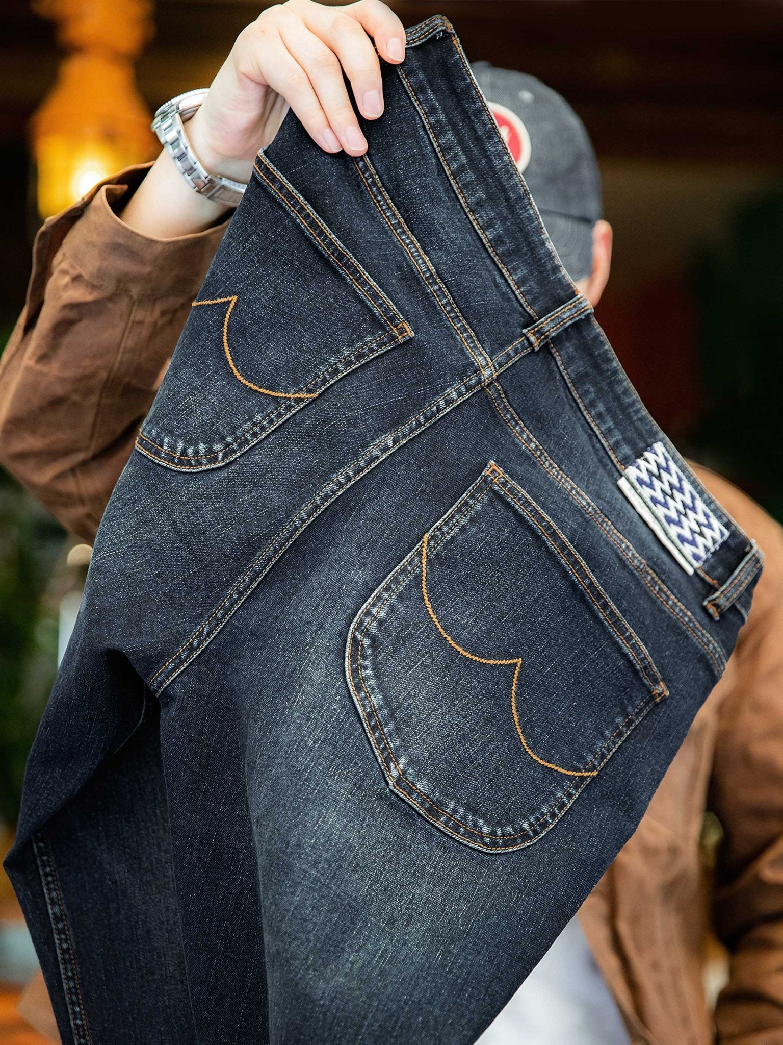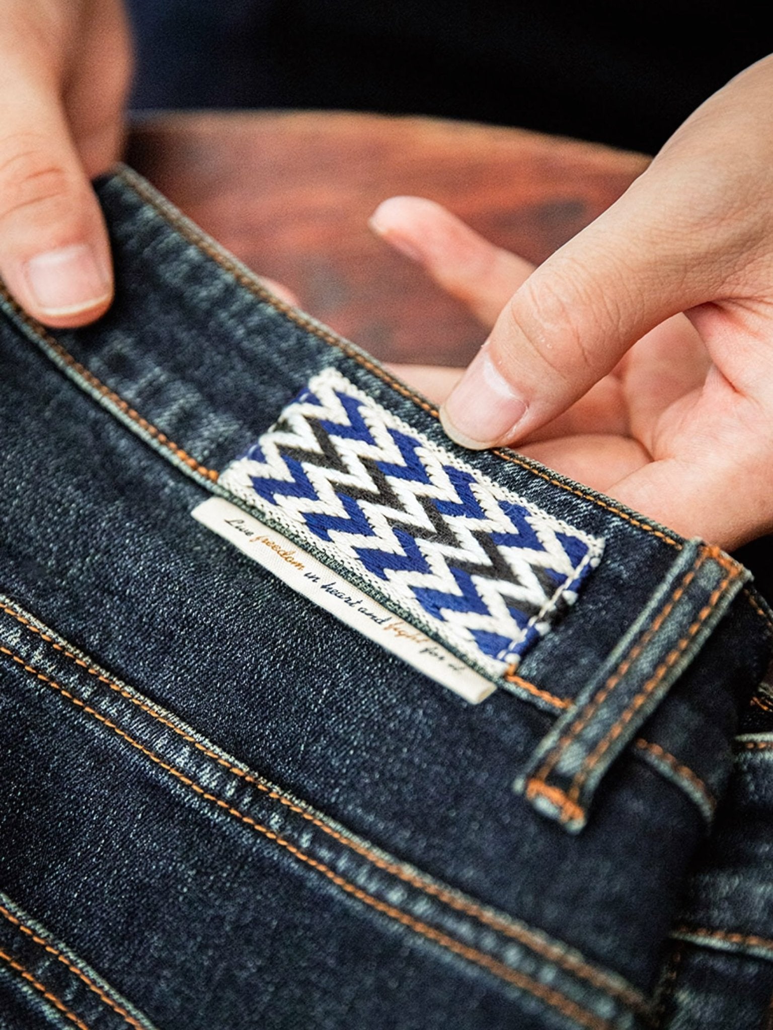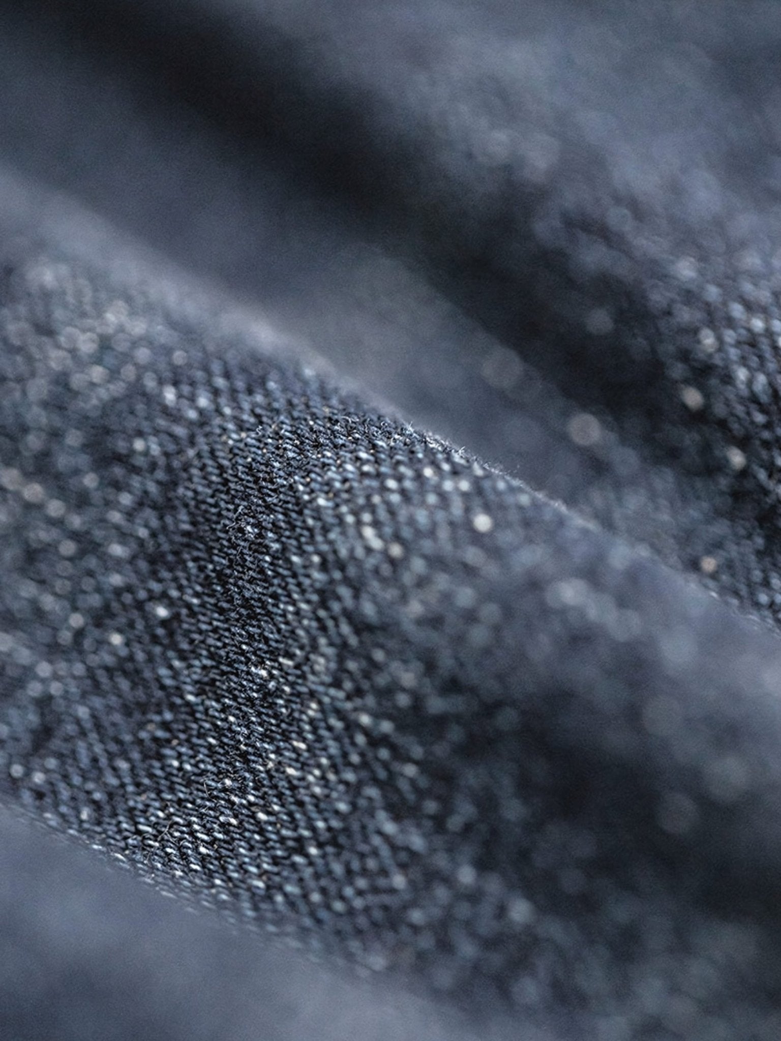 このアイテムは、独特の凹凸感を持つ11.5オンスの赤耳デニムを使用しています。縦糸と横糸に太いムラのある糸を用い、旧型の力織機とシャトル織機で織り上げました。セルビッチデニムの縁に特有のパターンが現れ、そのデザインはユニークで特徴的です。