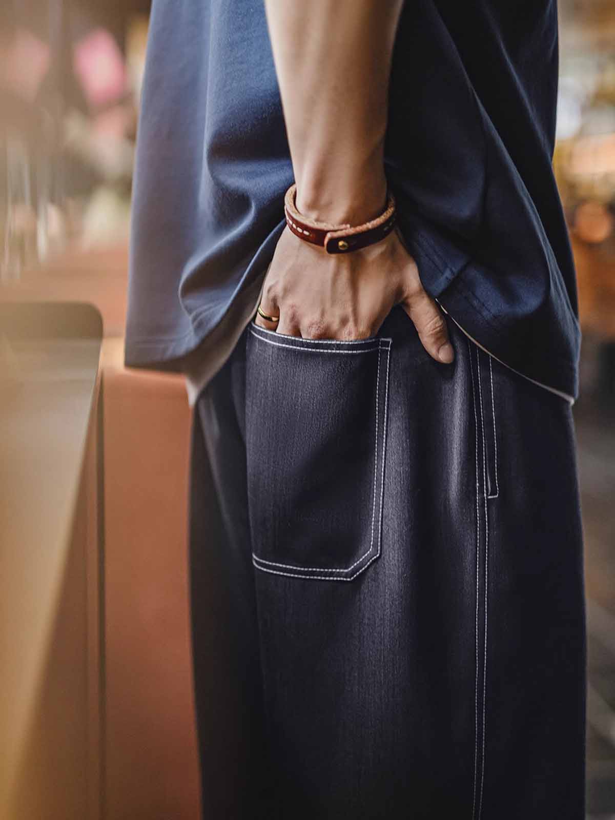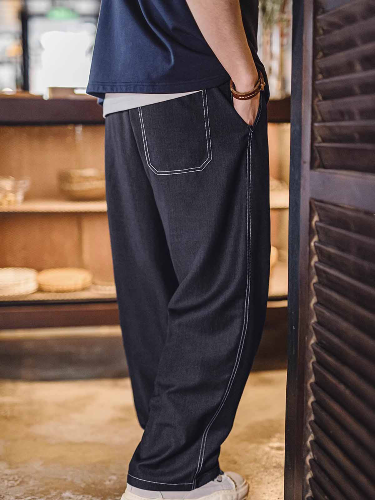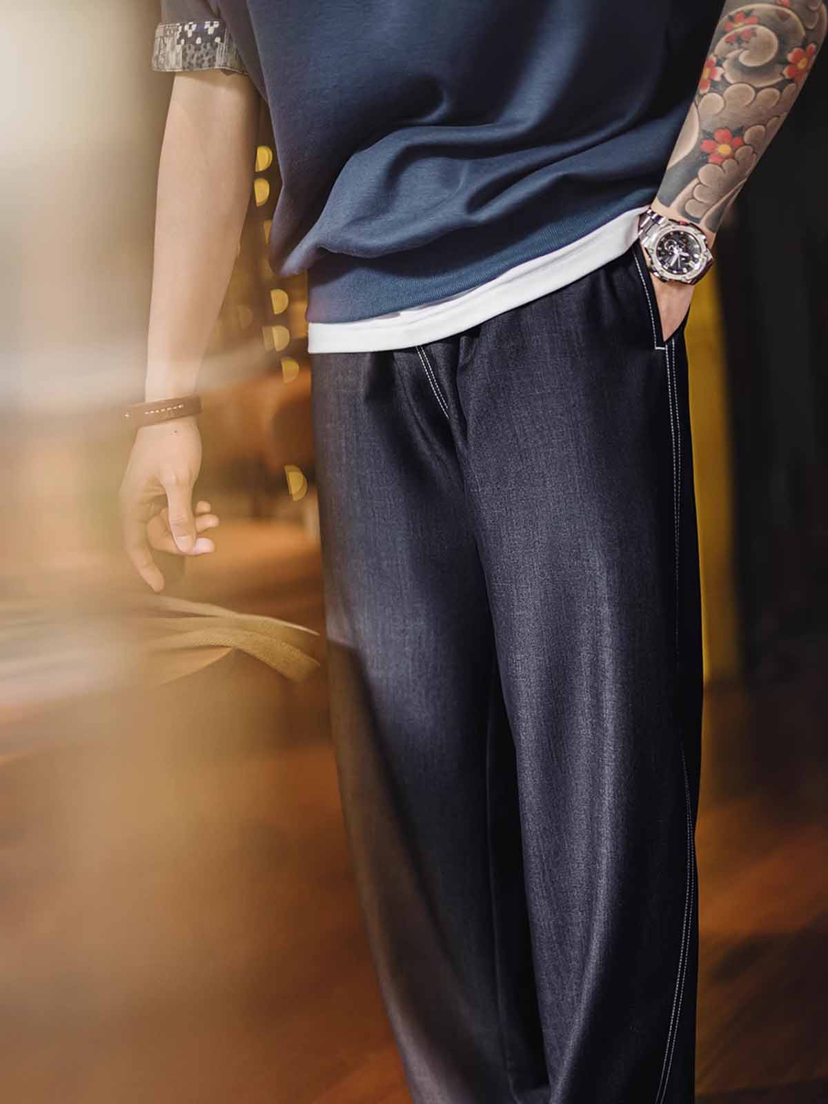 オールシーズン快適、優れたドレープ性と通気性を兼ね備えたスタイリッシュなデニムパンツ。