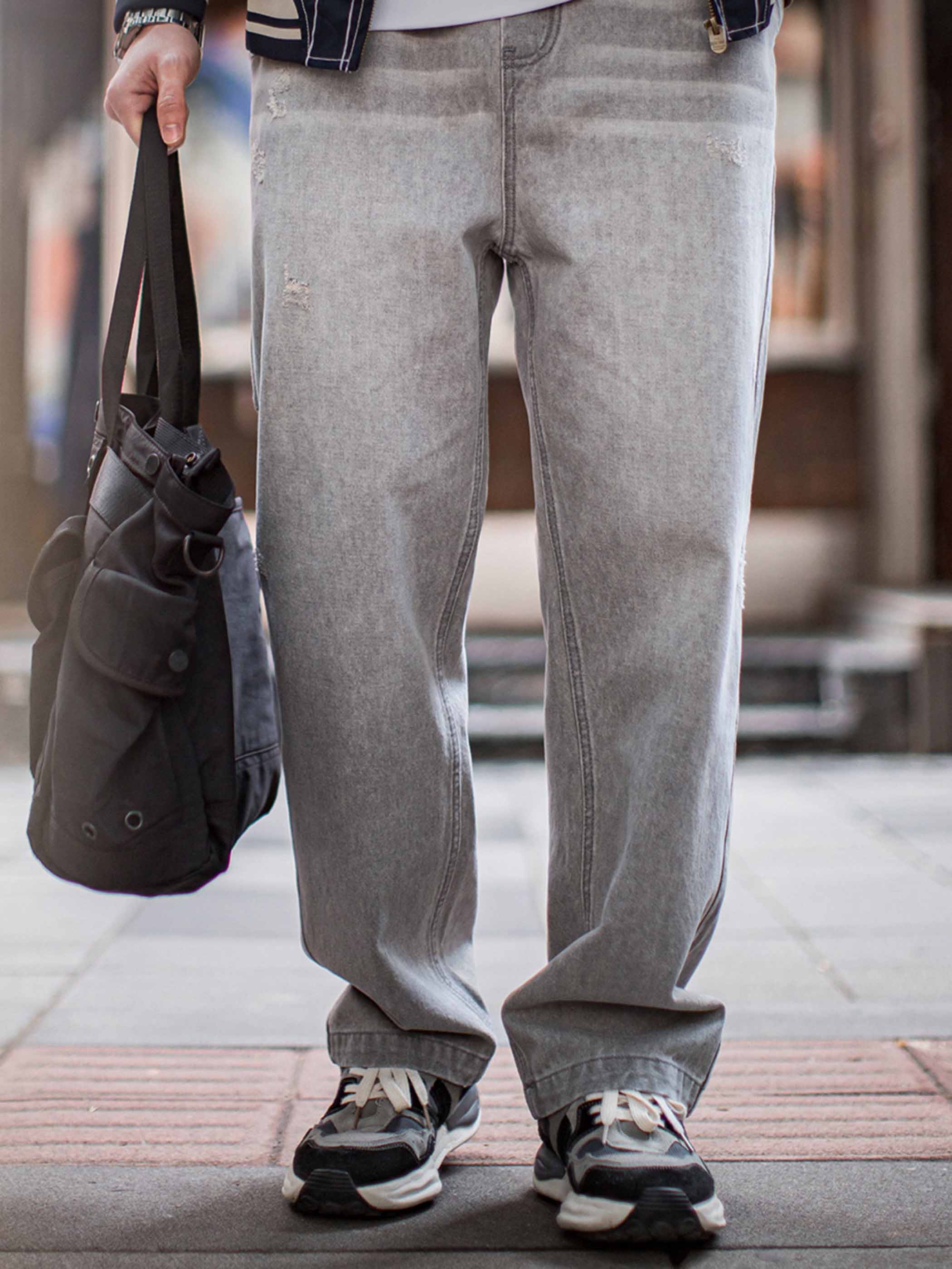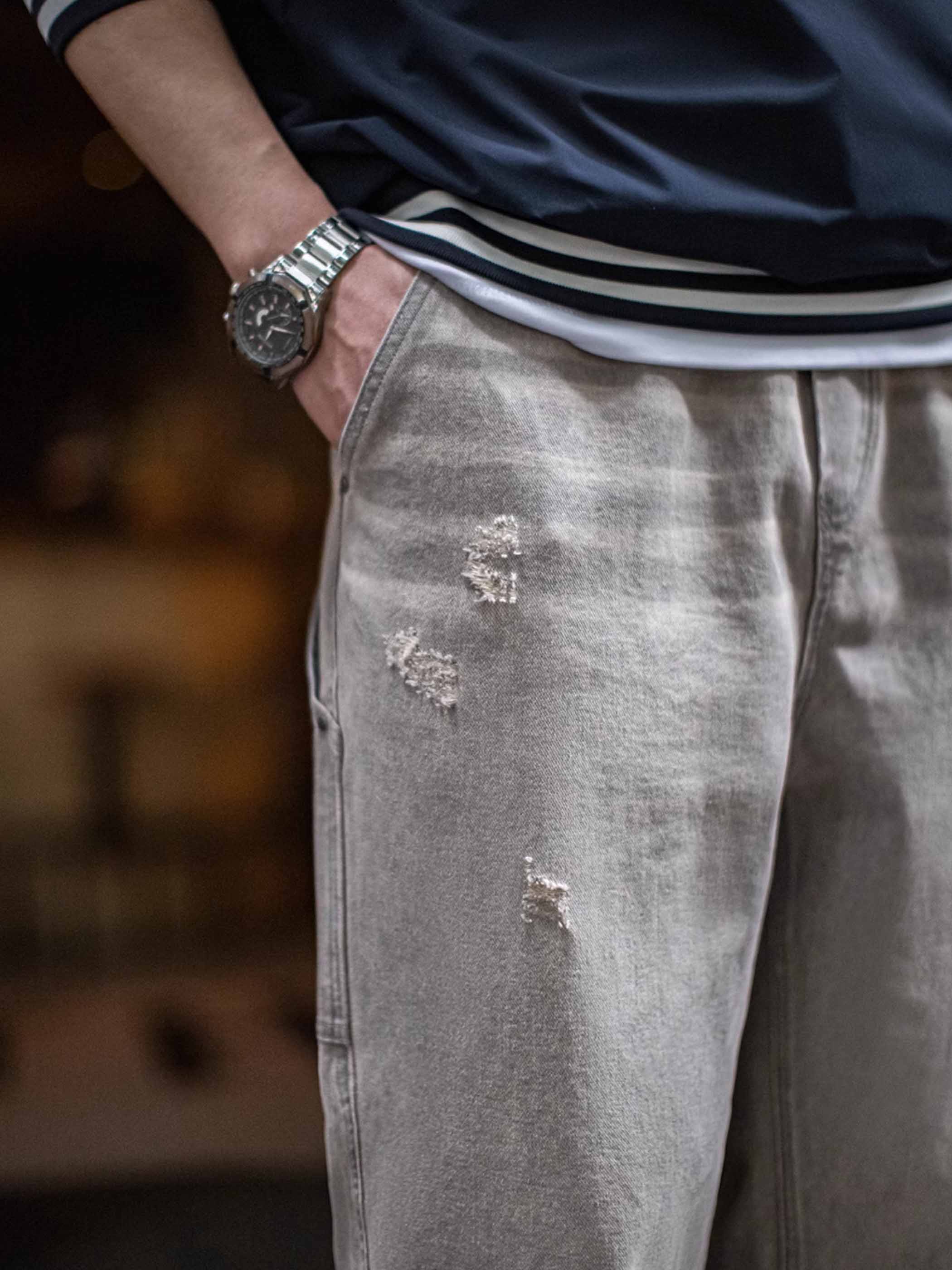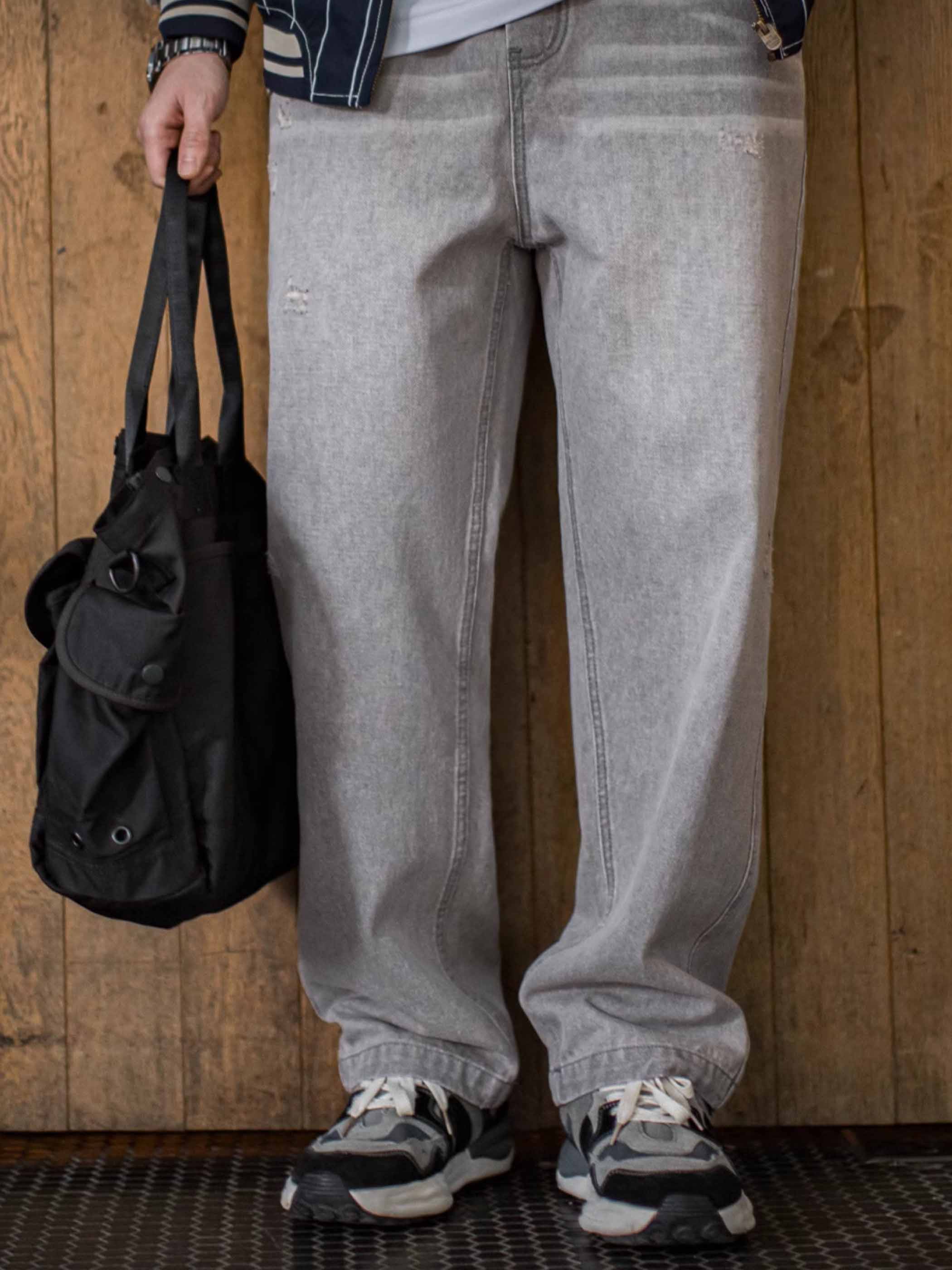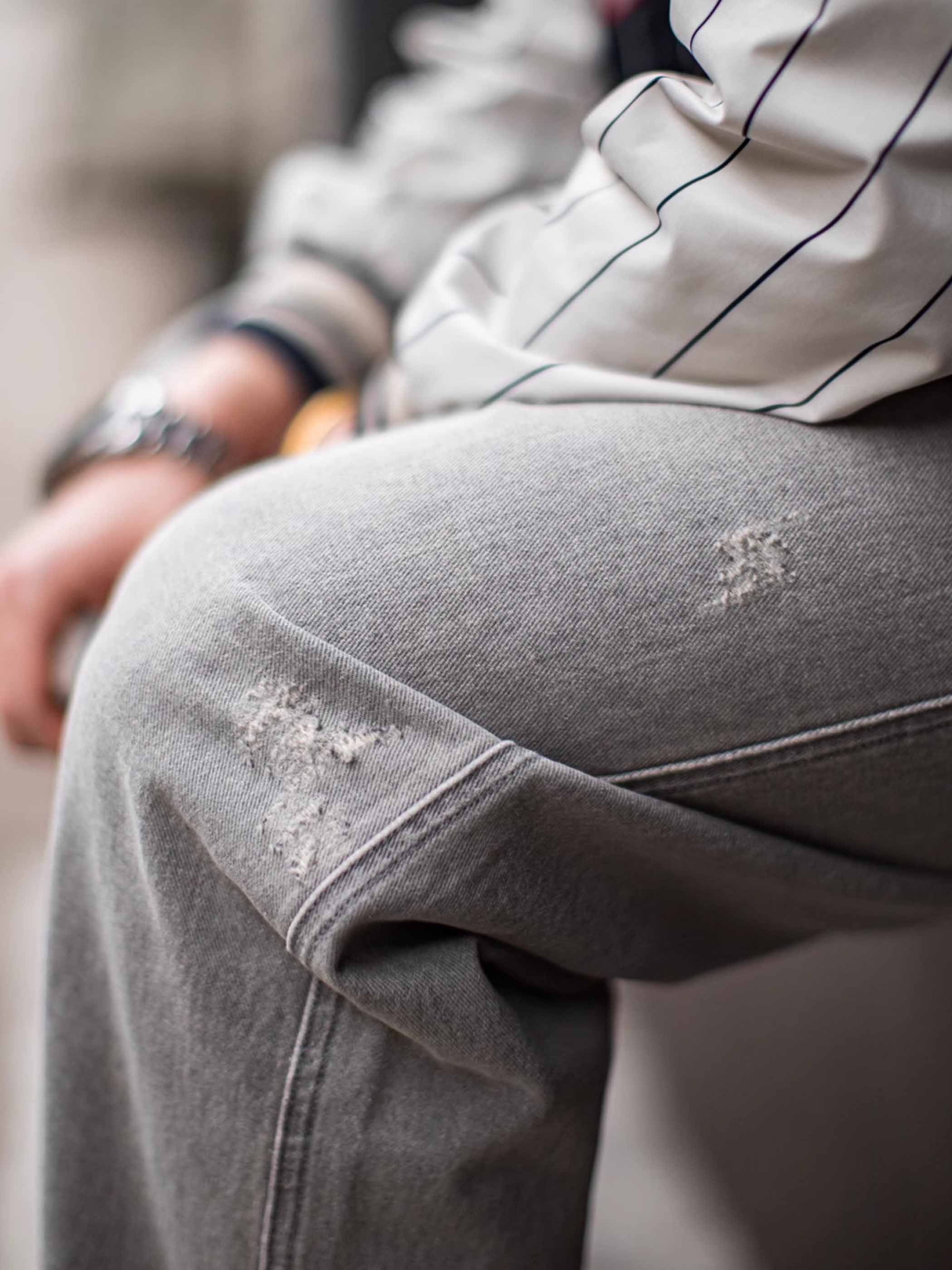 1990年代ニューヨークのアンダーグラウンドカルチャーから着想を得た、ストリート感覚を昇華した直筒デニム。従来の青・黒を超える スモーキーグレー を基調に、職人による多重加工(破れ・猫ひげ・エッジ摩耗)で「10年愛用したような味わい」を再現。393g/㎡の厚手生地が崩れないシルエットを保ちながら、ロールアップ着用でも洗練された粗さを表現します。