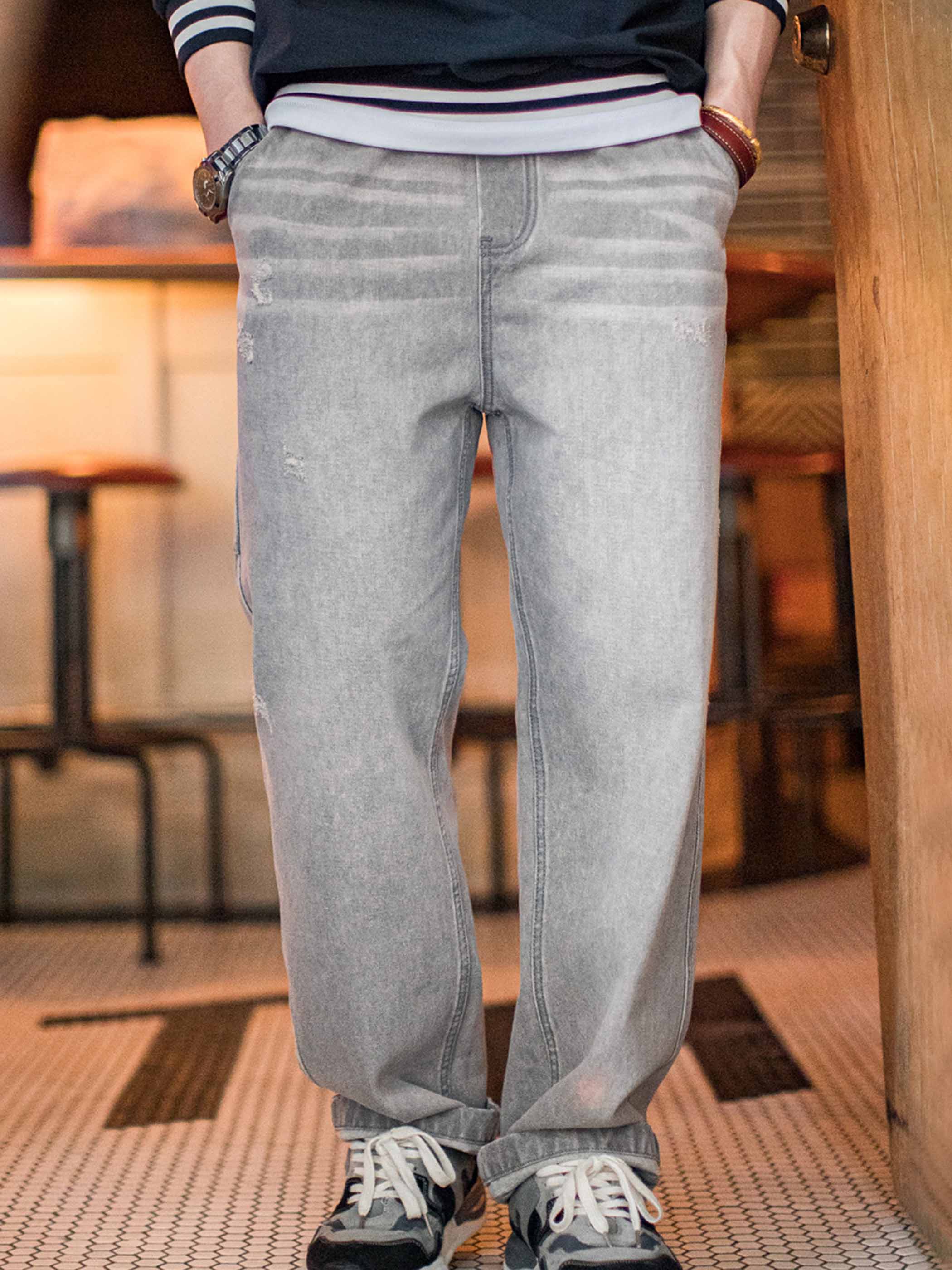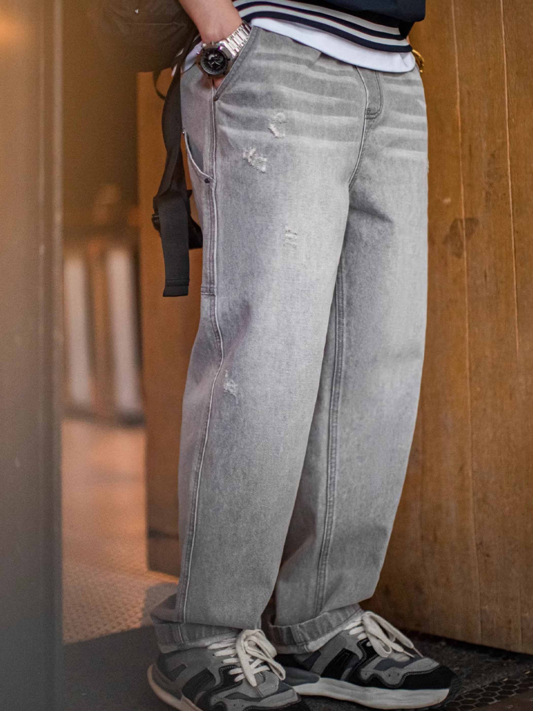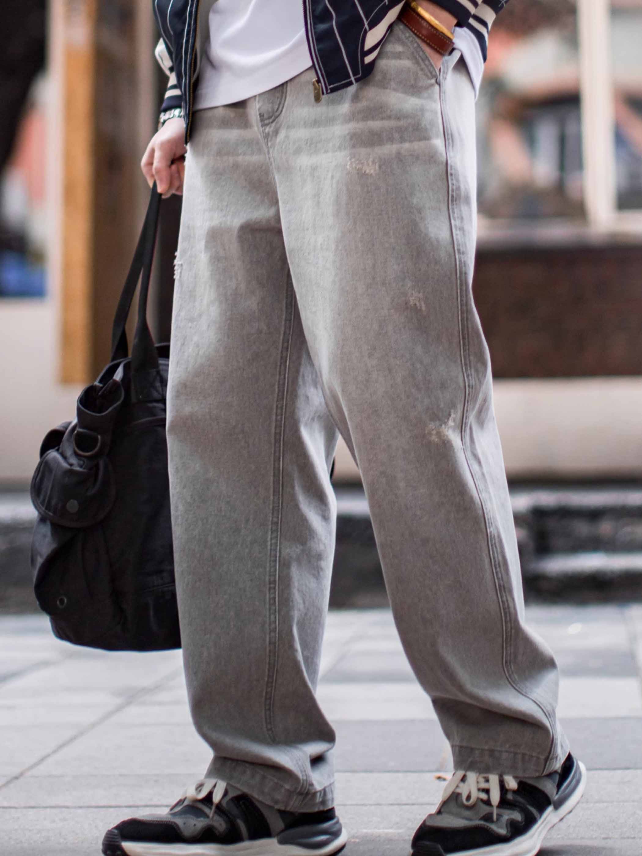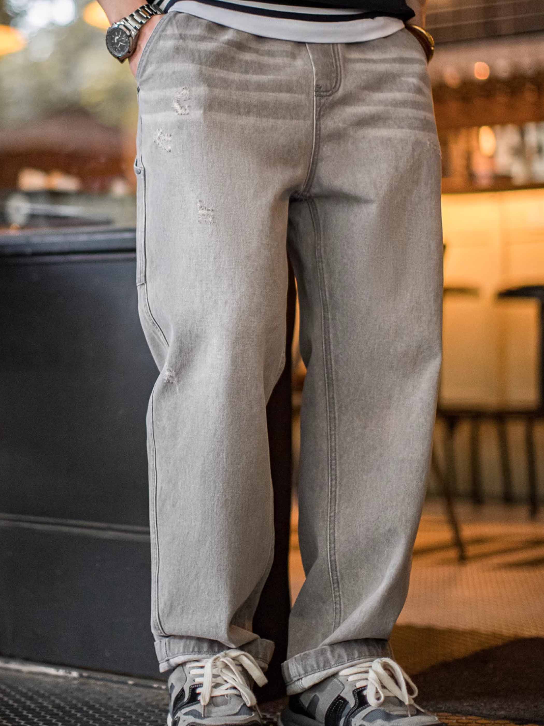 1990年代ニューヨークのアンダーグラウンドカルチャーから着想を得た、ストリート感覚を昇華した直筒デニム。従来の青・黒を超える スモーキーグレー を基調に、職人による多重加工(破れ・猫ひげ・エッジ摩耗)で「10年愛用したような味わい」を再現。393g/㎡の厚手生地が崩れないシルエットを保ちながら、ロールアップ着用でも洗練された粗さを表現します。
