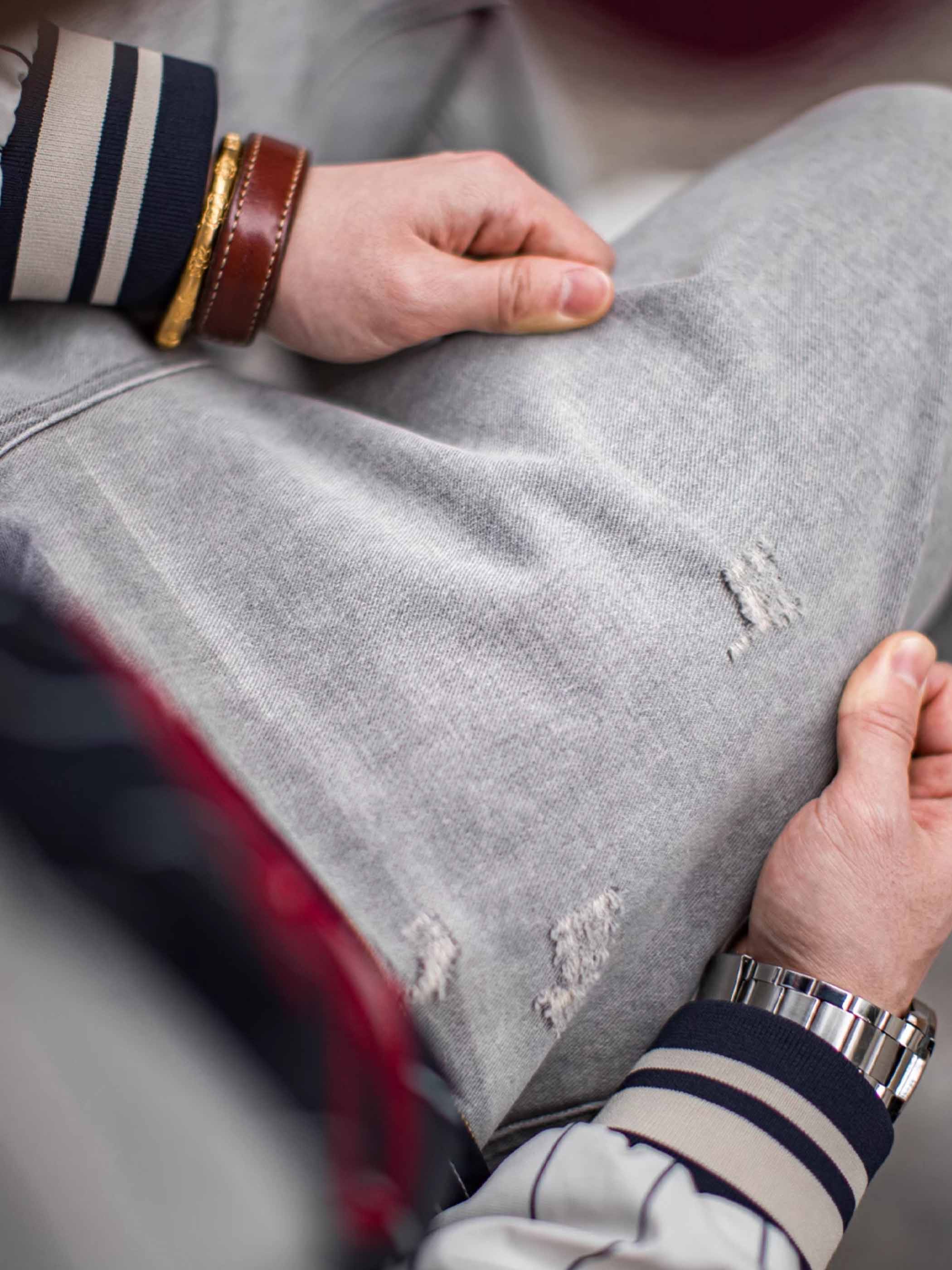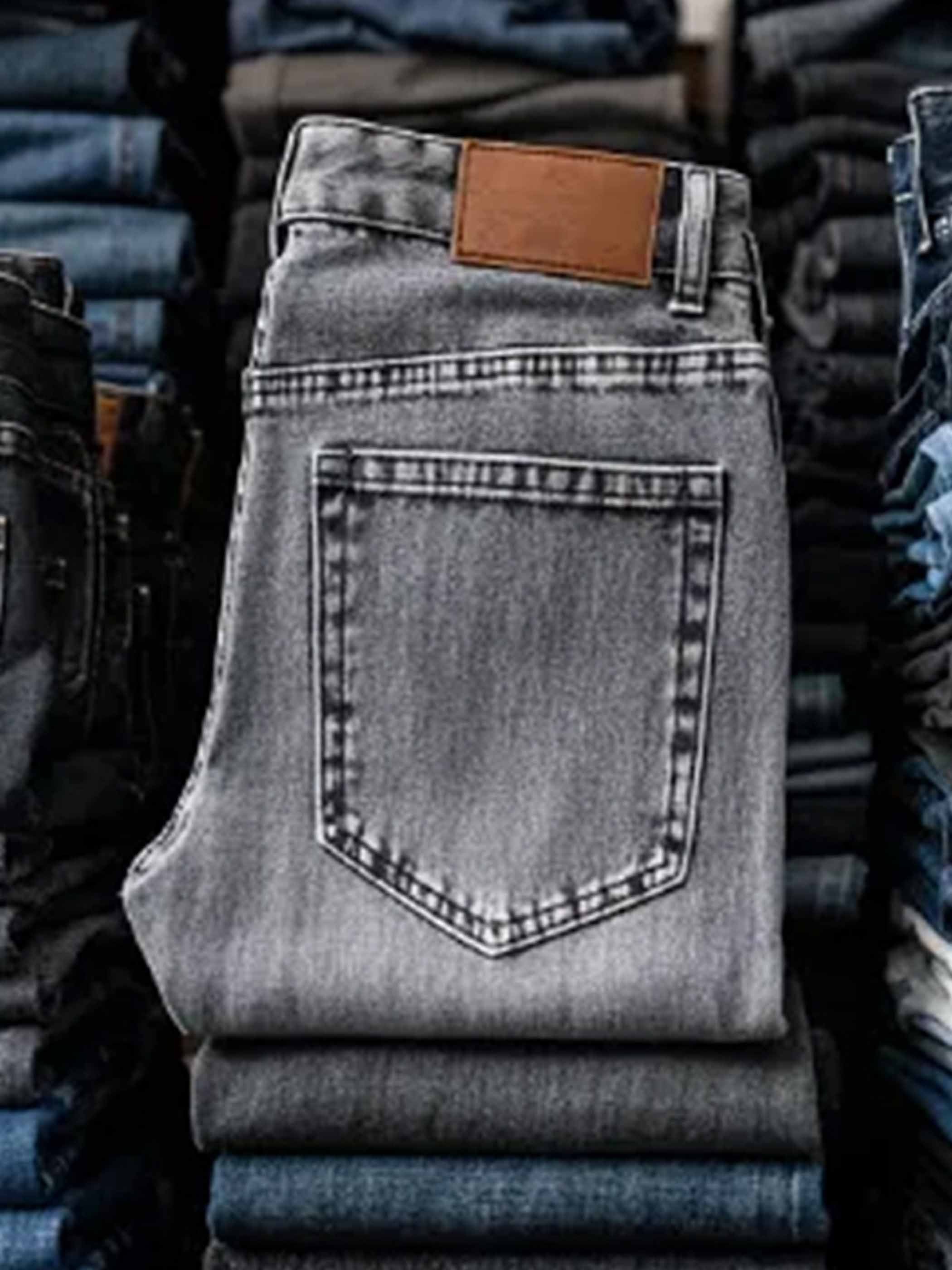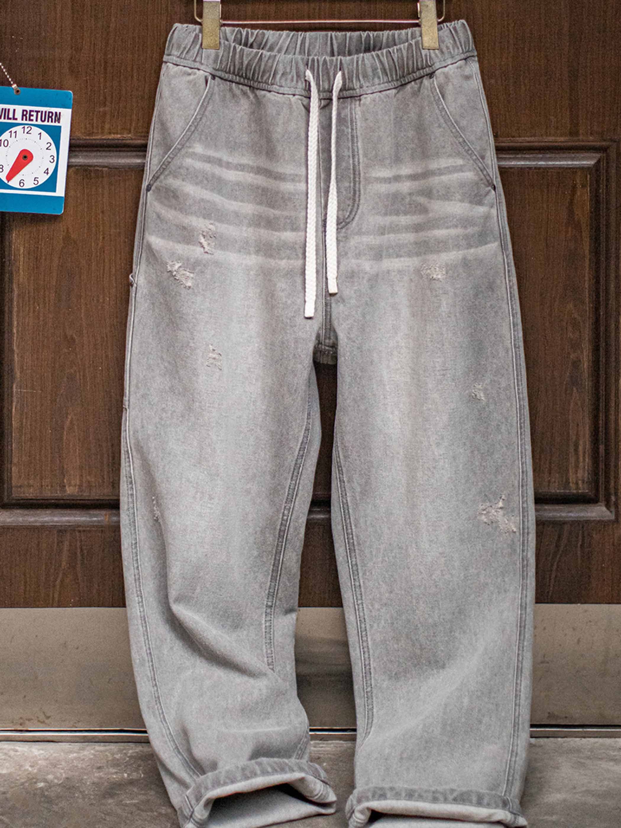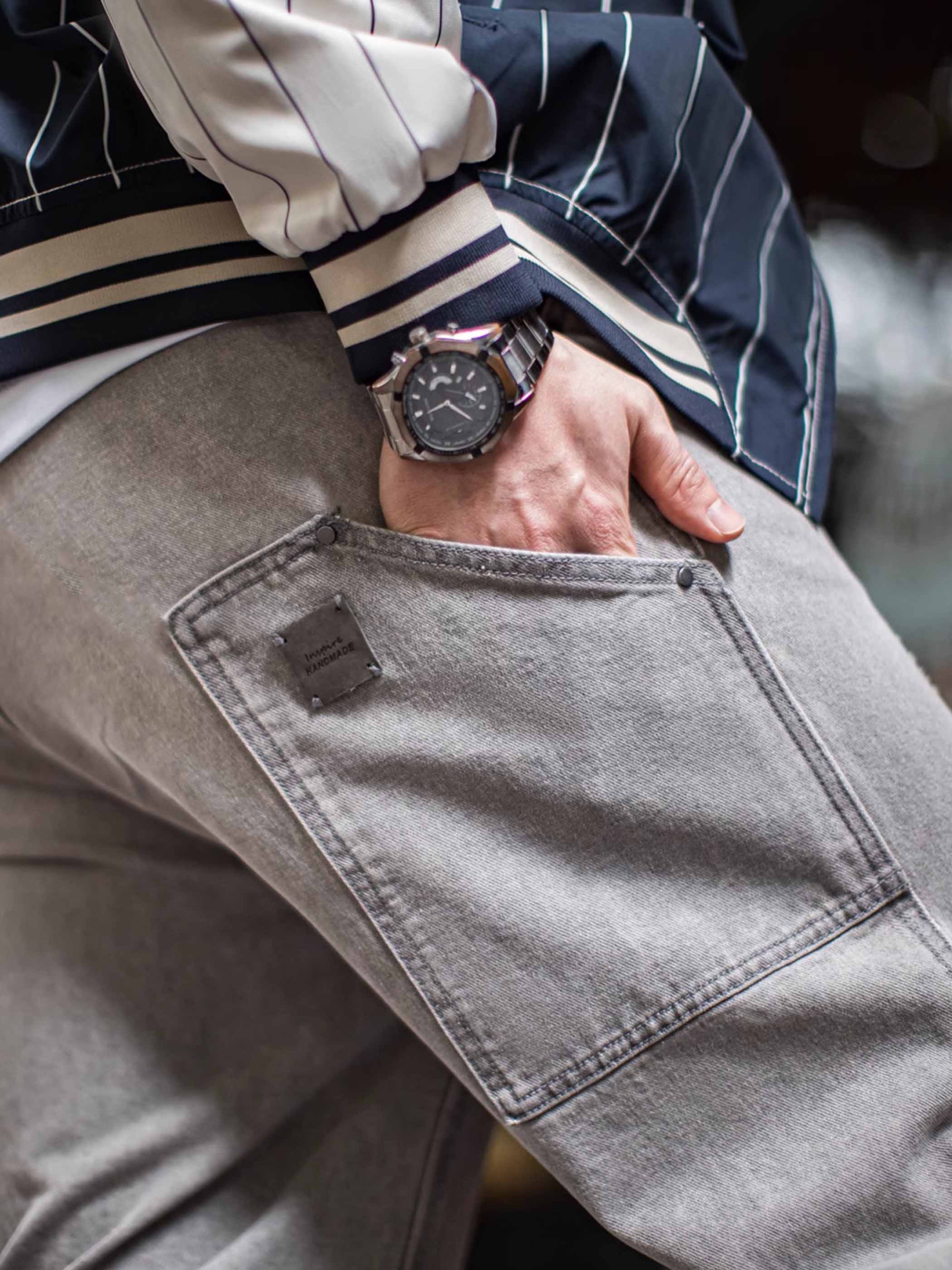 1990年代ニューヨークのアンダーグラウンドカルチャーから着想を得た、ストリート感覚を昇華した直筒デニム。従来の青・黒を超える スモーキーグレー を基調に、職人による多重加工(破れ・猫ひげ・エッジ摩耗)で「10年愛用したような味わい」を再現。393g/㎡の厚手生地が崩れないシルエットを保ちながら、ロールアップ着用でも洗練された粗さを表現します。