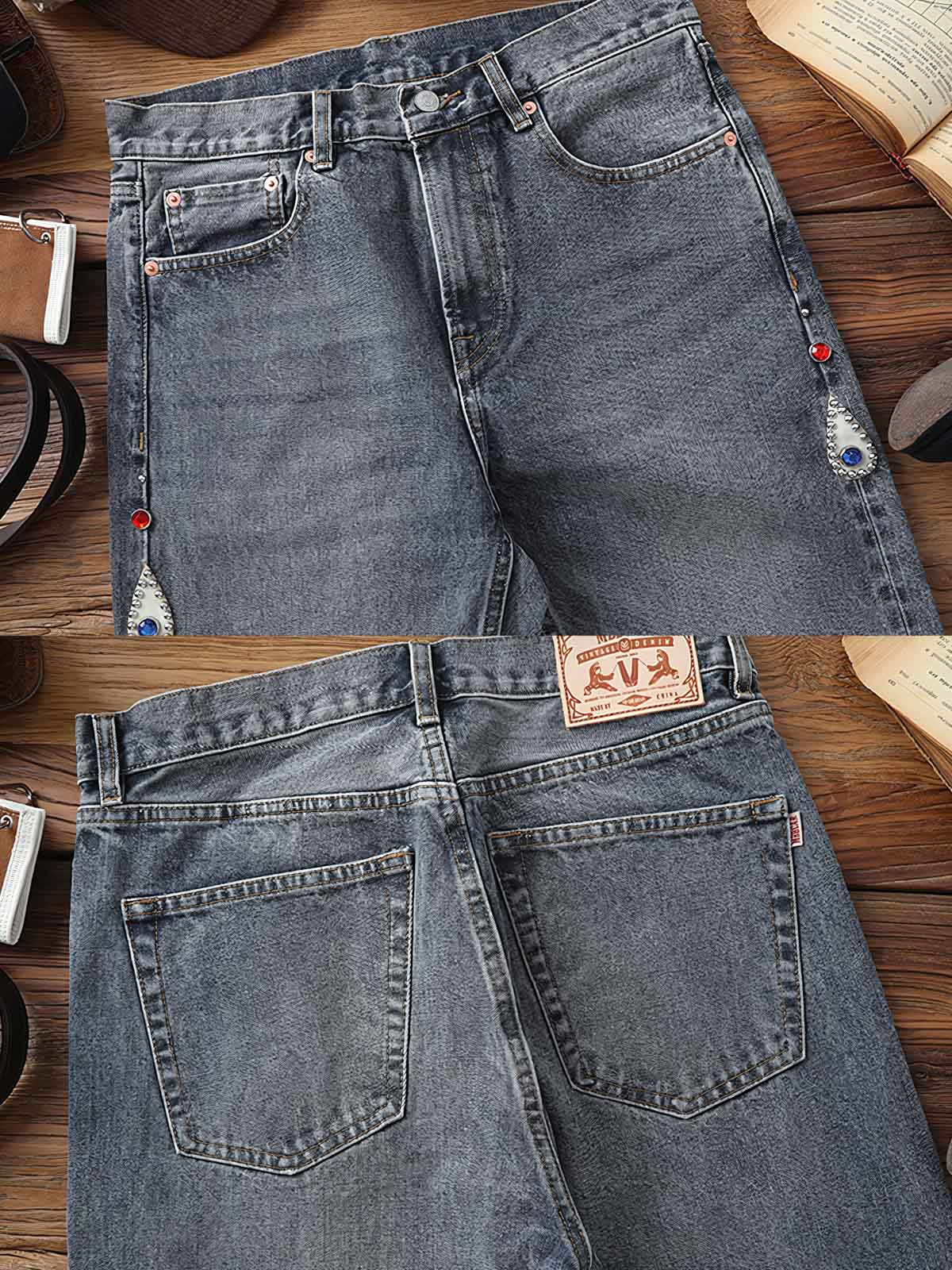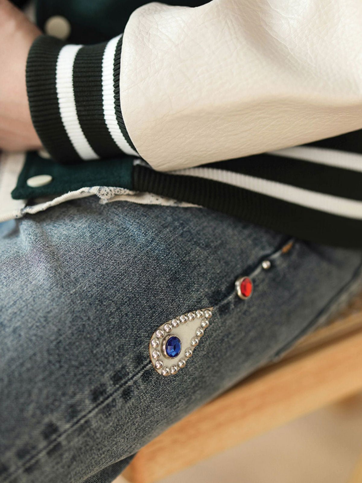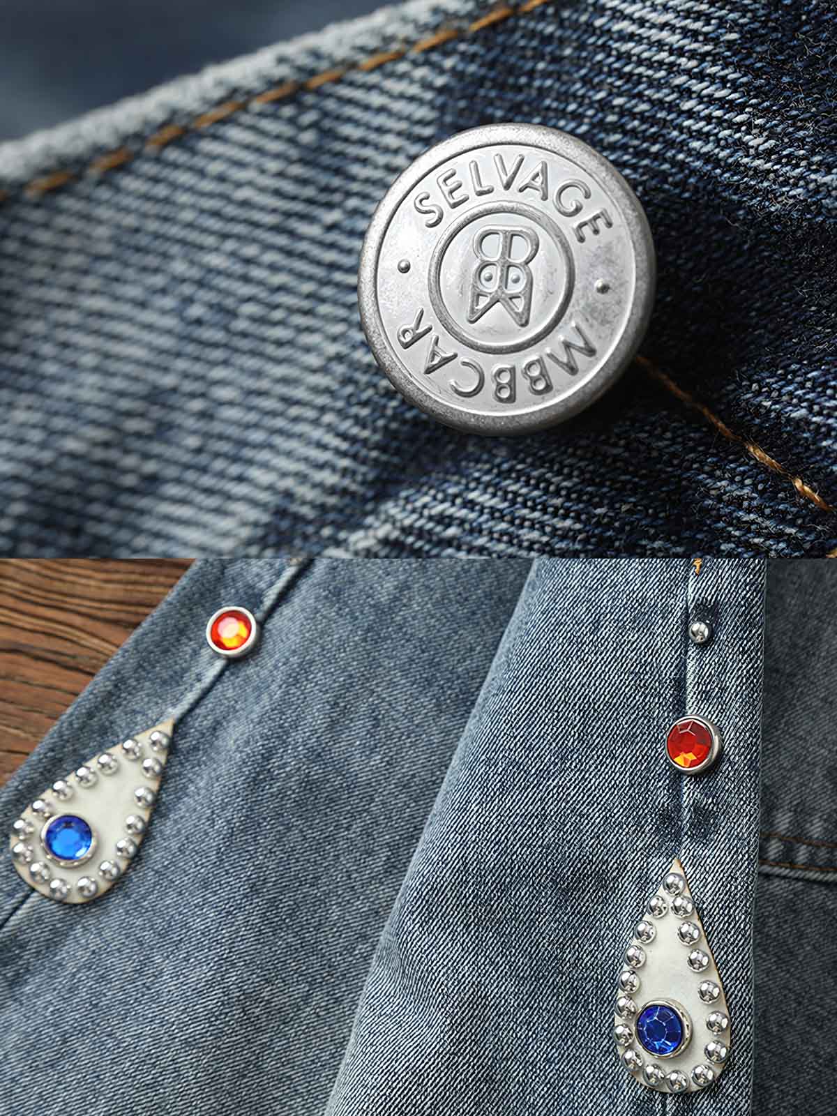 全体のデザインはライトブルーの色合いで、竹の節のようなテクスチャーと組み合わせられており、四季を通して着用に適しています。サイドシームのダイヤモンドとスタッズのデザインは大胆で、抑えがたいロックスピリットを表現しています。これらの精巧なディテールは、デニムパンツに装飾性を加えるだけでなく、60年代のロック文化への敬意と回想を体現しています。