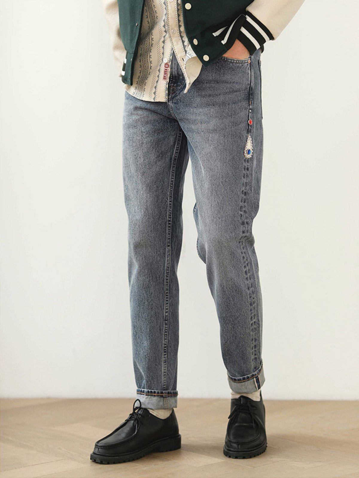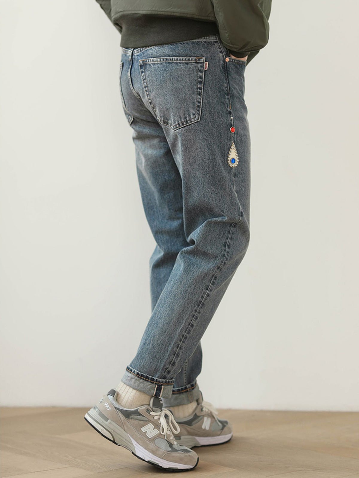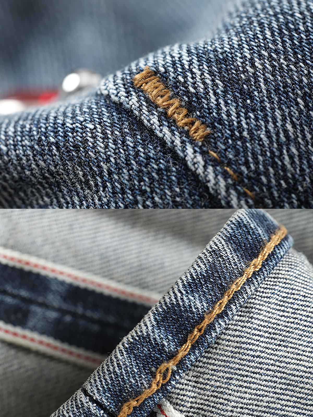 デニムパンツは、14.4オンスのヴィンテージ織り機で作られたセルビッチ生地(100%コットン)で作られており、着心地の良さと素材の耐久性を確保しています。ウォッシュ加工による重厚感と、ほのかに見える竹の節のようなテクスチャーが、デニムパンツにレトロな感触と視覚効果を加えています。