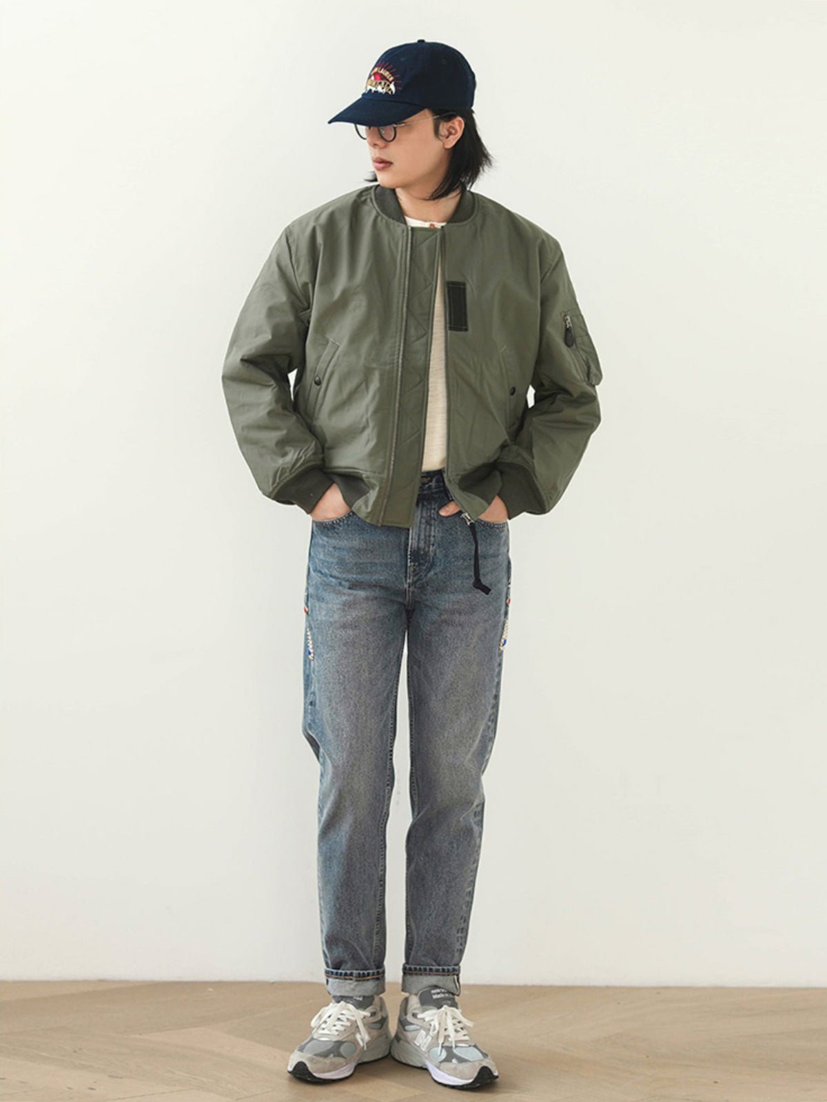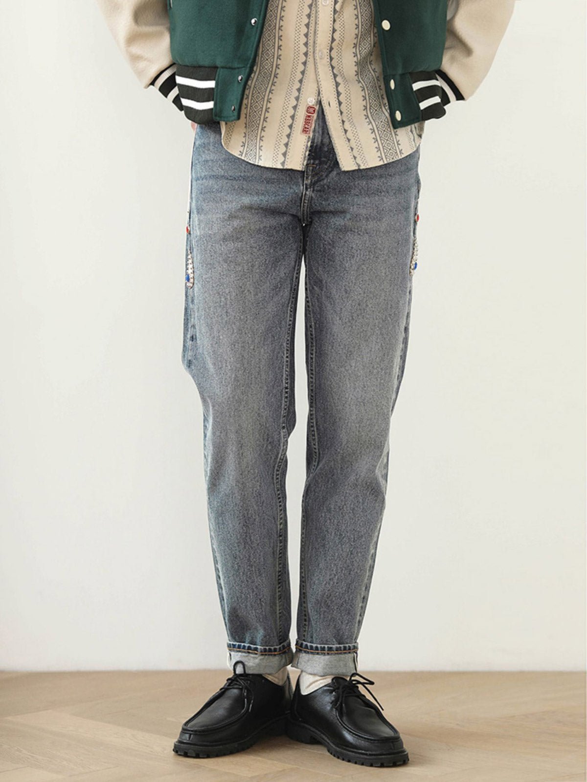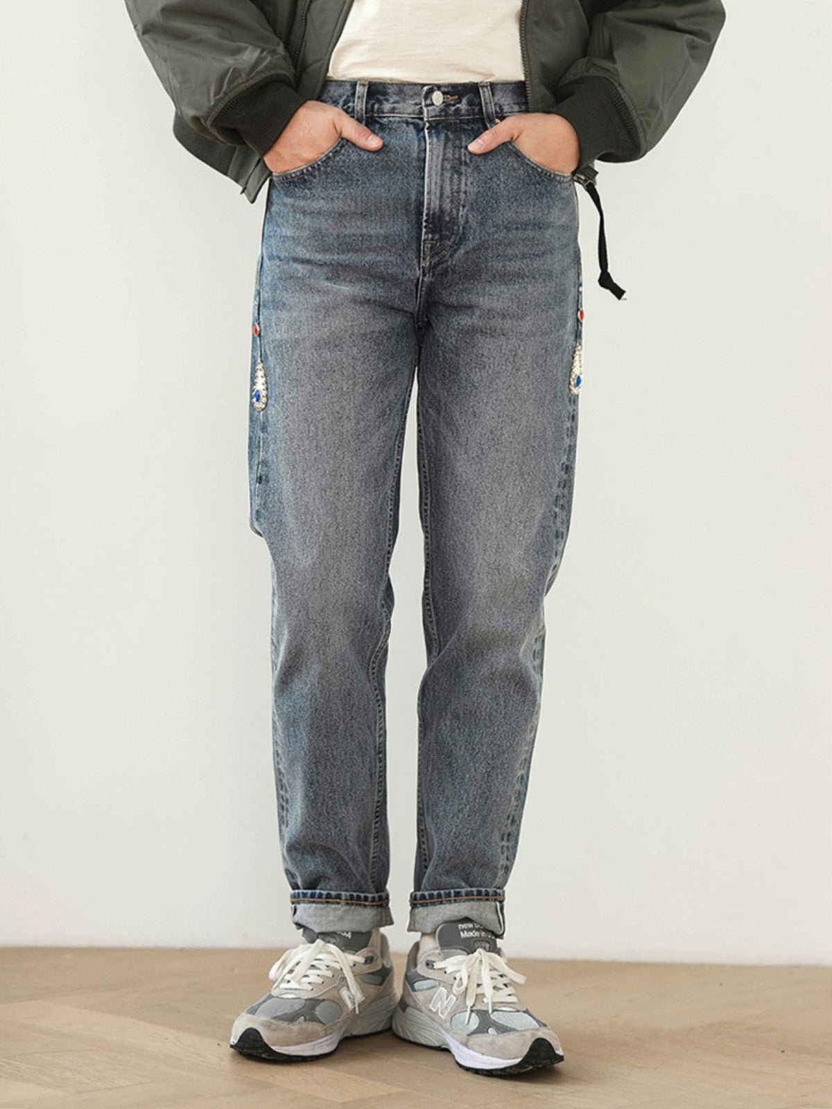 デニムパンツは、14.4オンスのヴィンテージ織り機で作られたセルビッチ生地(100%コットン)で作られており、着心地の良さと素材の耐久性を確保しています。ウォッシュ加工による重厚感と、ほのかに見える竹の節のようなテクスチャーが、デニムパンツにレトロな感触と視覚効果を加えています。