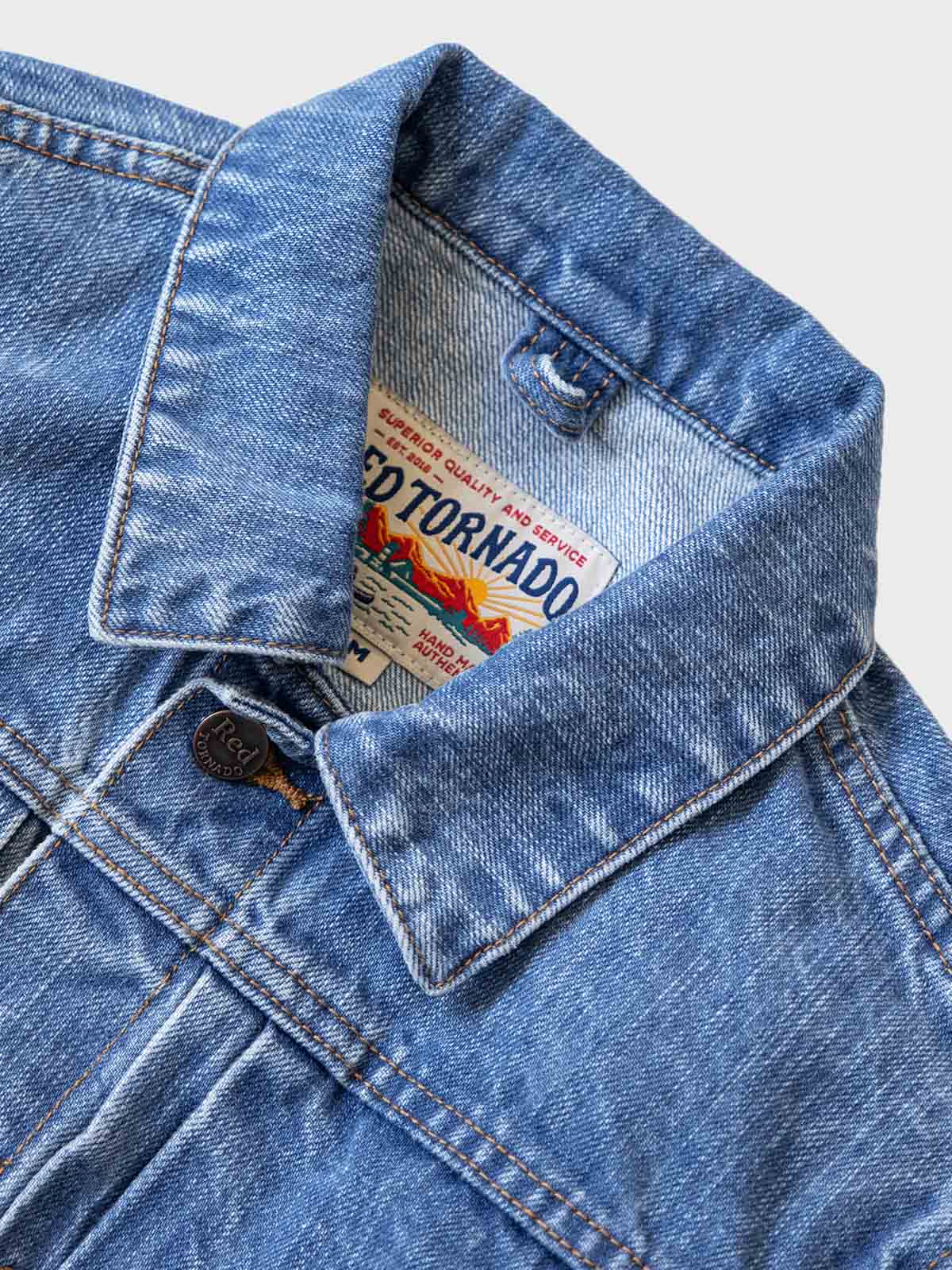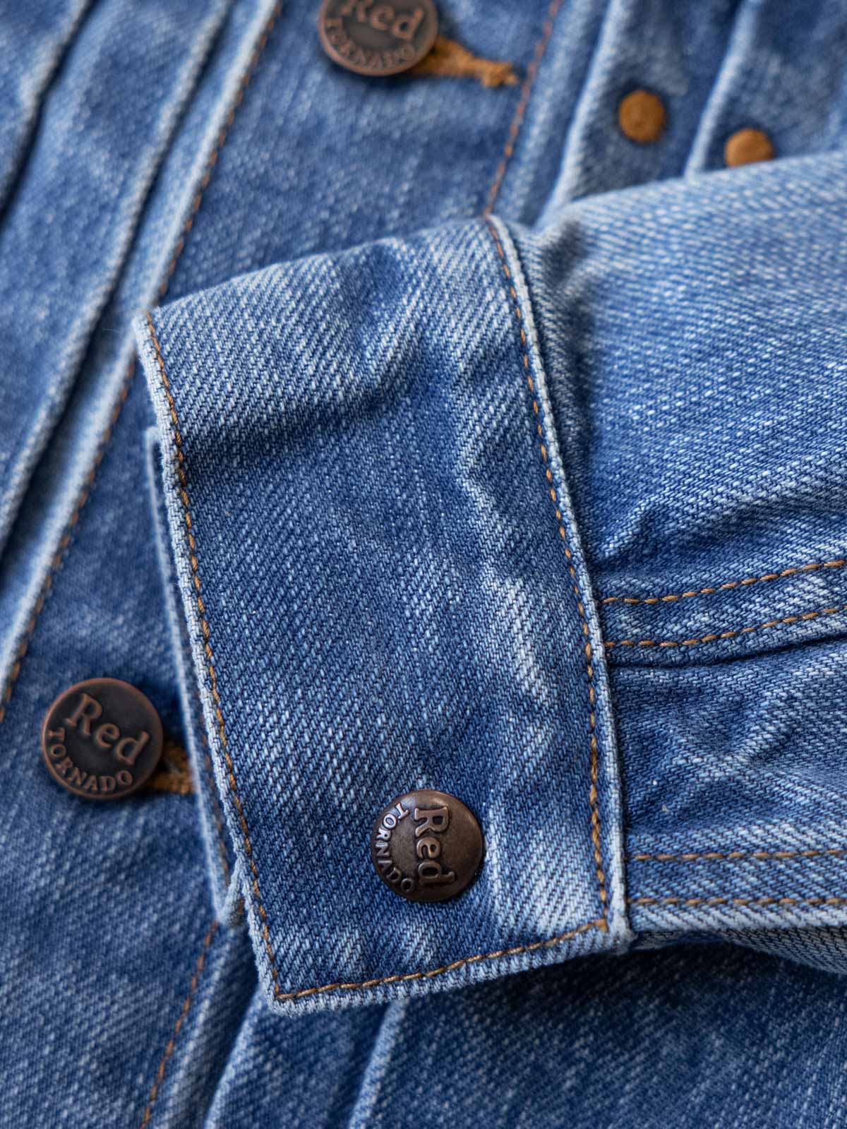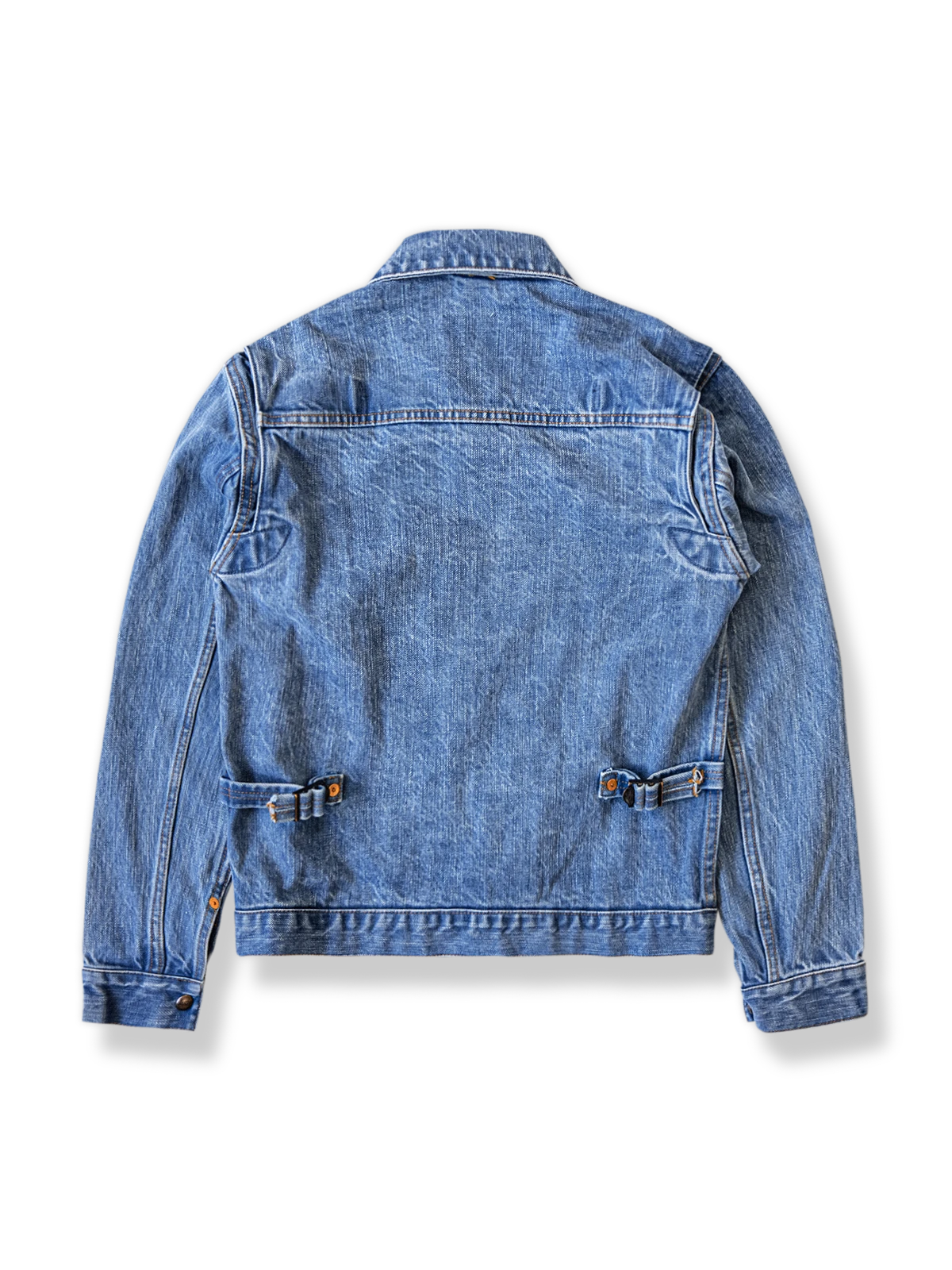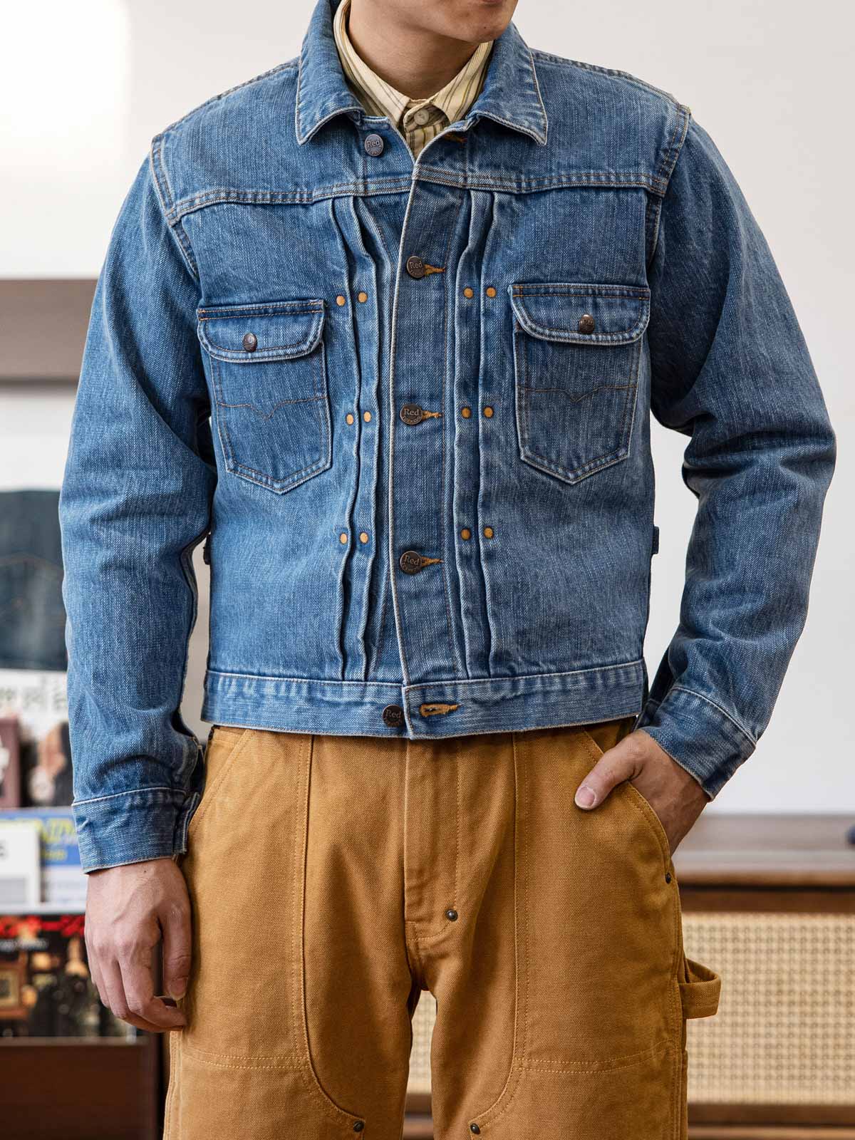 18ozのヘビーウェイトデニム生地は、ジャケットの耐久性と型保持性を強化し、繊細な縫製技術と均一な洗水効果が、古典的な工芸への敬意とディテールへのこだわりを反映しています。