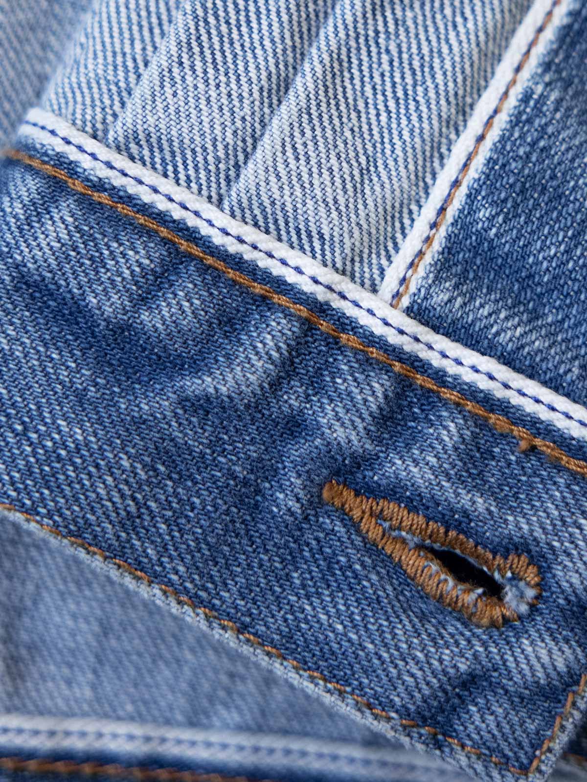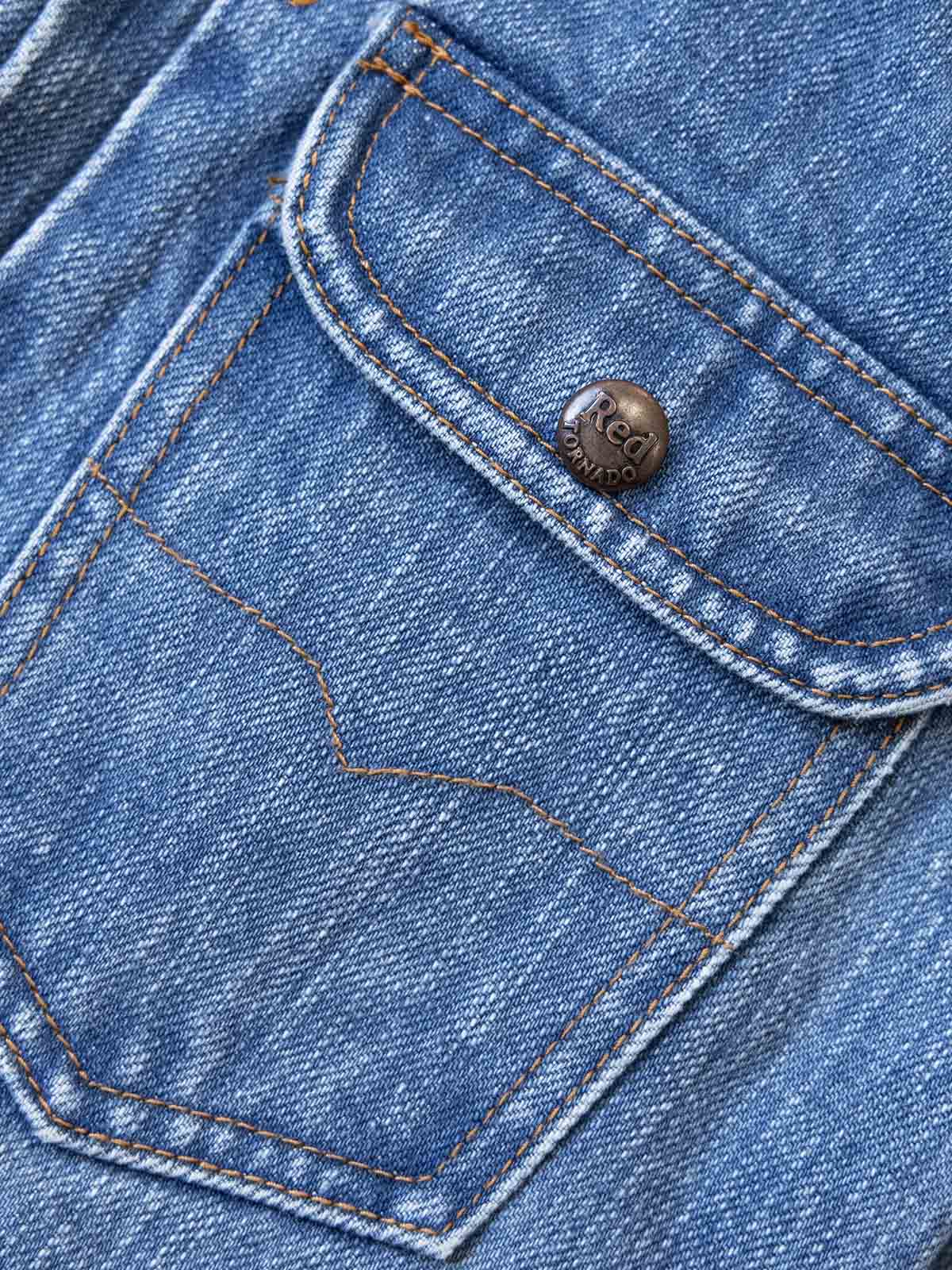 このウォッシュデニムジャケットは、18ozのヘビーウェイトデニム生地を使用し、1950年代のアメリカのクラシックなデニムファッションからインスピレーションを得ています。その時代のデニムジャケットは労働者階級とロック音楽の象徴であり、現代に至るまで進化を遂げ、洗水工程により柔らかさとレトロな着用感を実現しています。