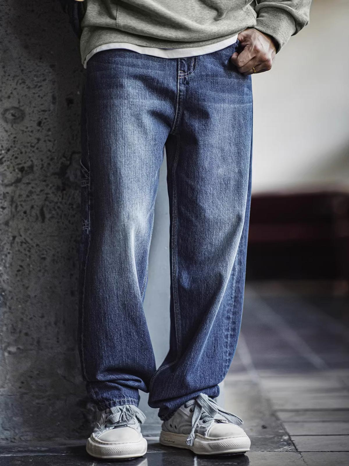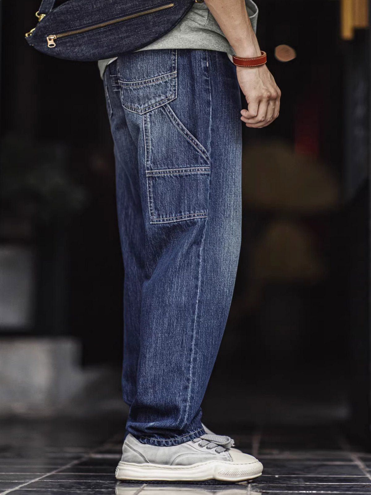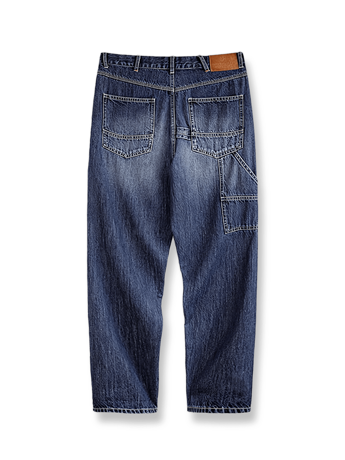 このウォッシュドデニム ロガーパンツは100%コットン素材を使用し、自然な色落ちのウォッシュドデニムで、手触りが良く、質感が優れています。ややゆったりしたフィットデザインにより、動きやすさを提供し、日常の着用に適しています。多ポケットデザインで、側面と背面にあるツールポケットが実用性を高め、クラシックなロガーパンツのスタイルを強調しています。後ろポケットの配置はクラシックなサイドポケットのスタイルを再現し、全体のヴィンテージ感を向上させています。クラシックなレザーパッチはトップグレインレザーのカスタムエンボス加工で仕上げられ、パンツの質感と高級感を高めています。シンプルなTシャツやシャツと合わせて、クラシックなカジュアルスタイルを演出します。